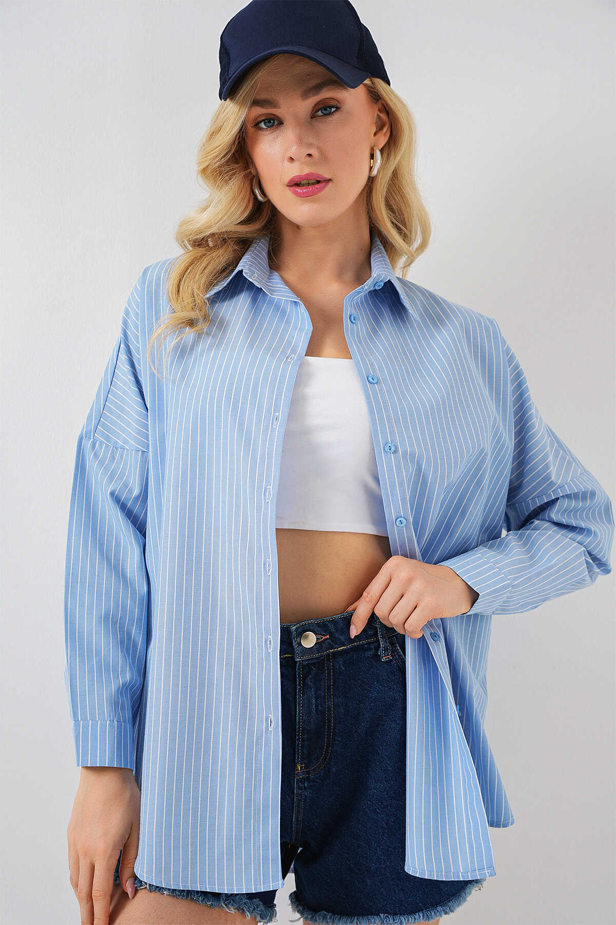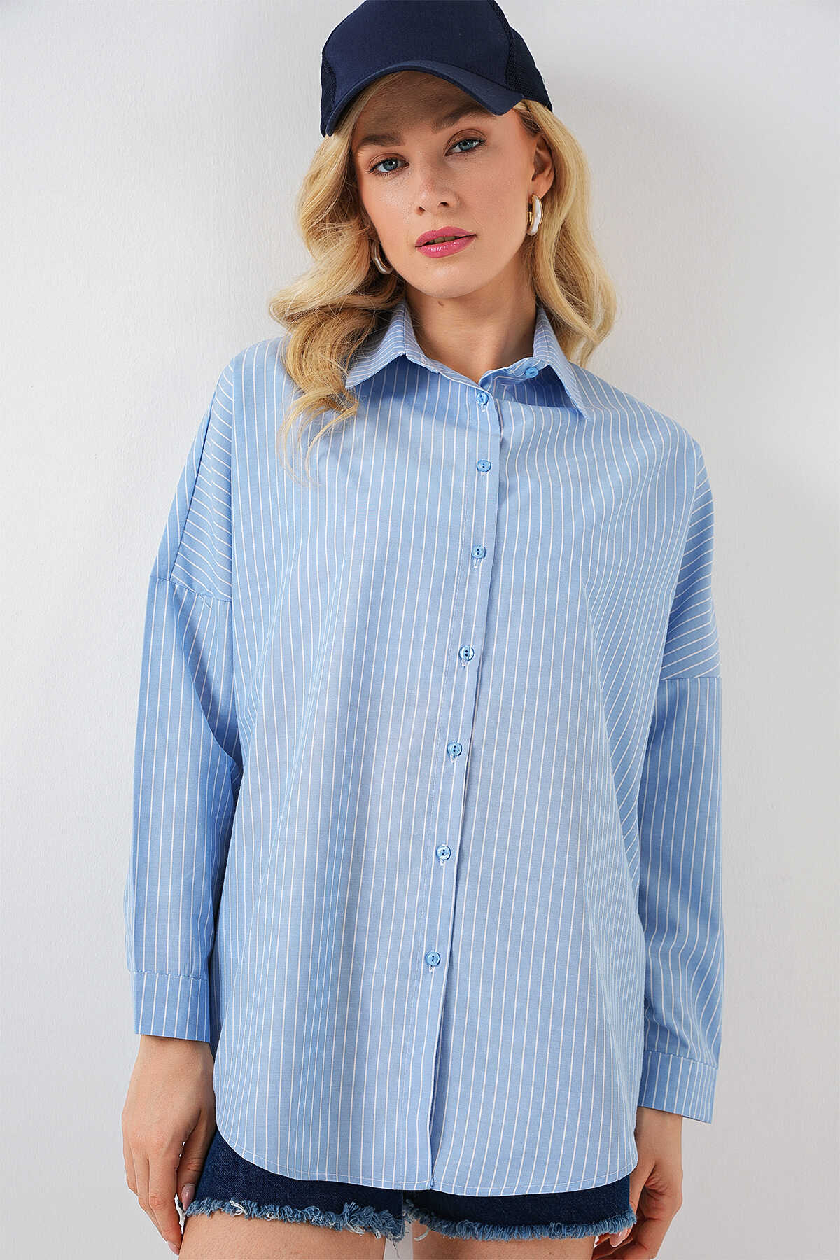 Kadın Çizgili Oversize Gömlek 20332 - C.Mavi - Kombin