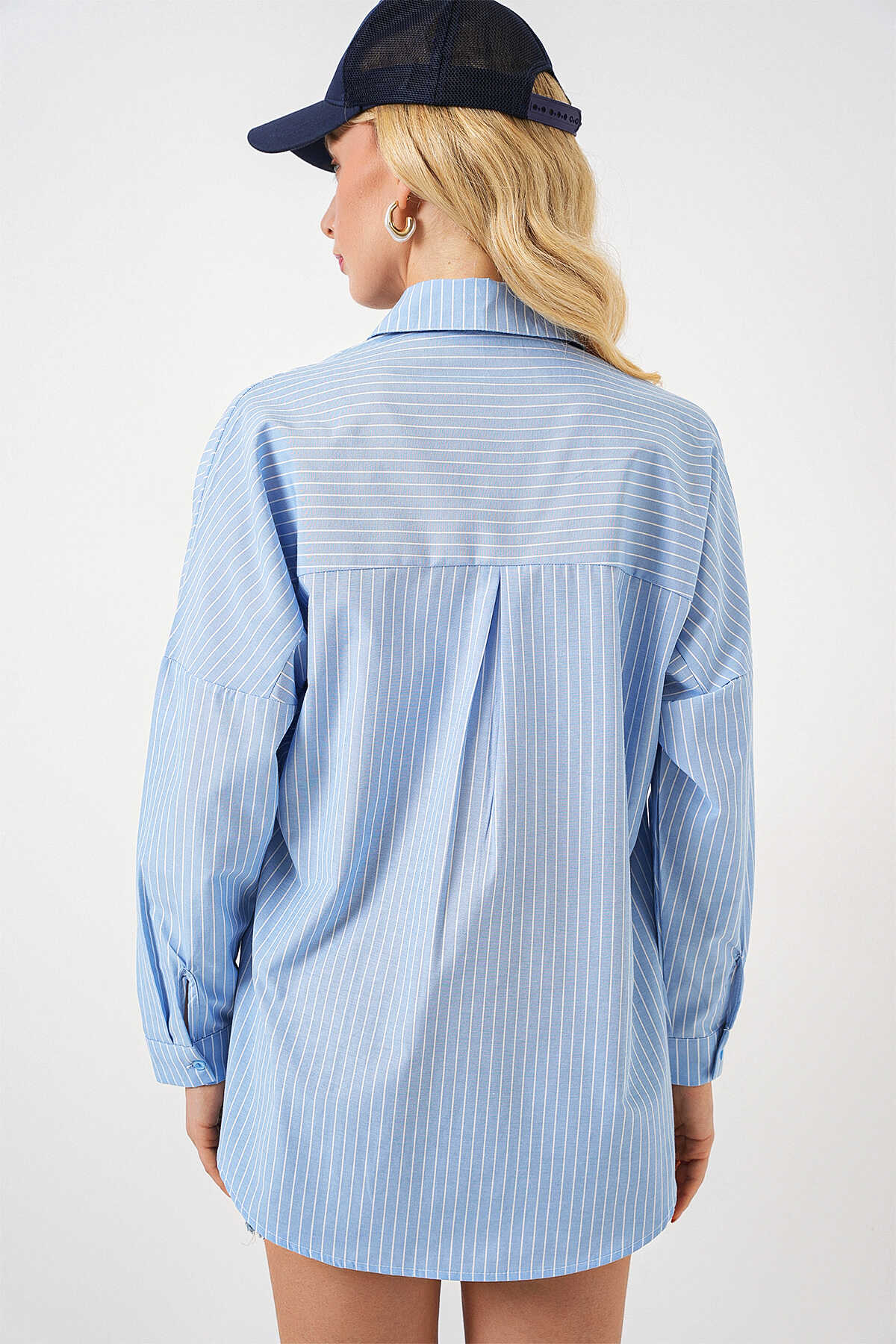 Kadın Çizgili Oversize Gömlek 20332 - C.Mavi