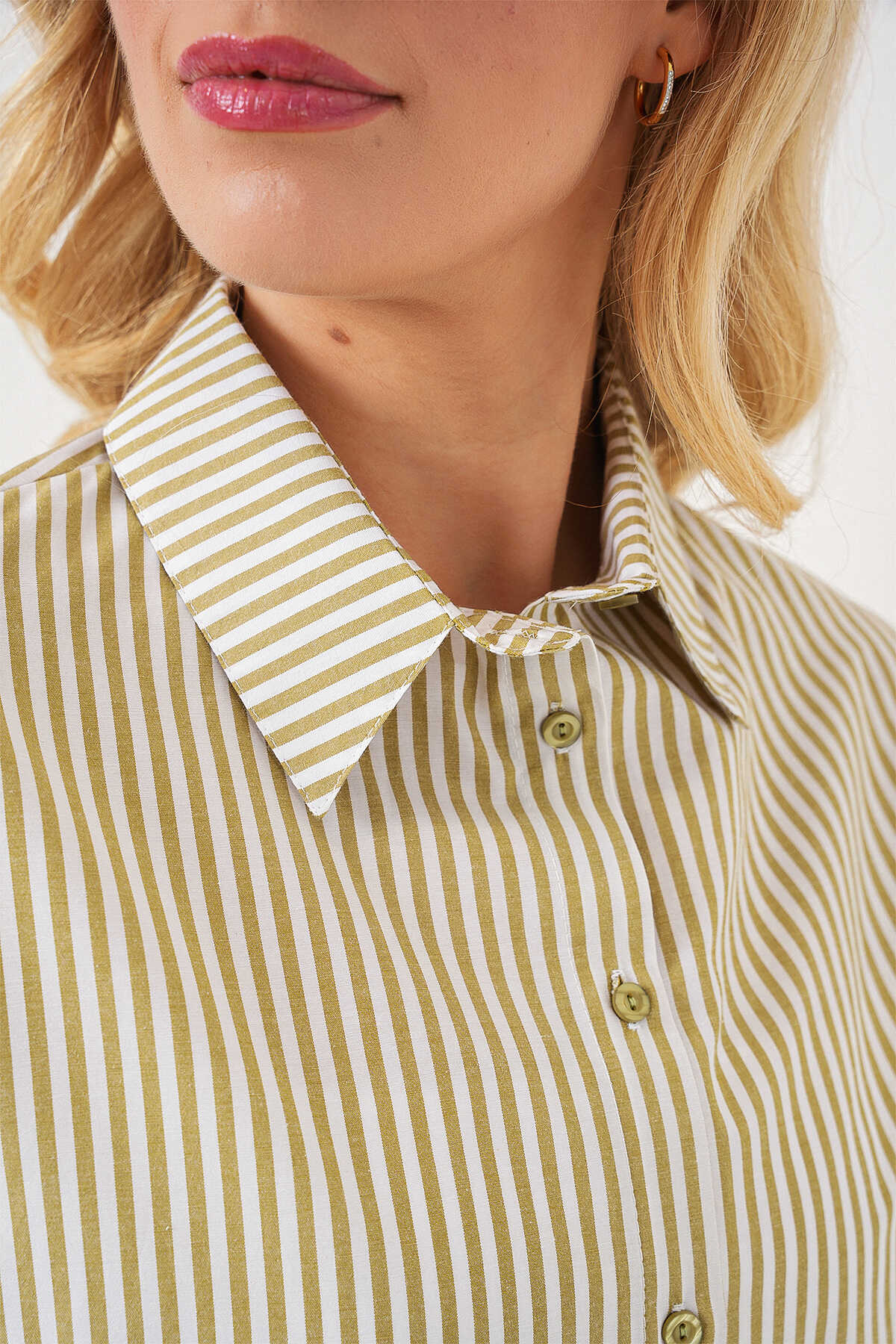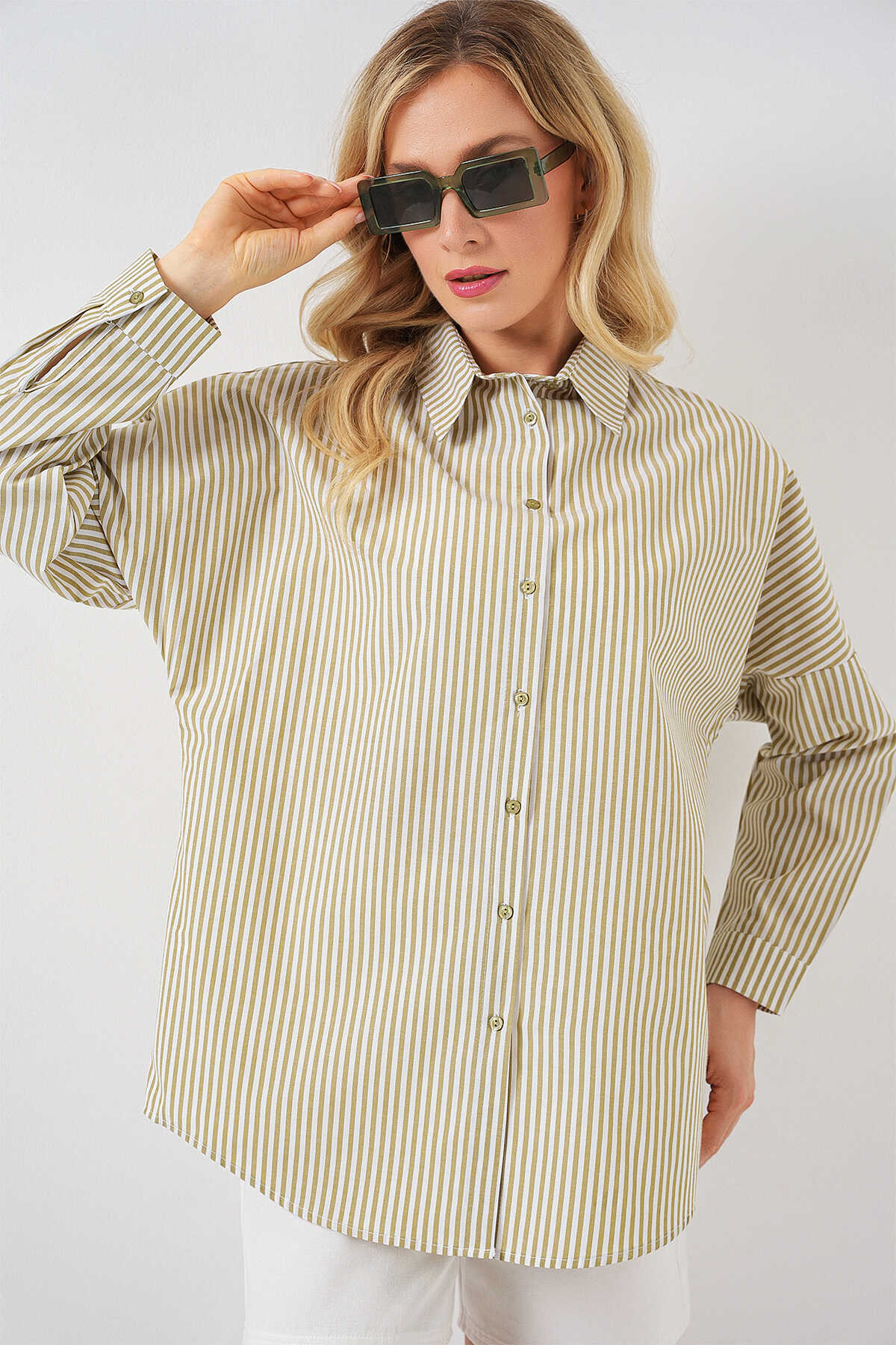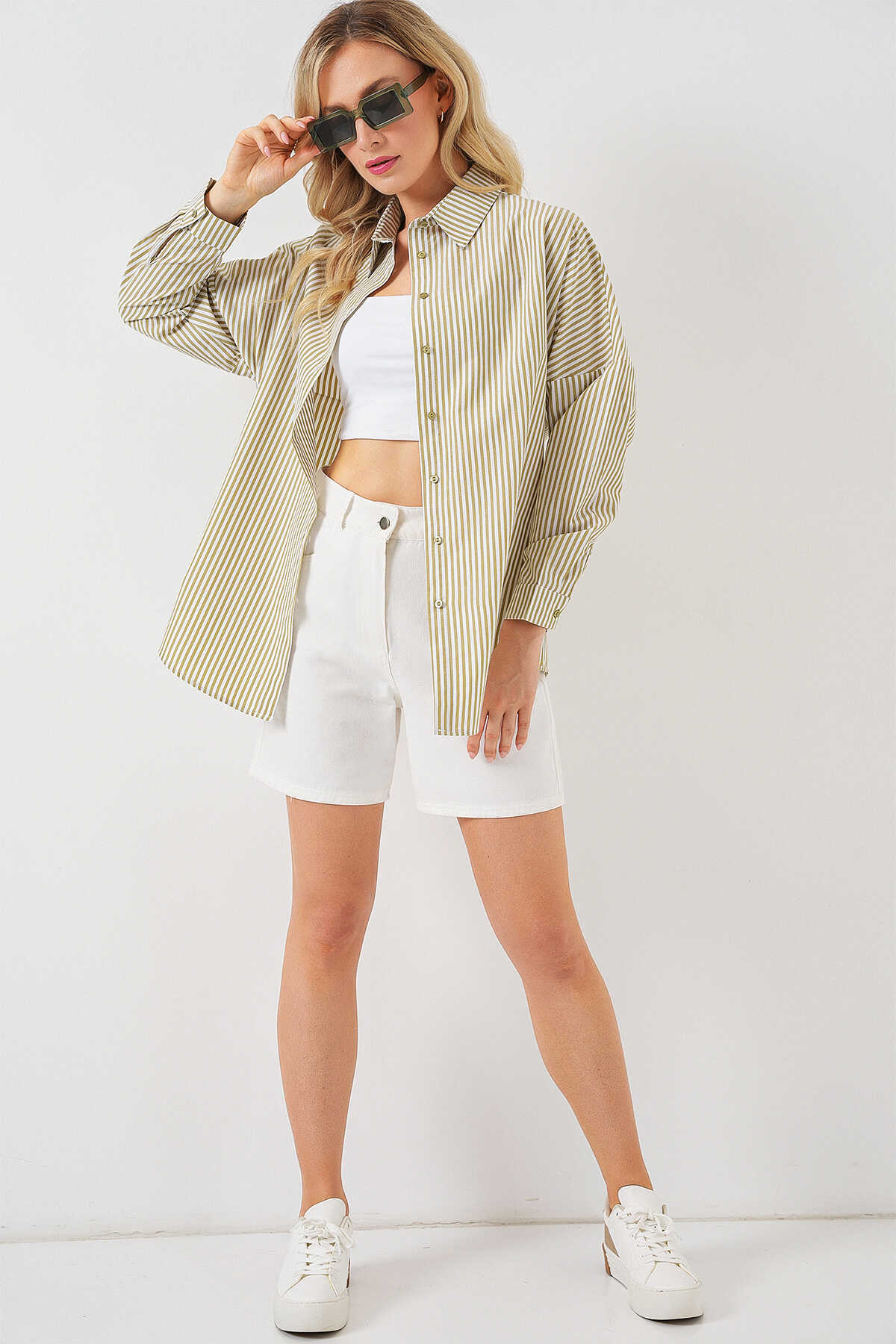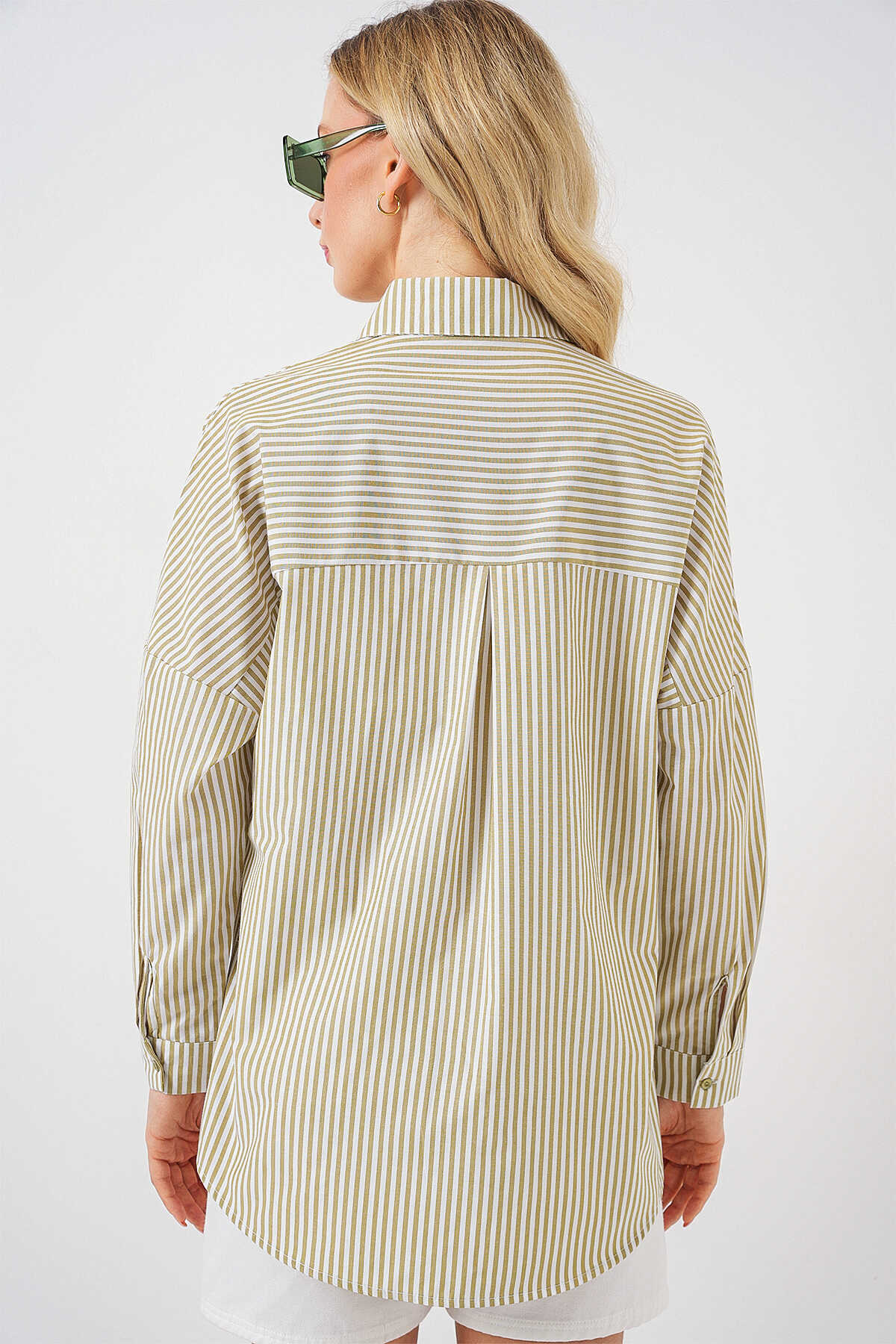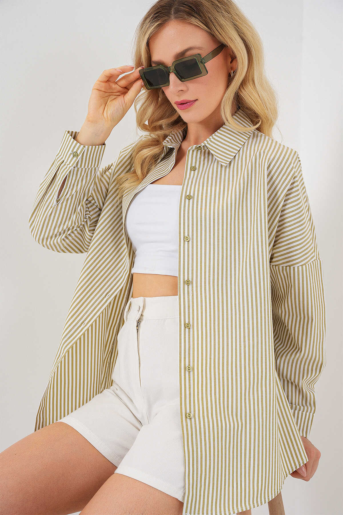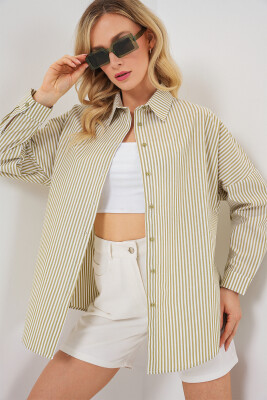 Kadın Çizgili Oversize Gömlek 20332 - Çağla