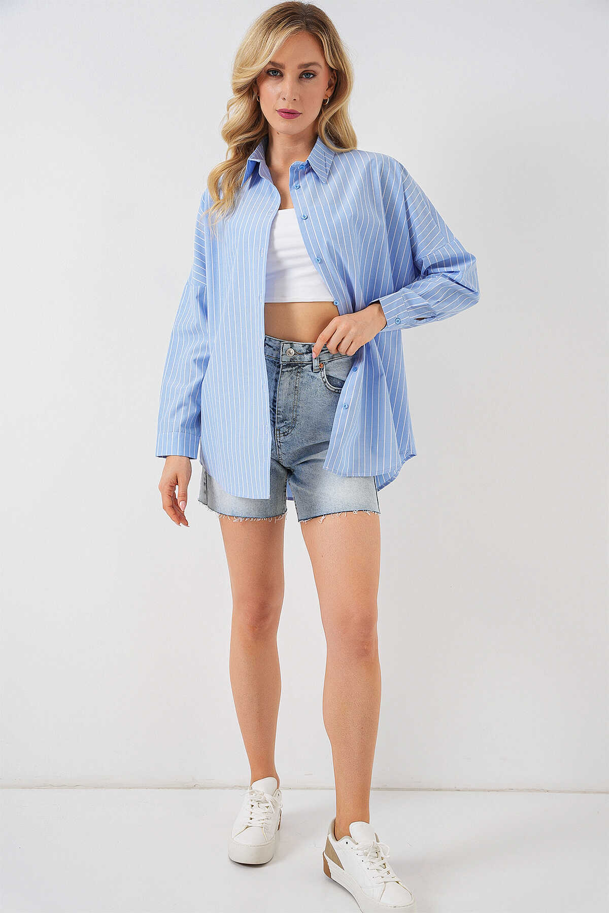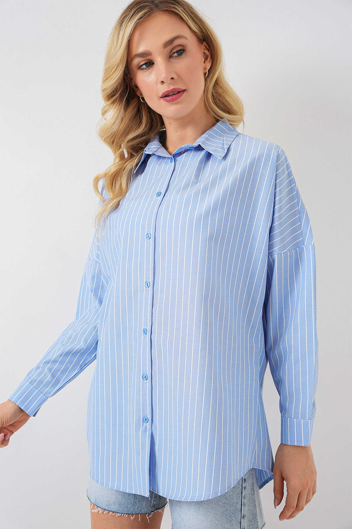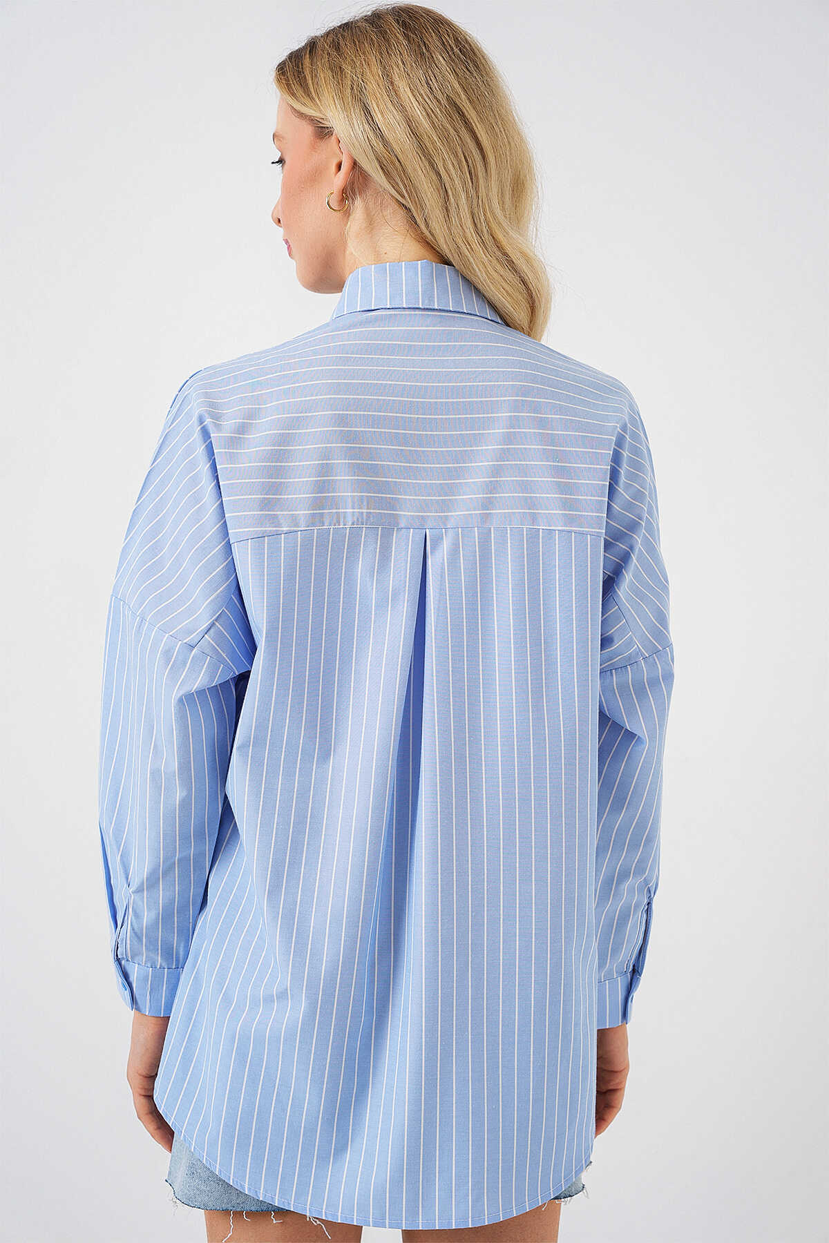 Kadın Çizgili Oversize Gömlek 20332 - Mavi - Kombin