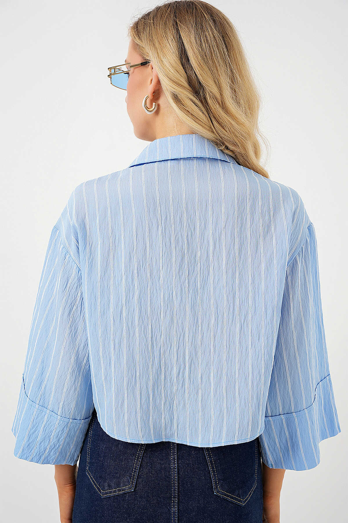 Kadın Çizgili Oversize Kısa Gömlek 20326 - Mavi - Kombin
