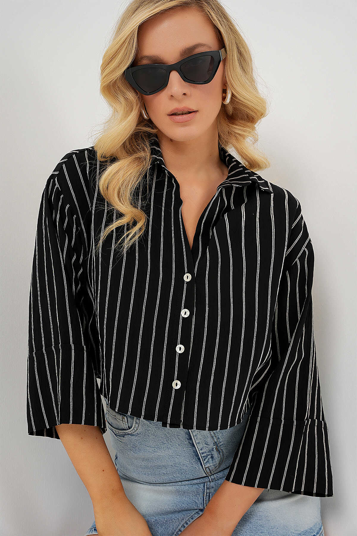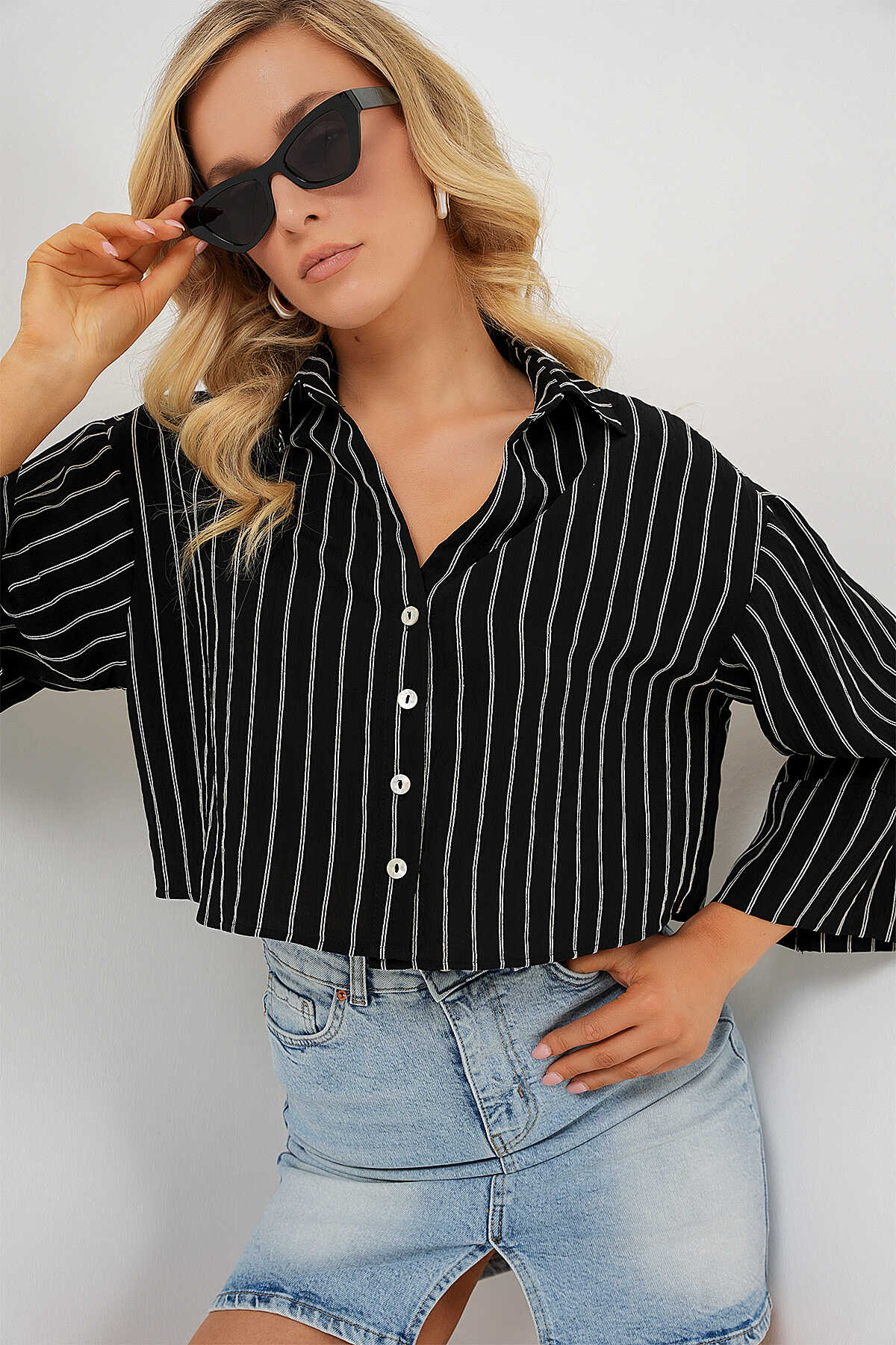 Kadın Çizgili Oversize Kısa Gömlek 20326 - Siyah - Kombin
