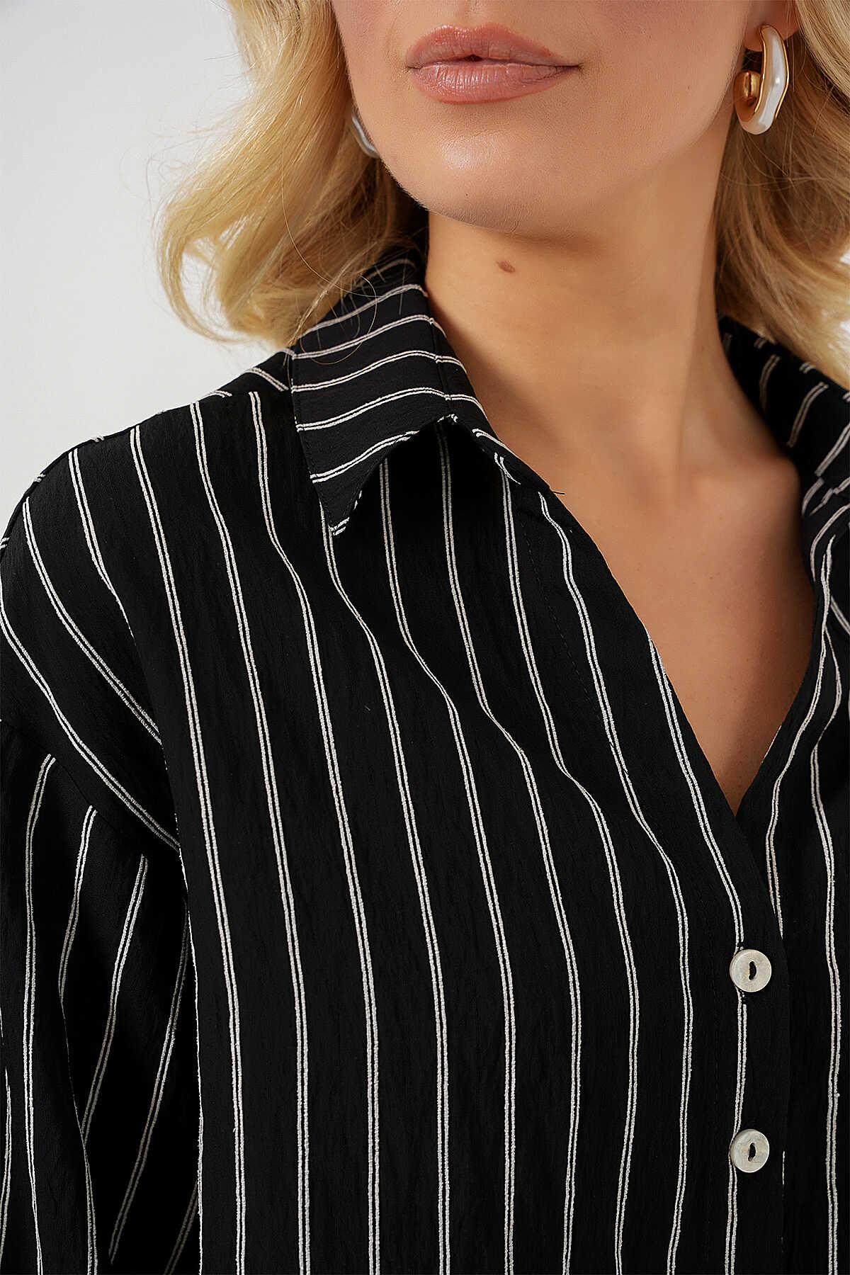 Kadın Çizgili Oversize Kısa Gömlek 20326 - Siyah