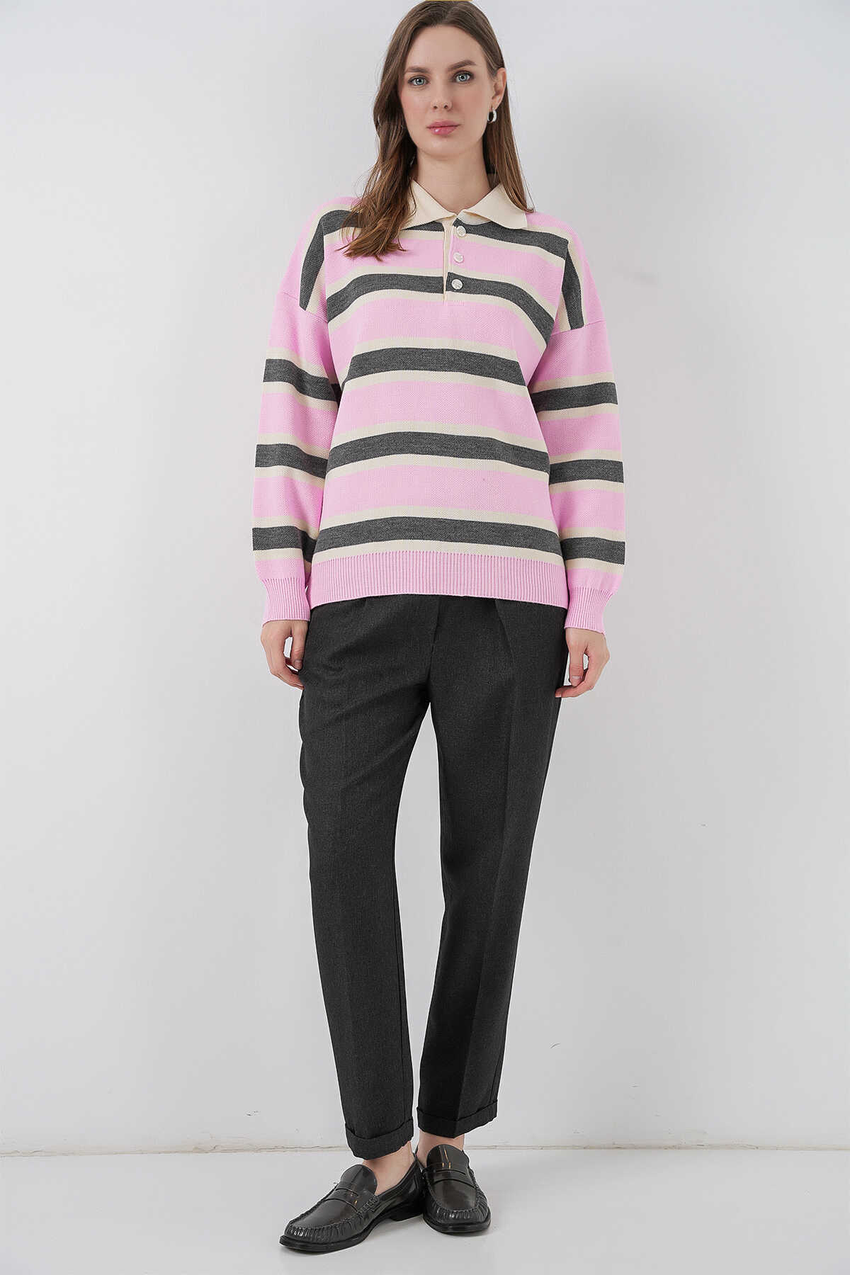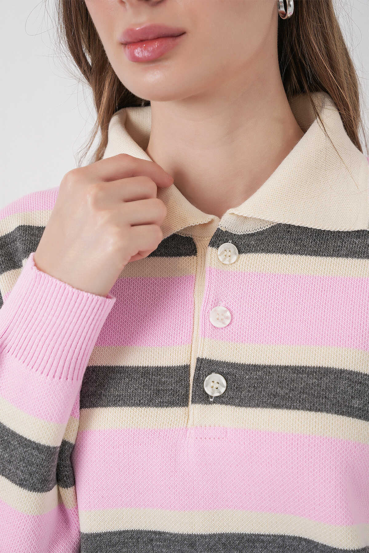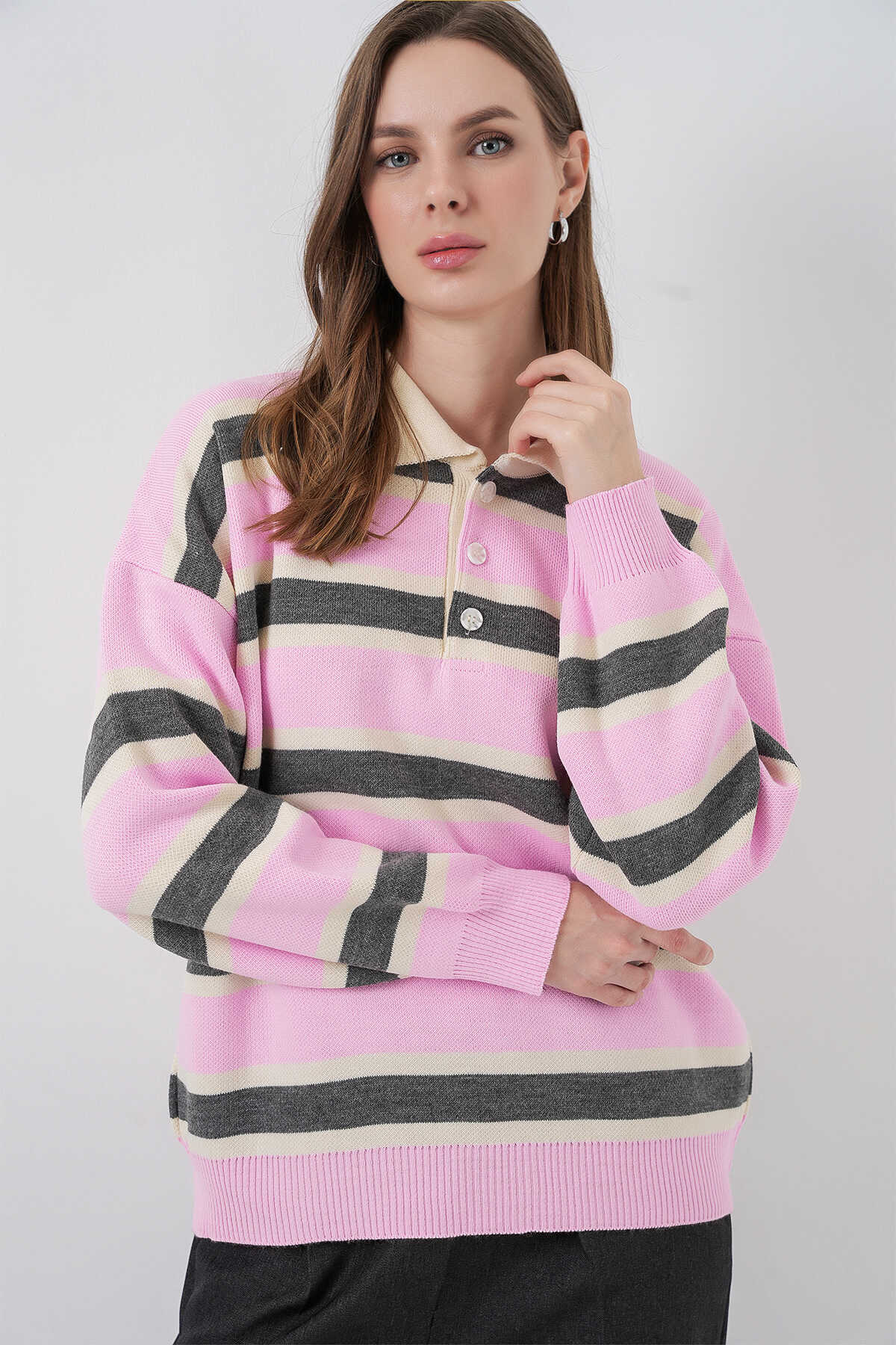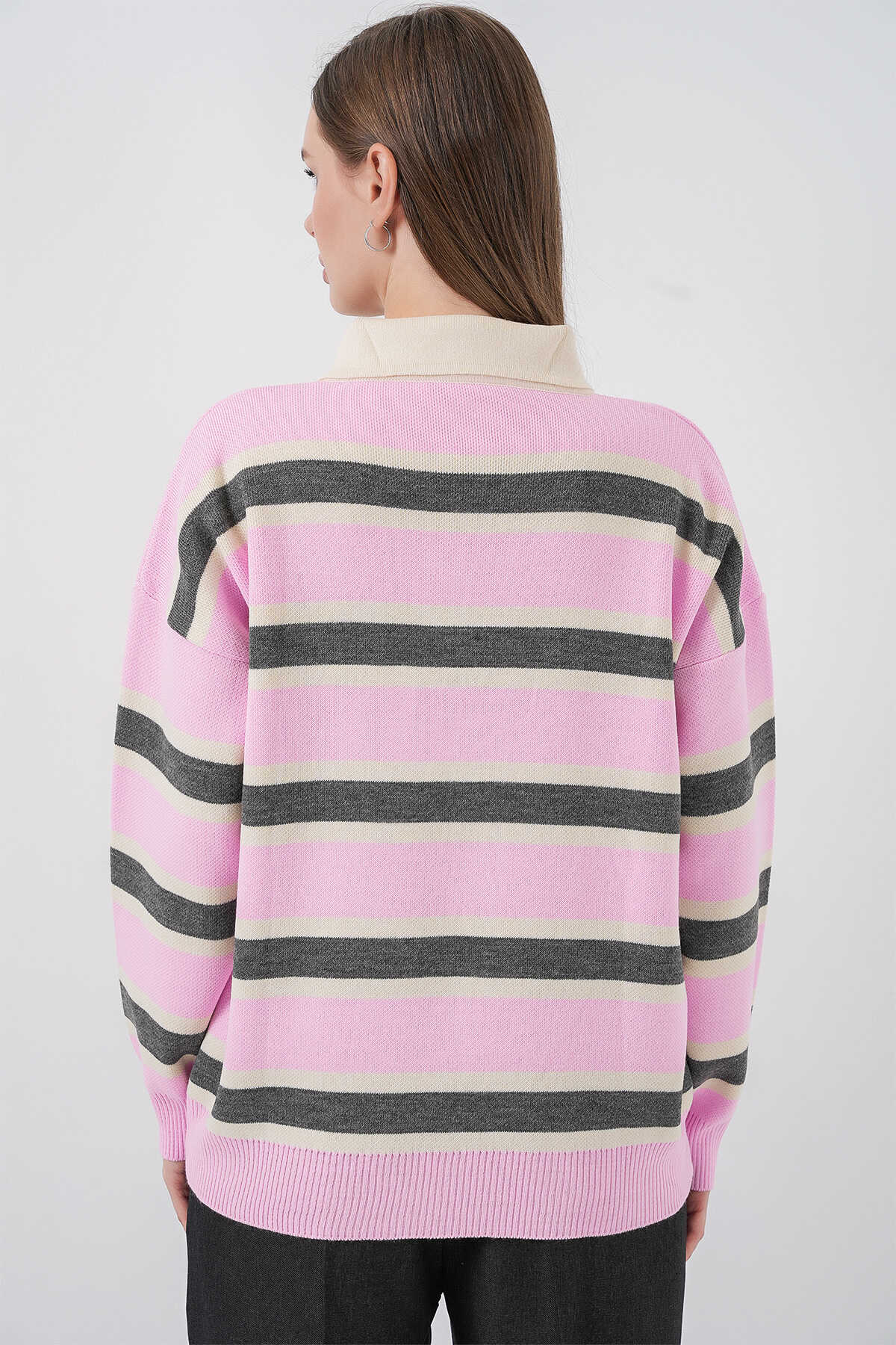 Kadın Çizgili Polo Yaka Triko Kazak 15952 - Pembe