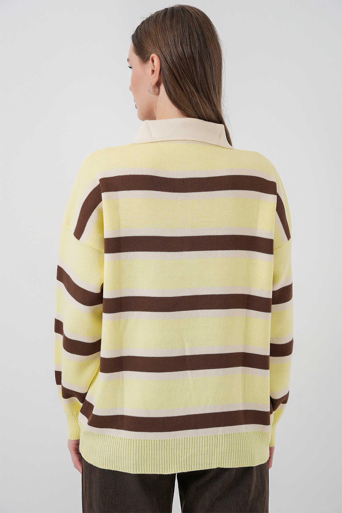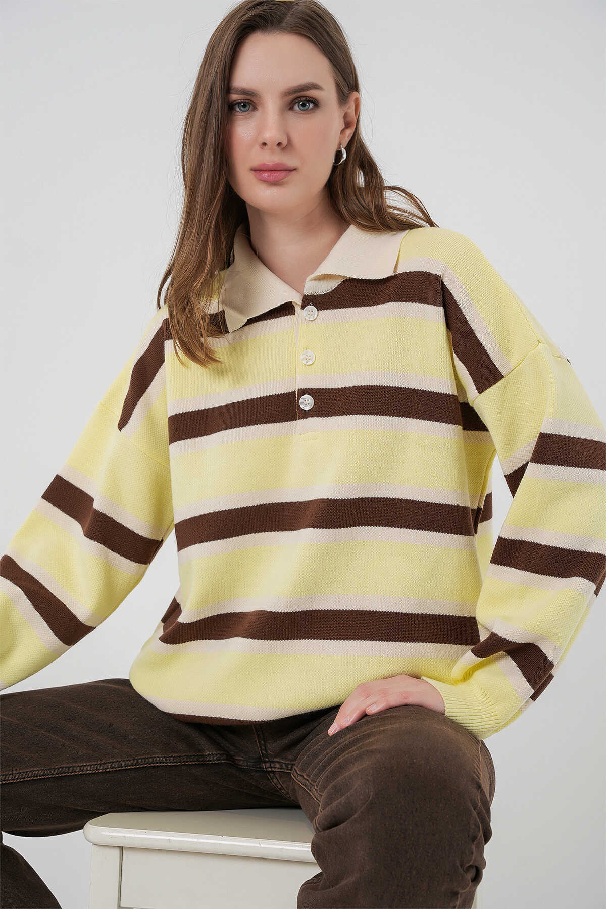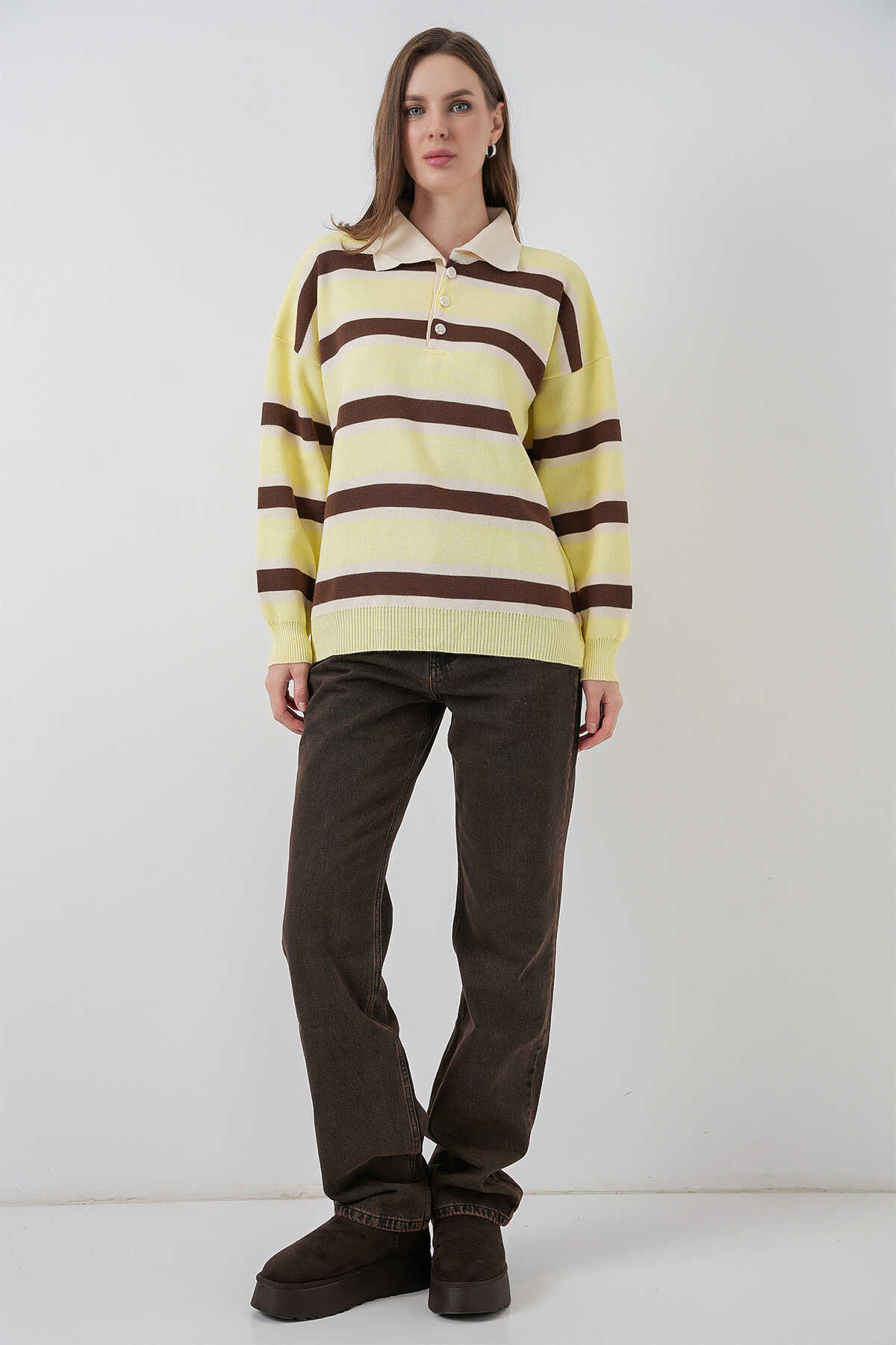 Kadın Çizgili Polo Yaka Triko Kazak 15952 - Sarı - Kombin