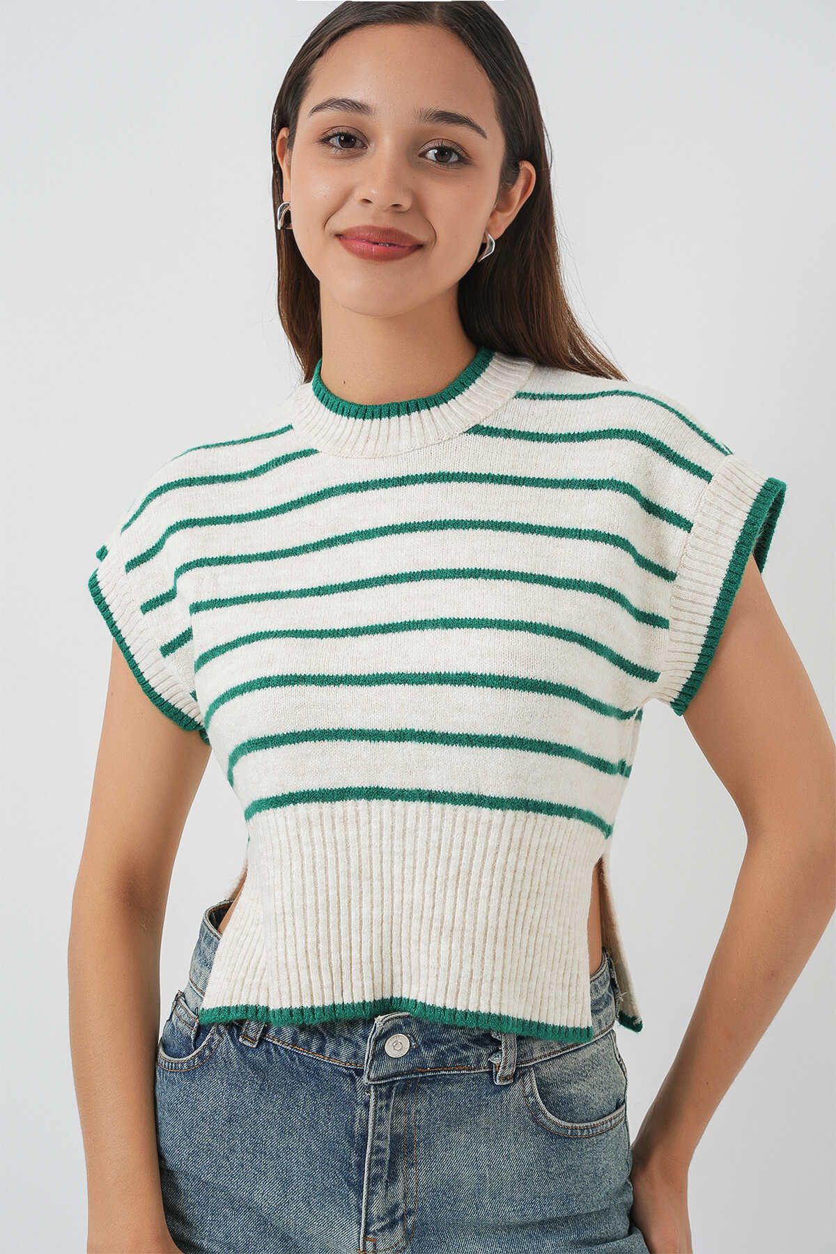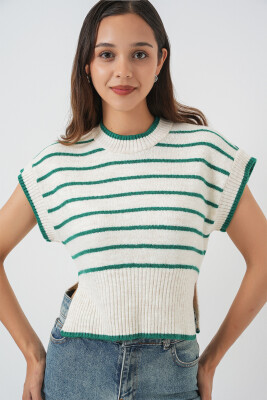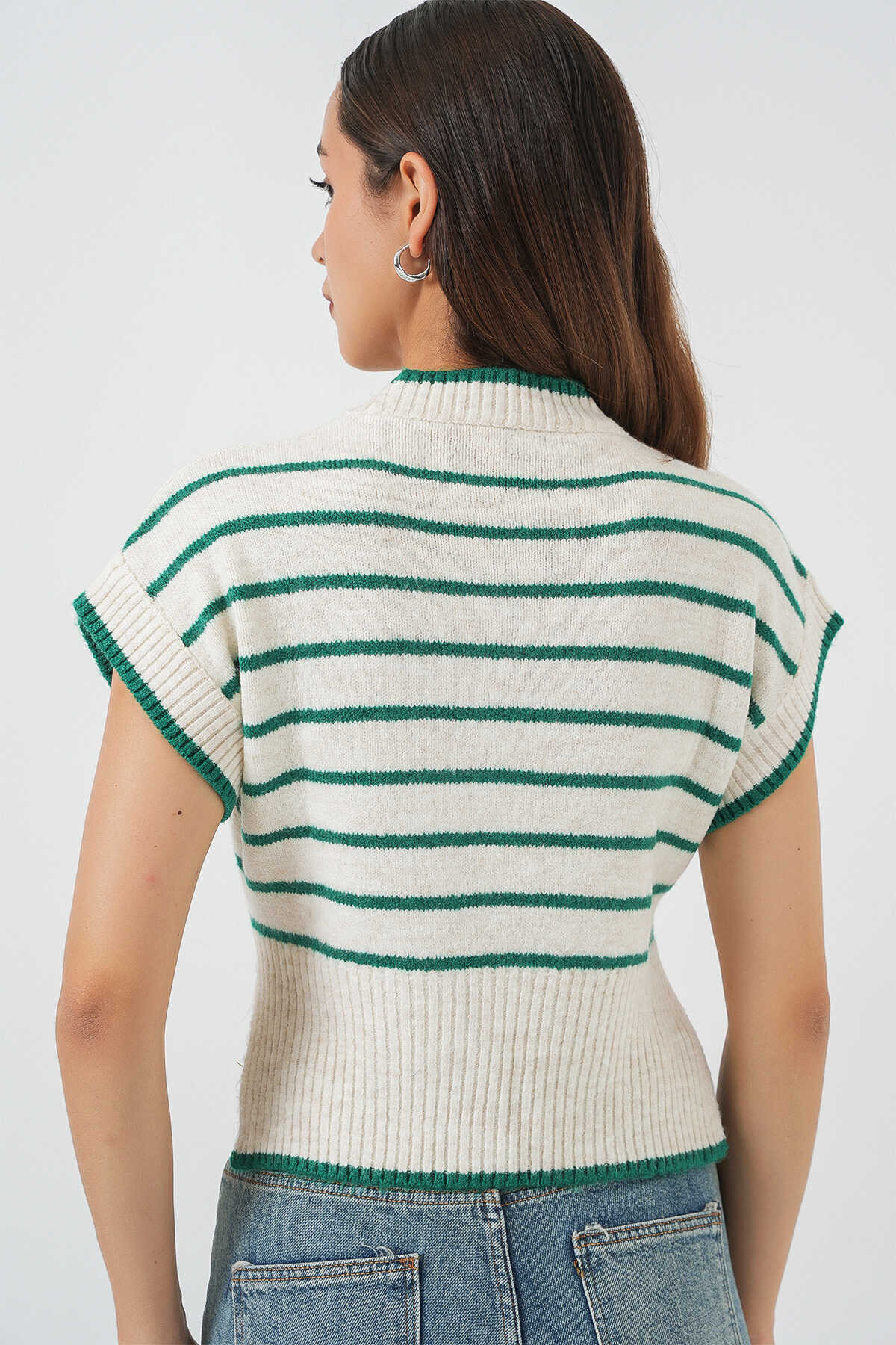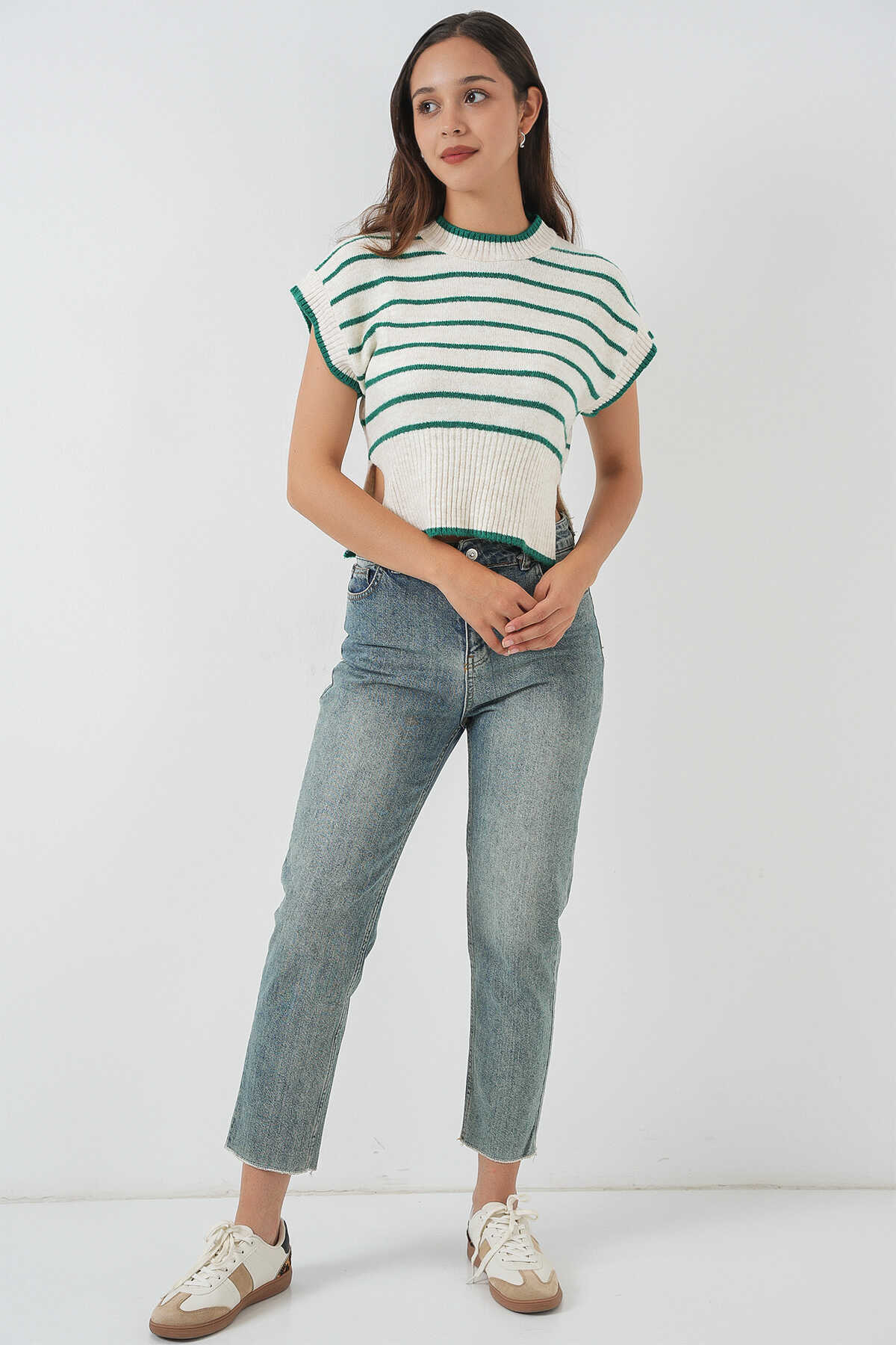 Kadın Çizgili Triko Süveter 15926 - Zümrüt Yeşili - Kombin