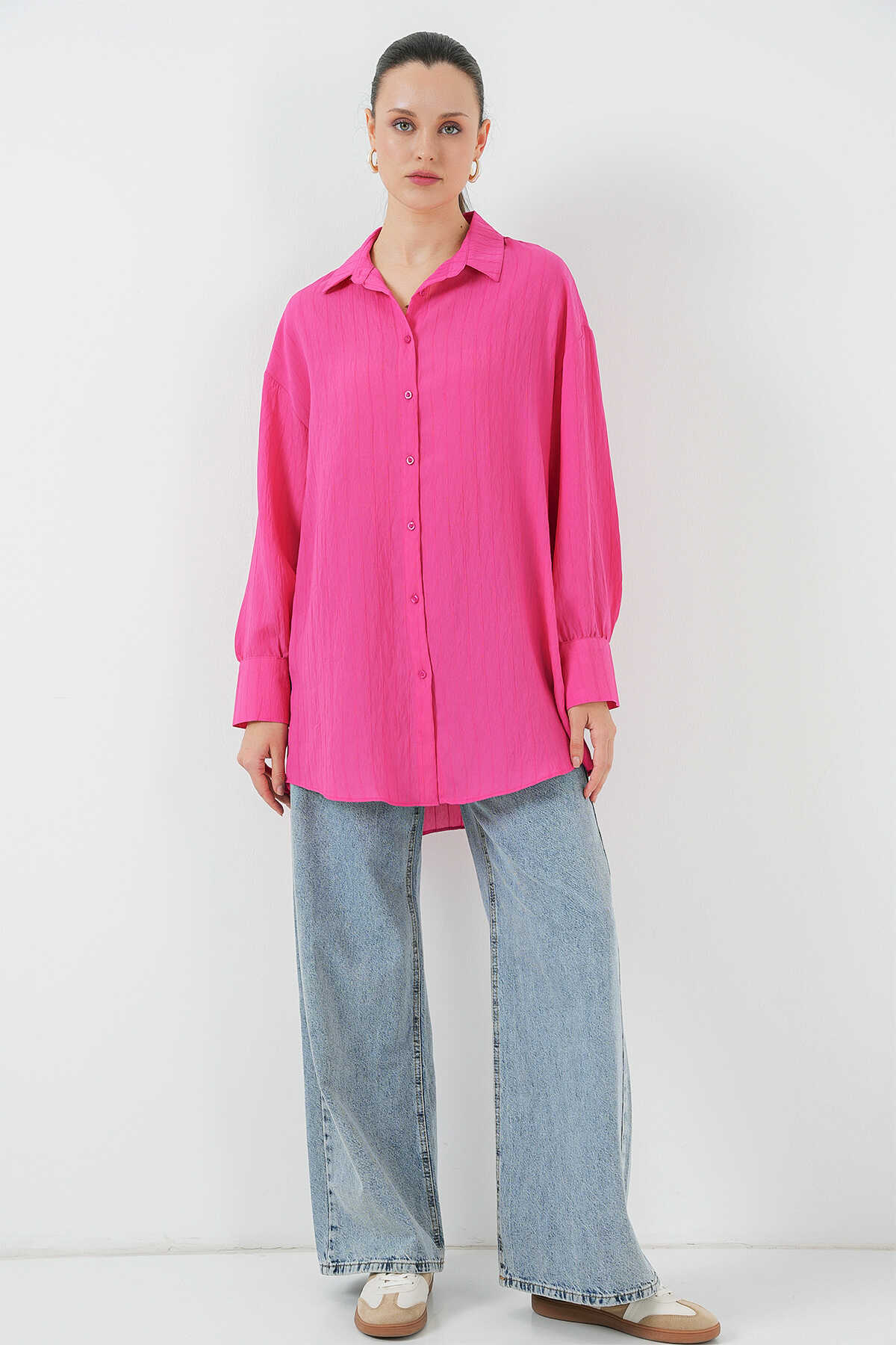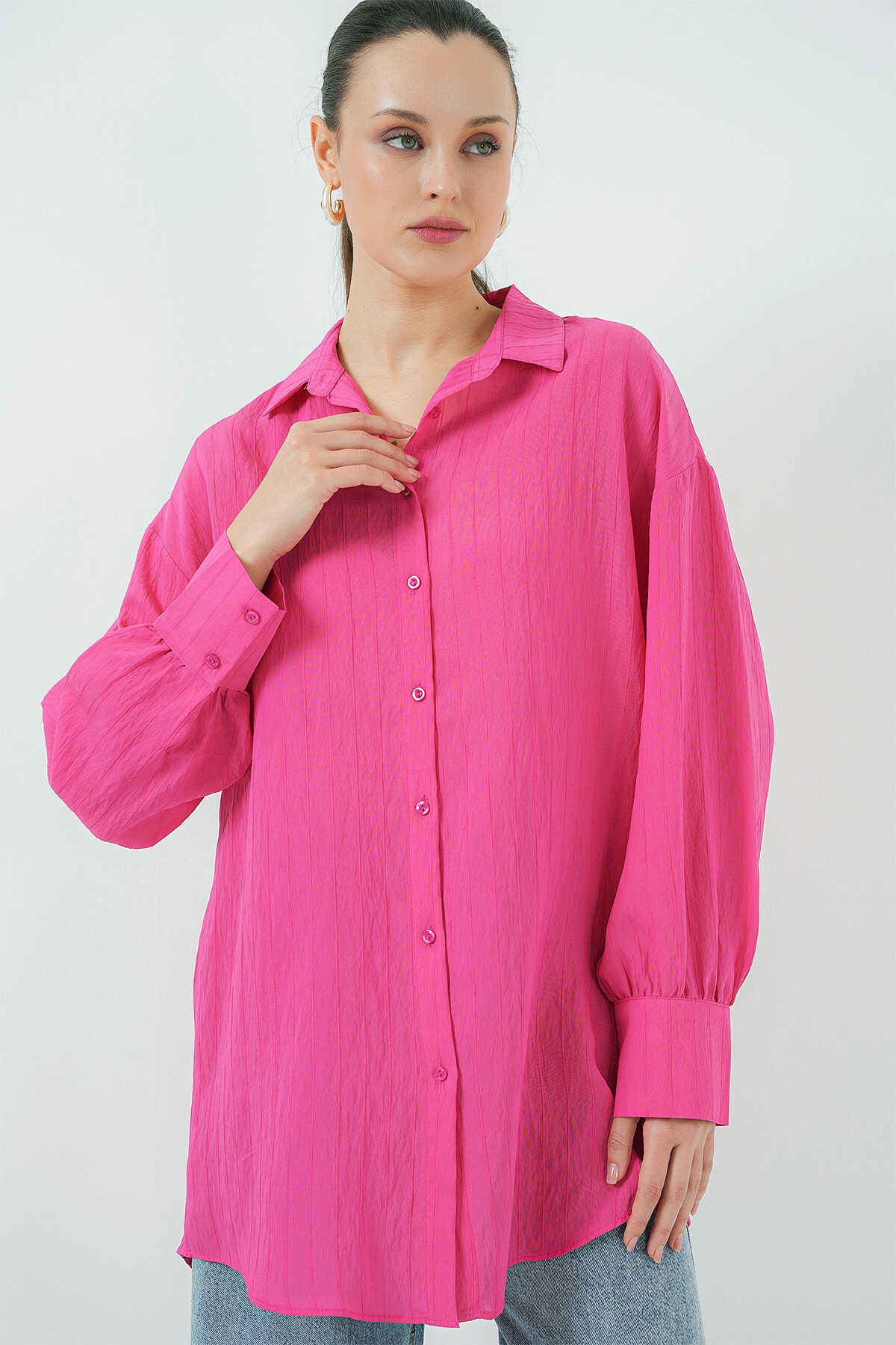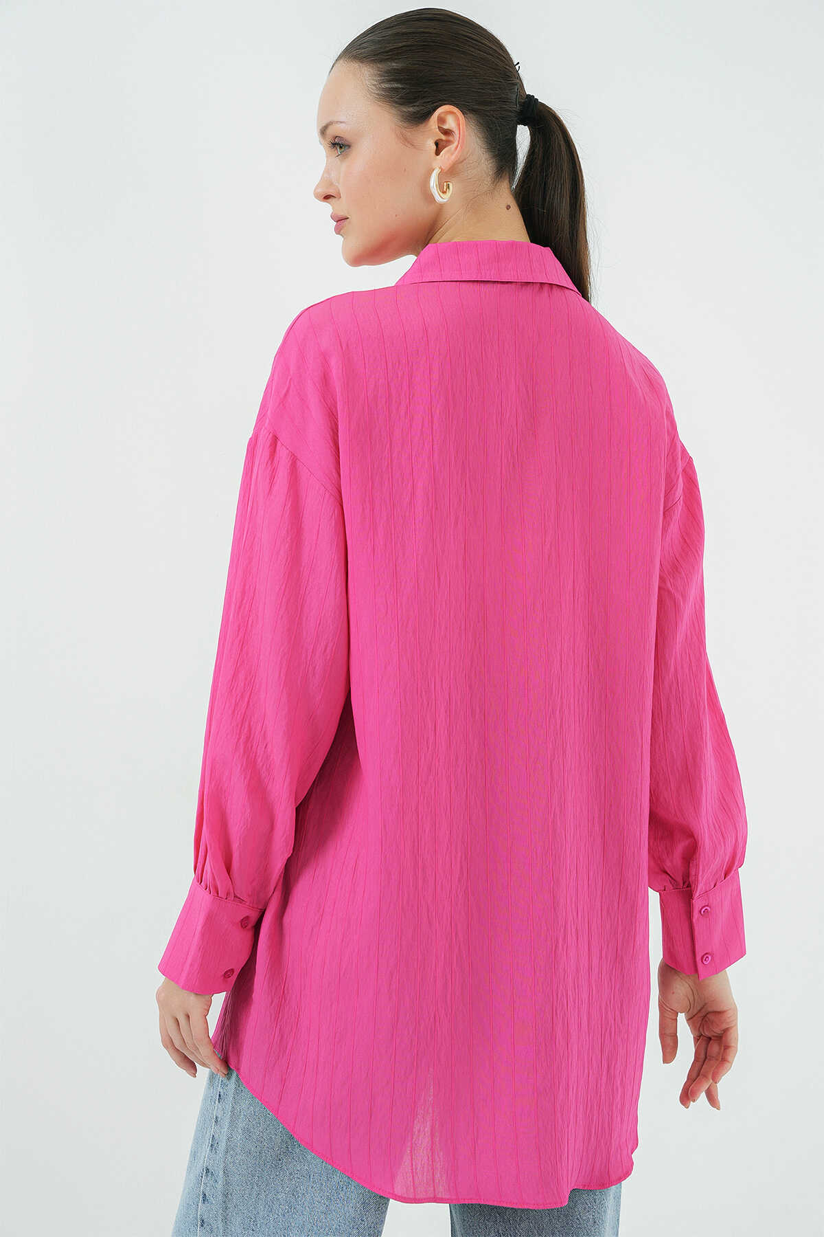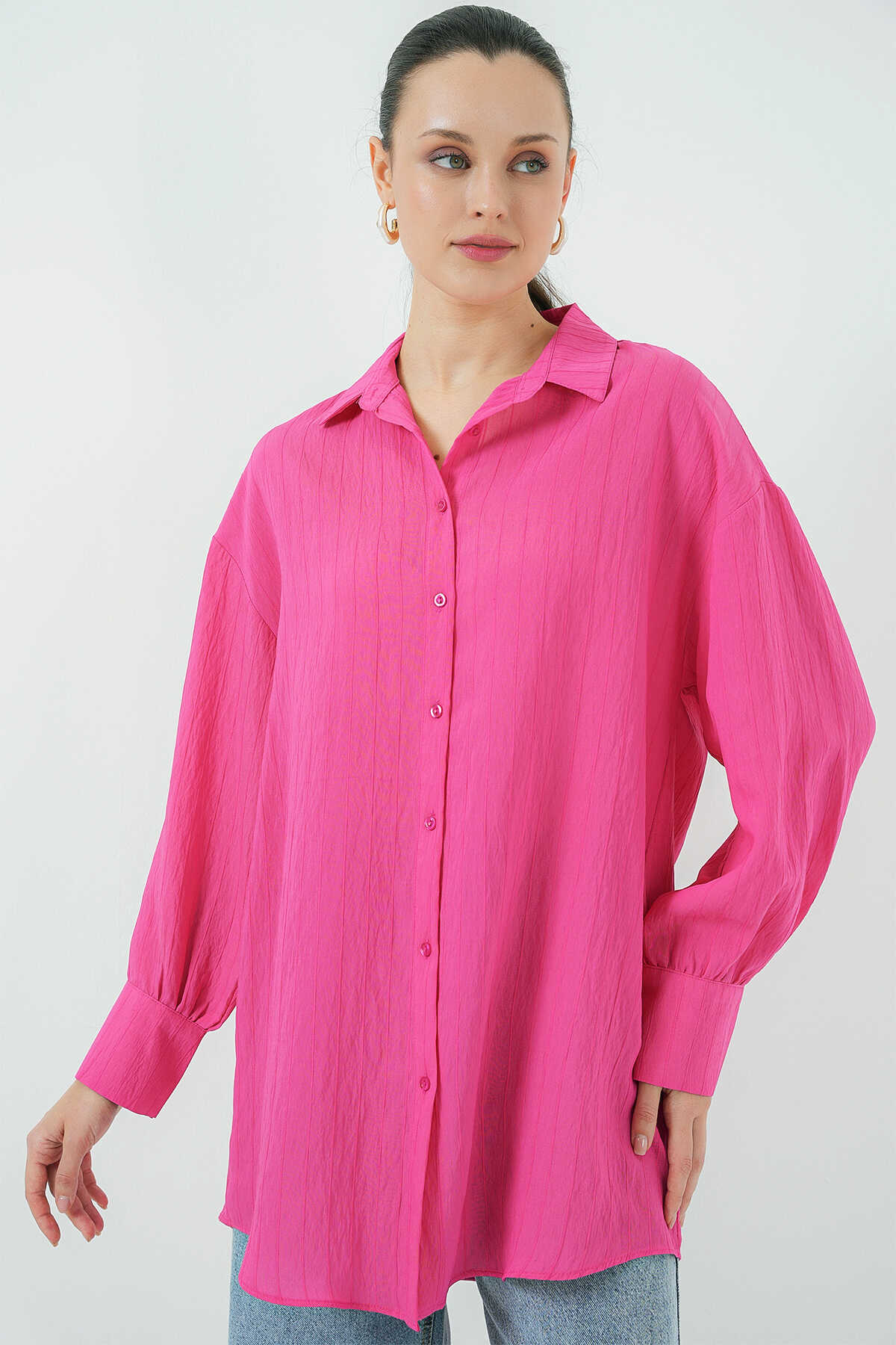 Kadın Çizgili Uzun Gömlek Tunik 5963 - Fuşya - Kombin