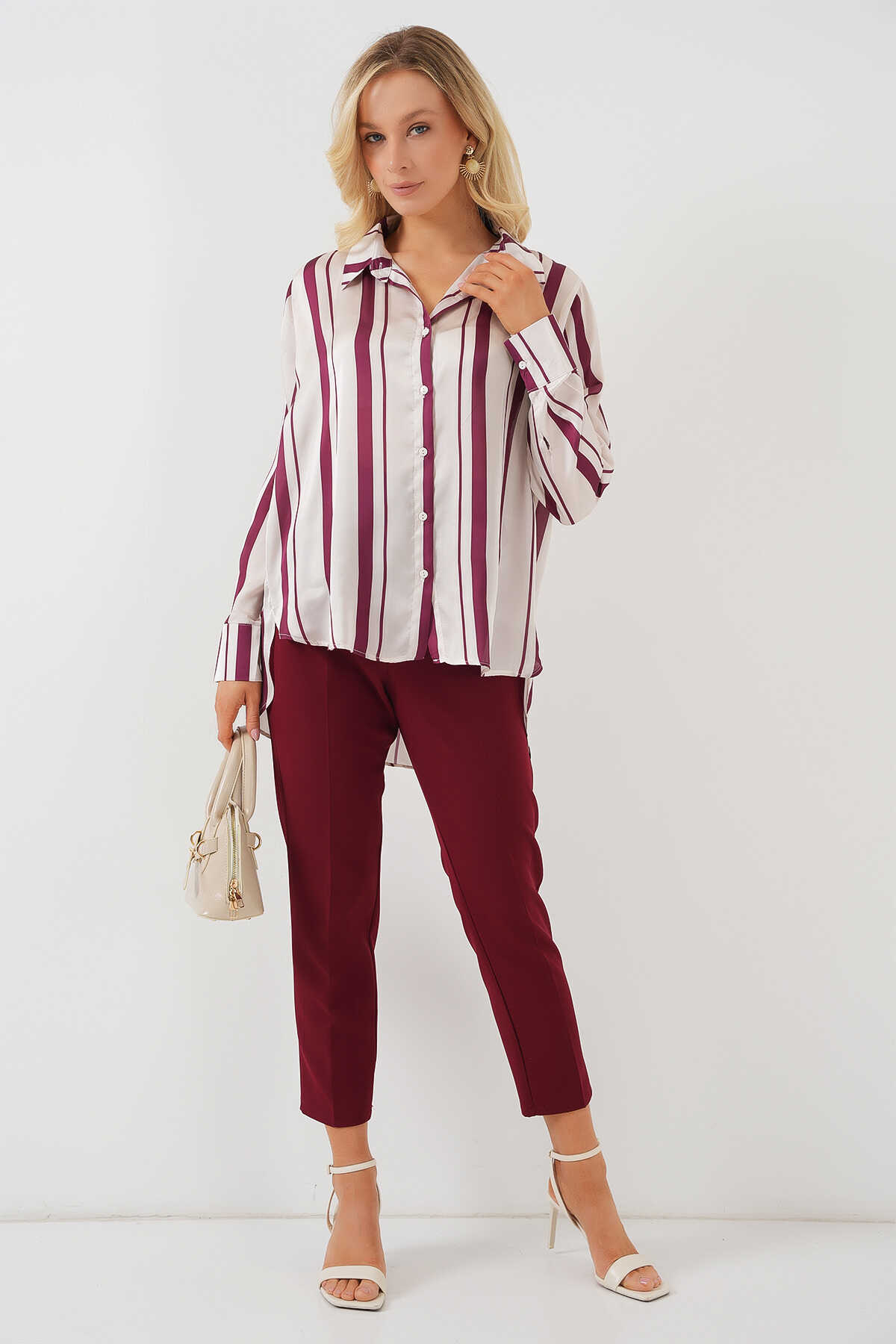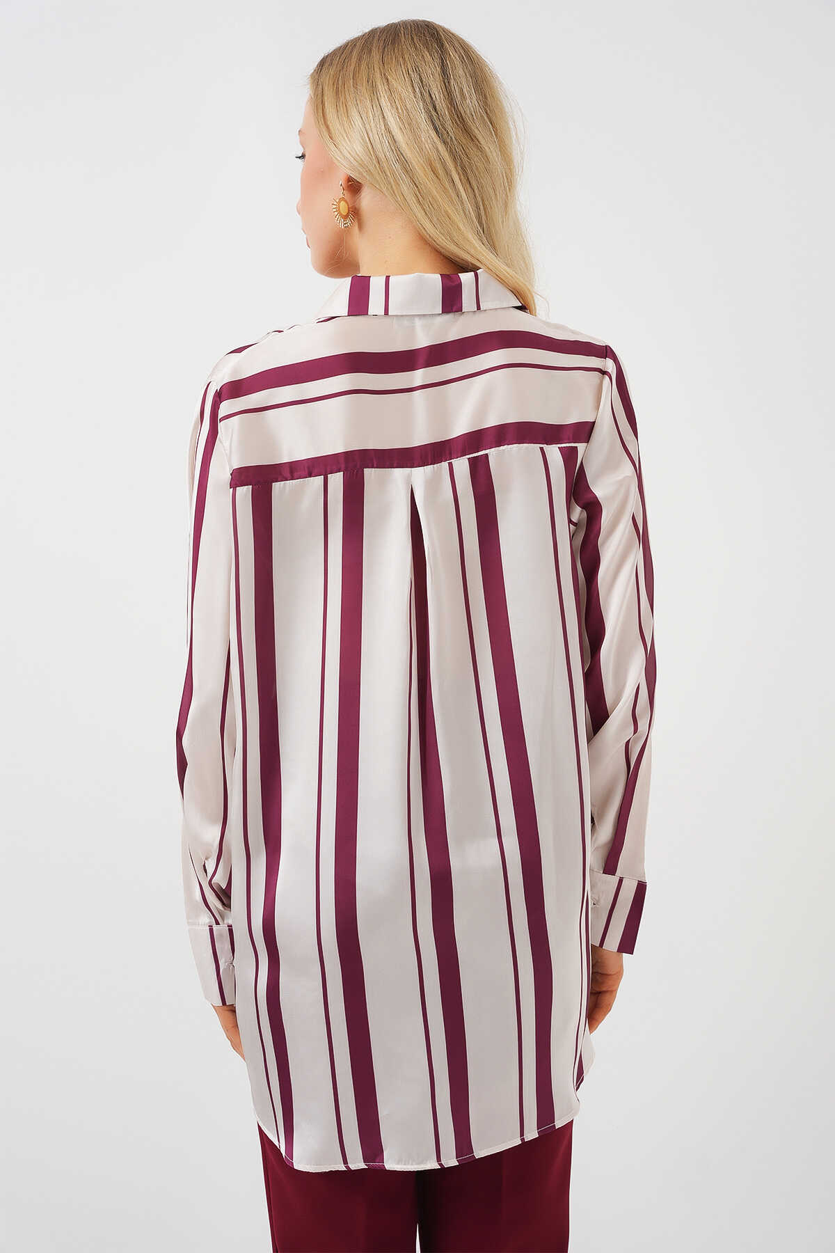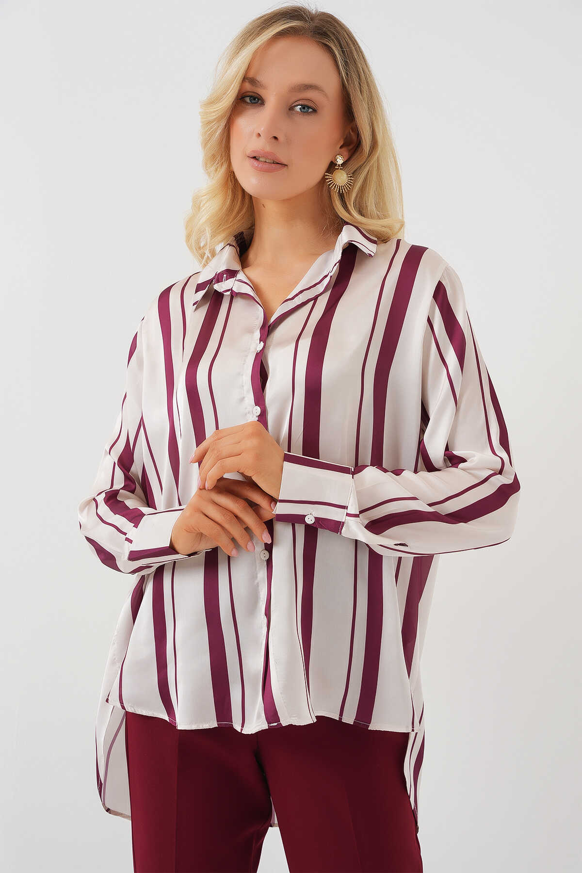 Kadın Çizgili Uzun Saten Gömlek 20291 - Bordo - Kombin