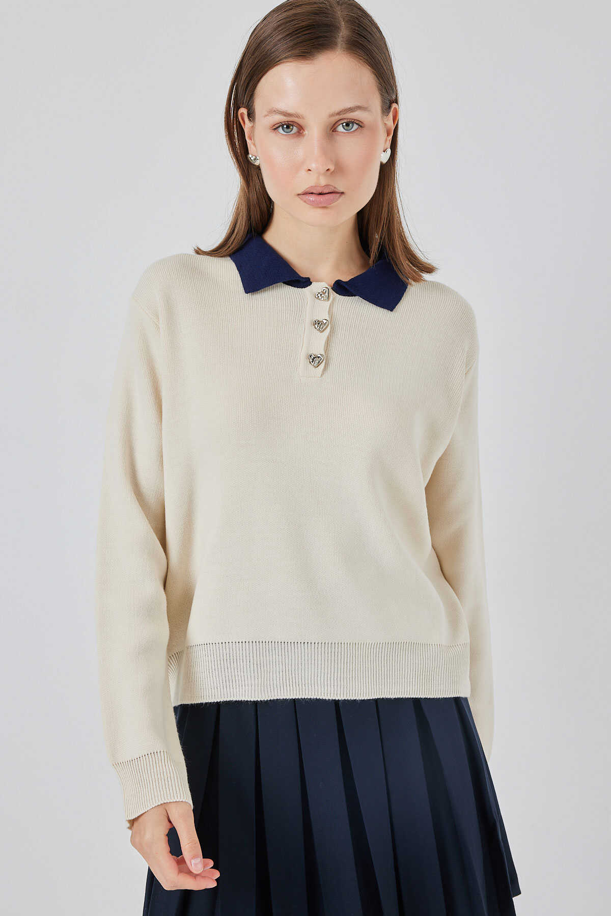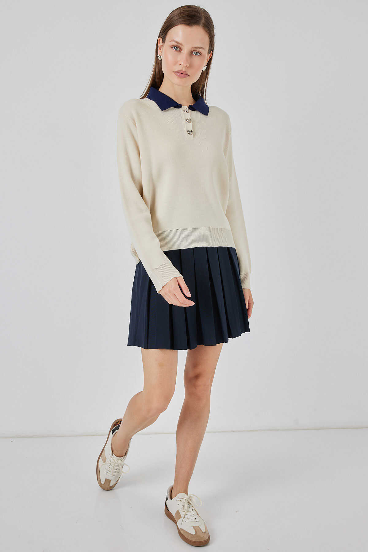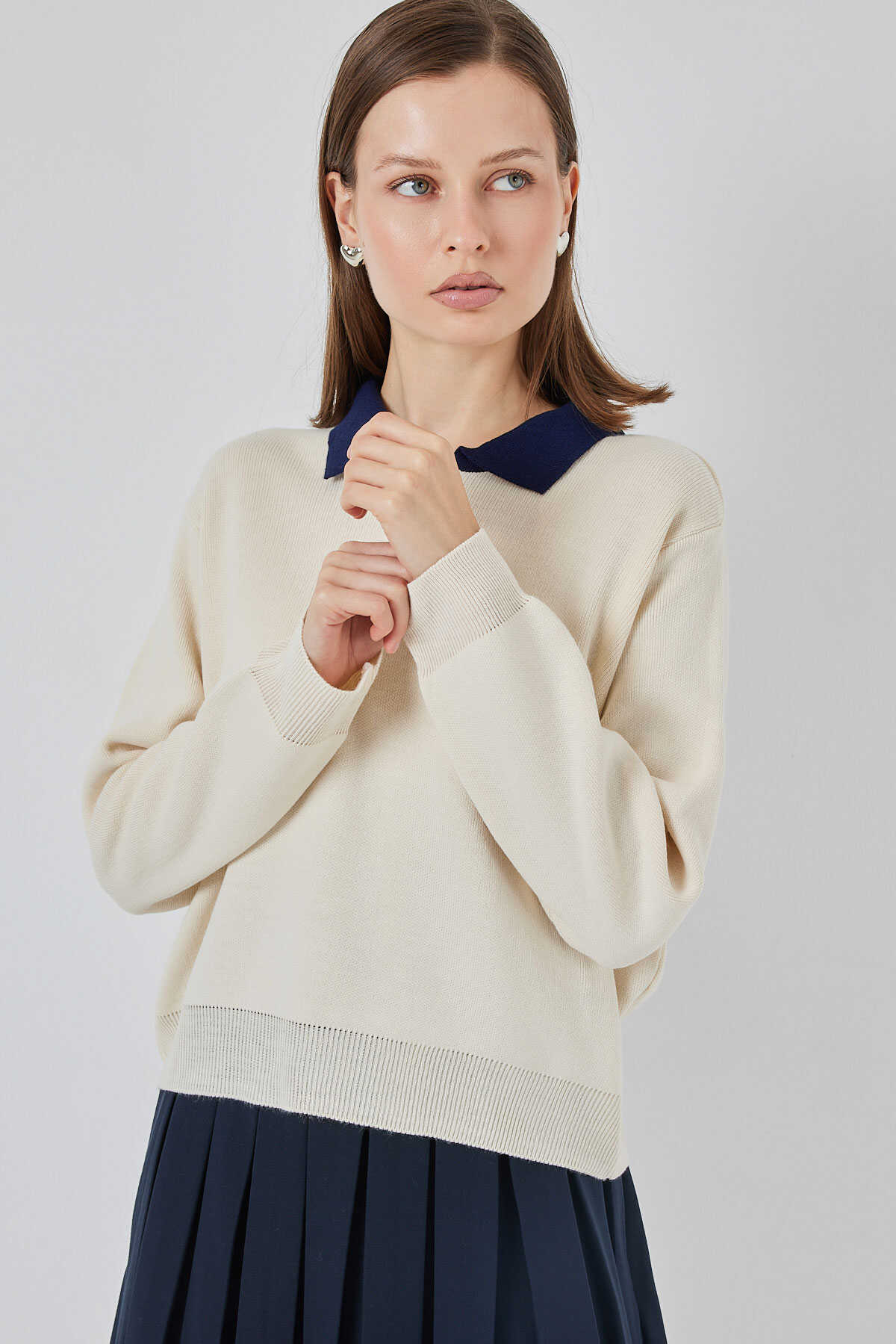 Kadın Crop Triko Kazak 15936 - Krem - Kombin