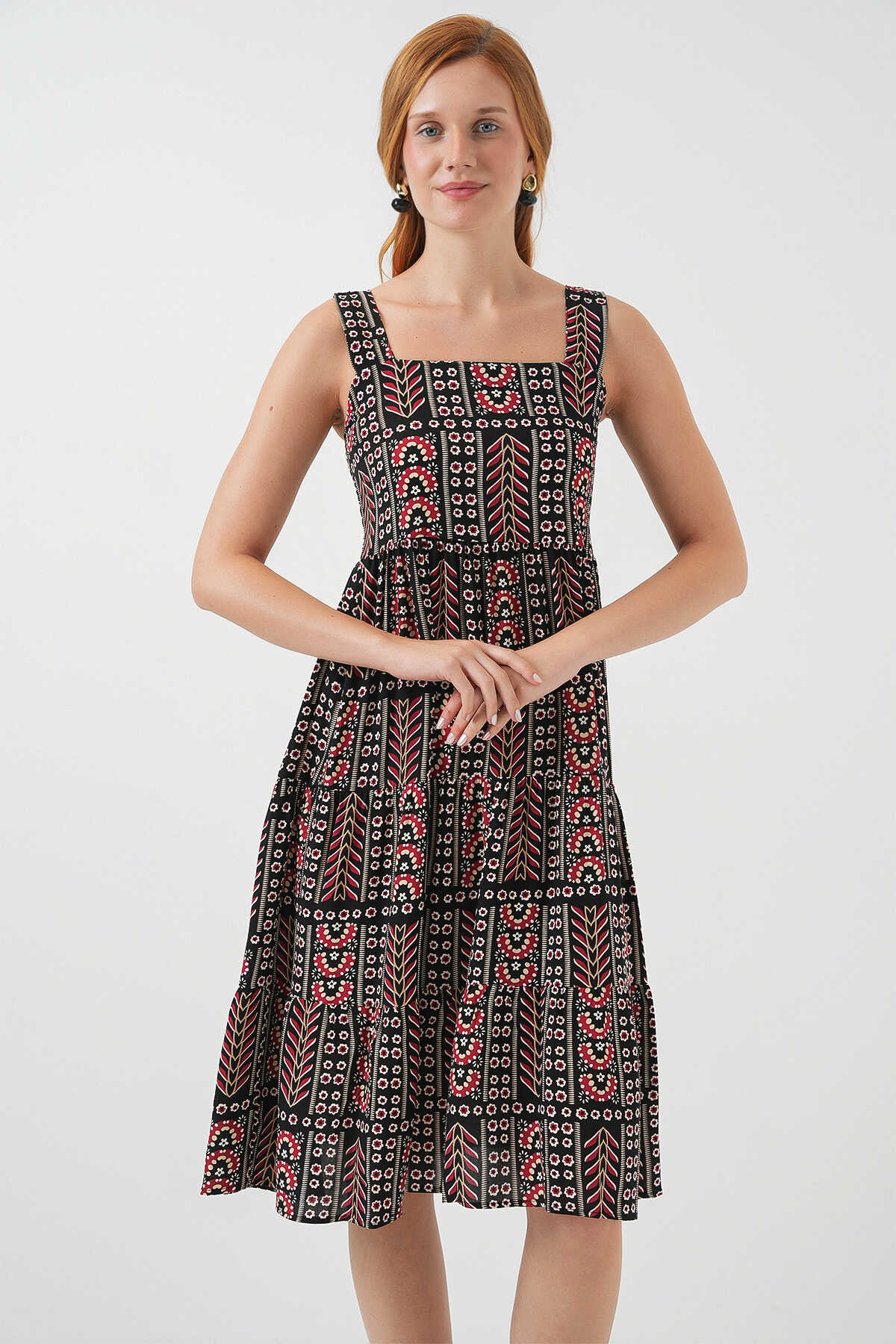 Kadın Desenli Askılı Midi Elbise 2577 - Siyah