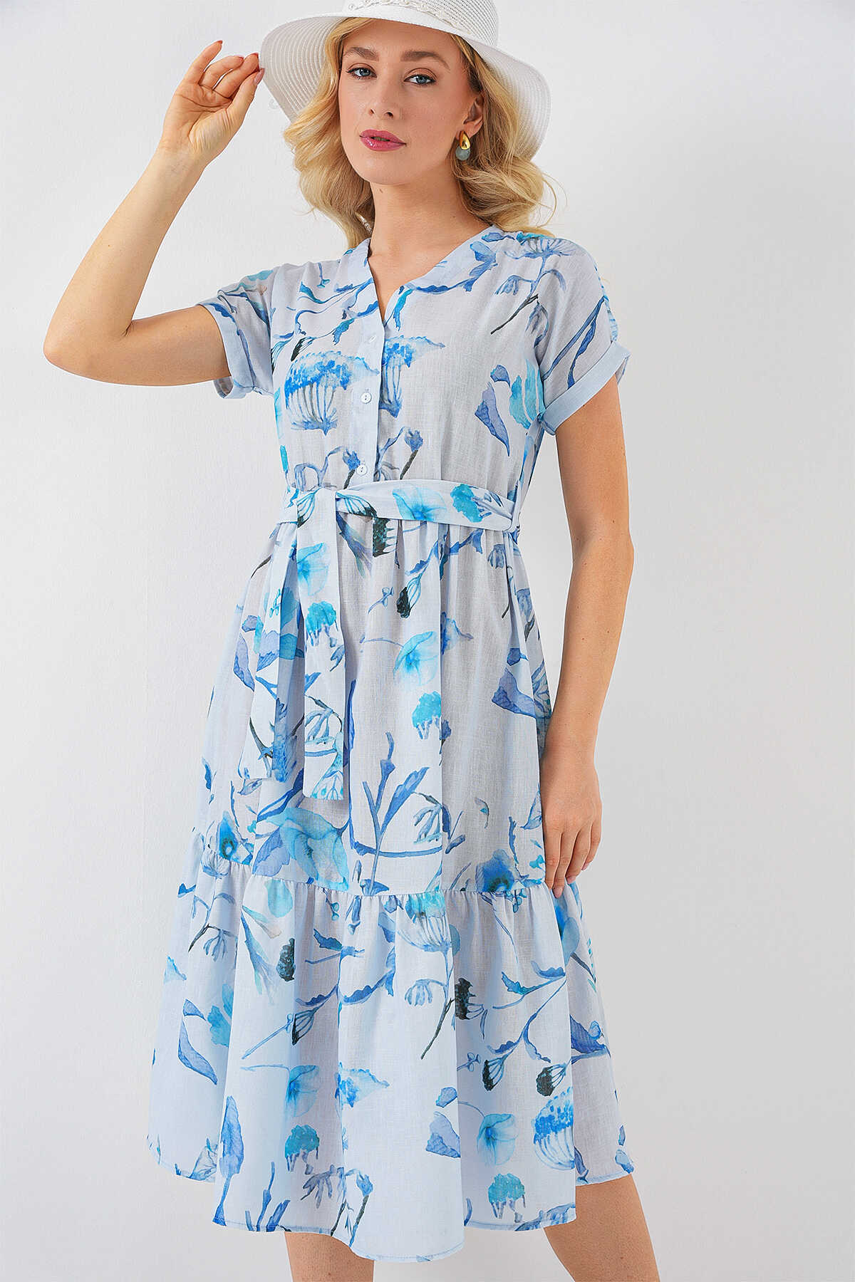 Kadın Desenli Kısa Kol Elbise 2558 - Mavi - Kombin