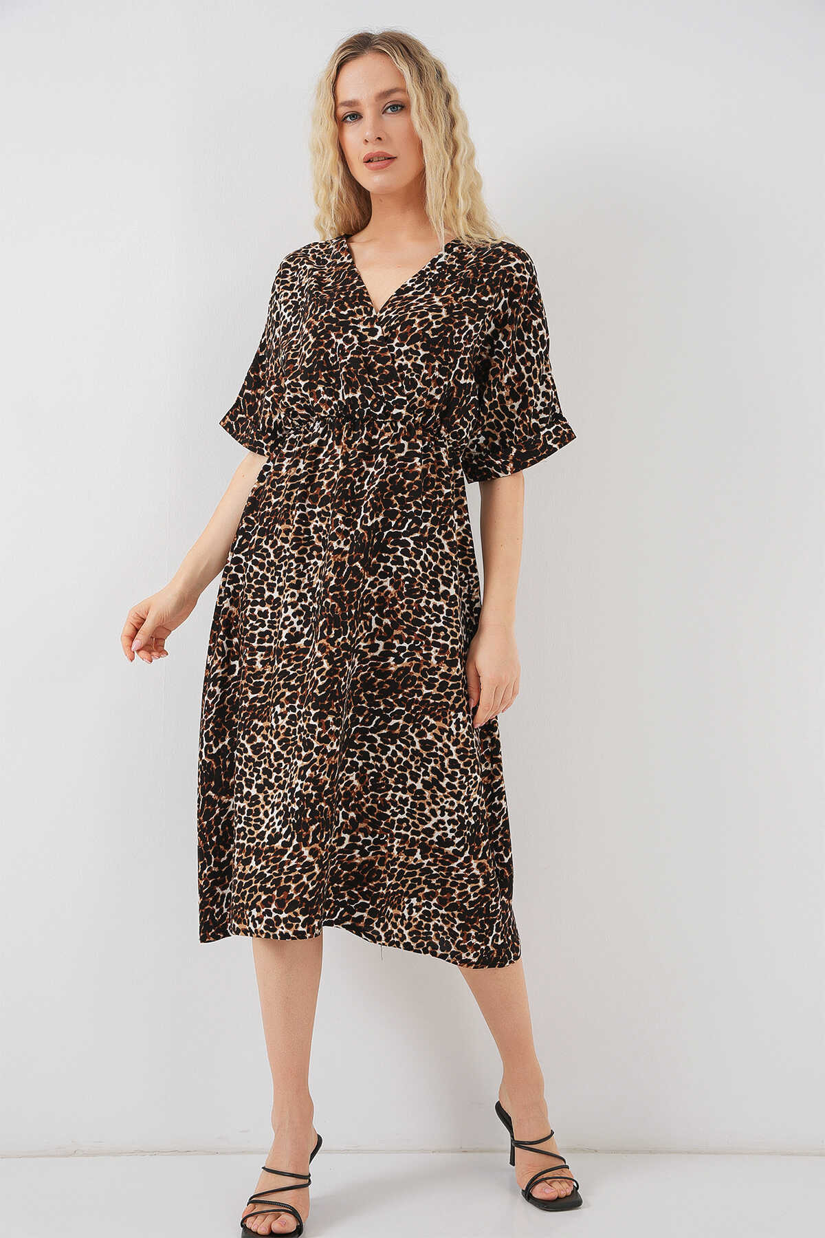 Kadın Desenli Kısa Kol Elbise 2569 - C. Kahverengi