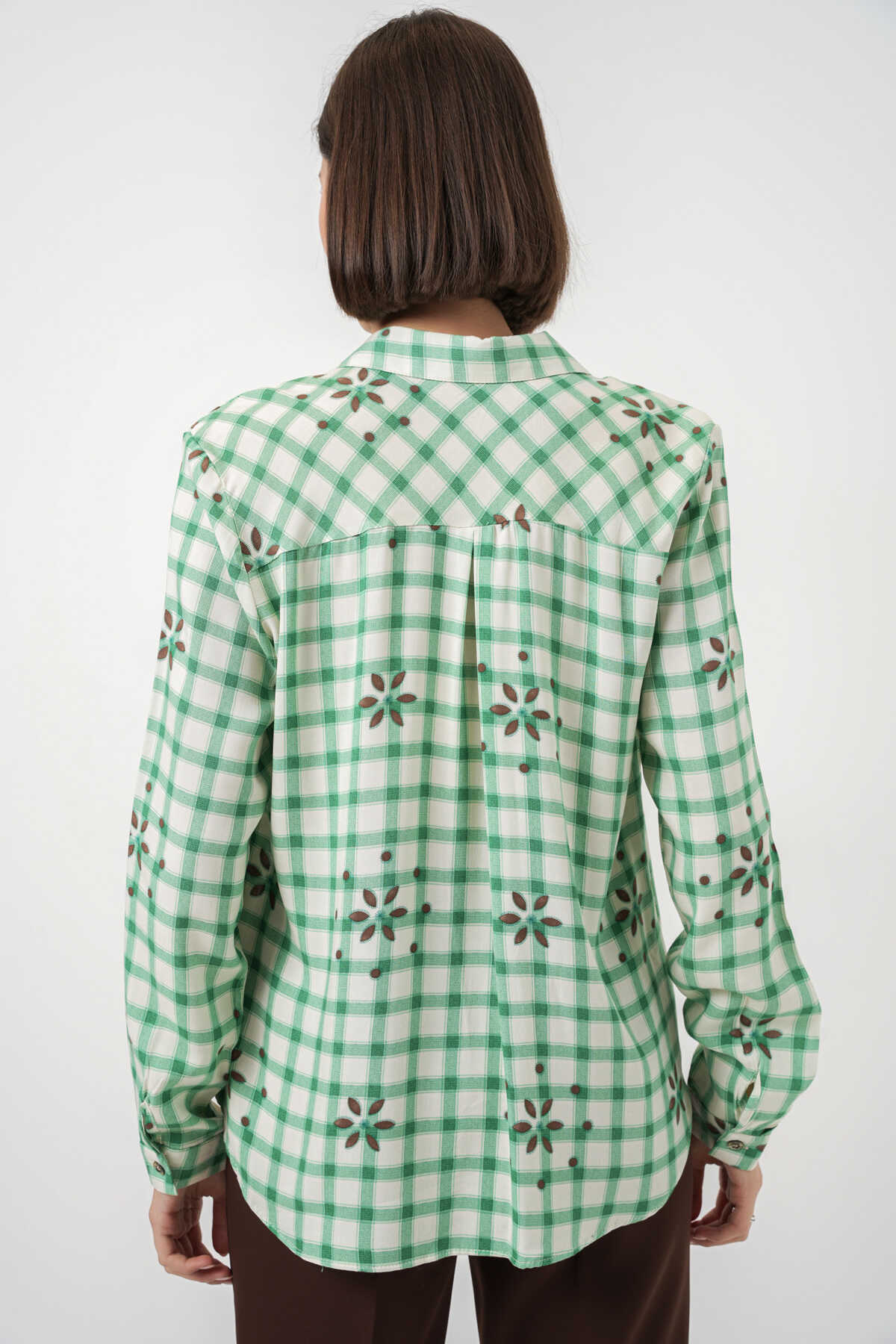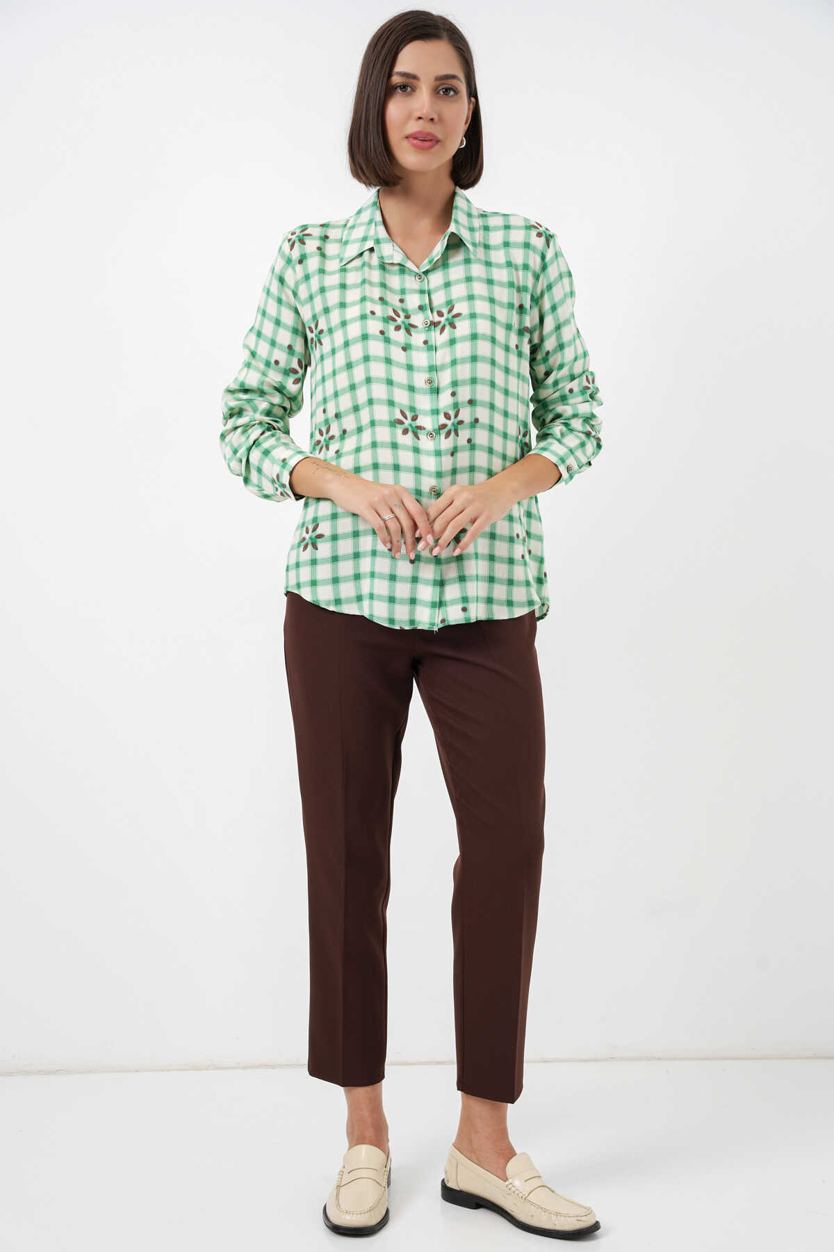 Kadın Desenli Oversize Viskon Gömlek 20371 - Yeşil - Kombin