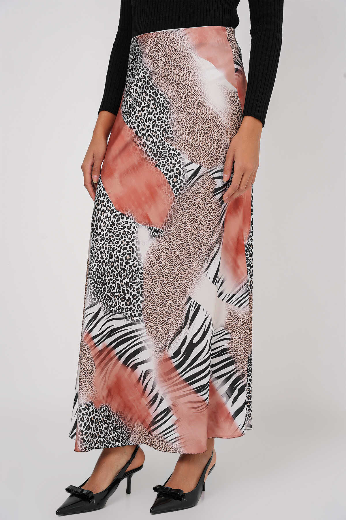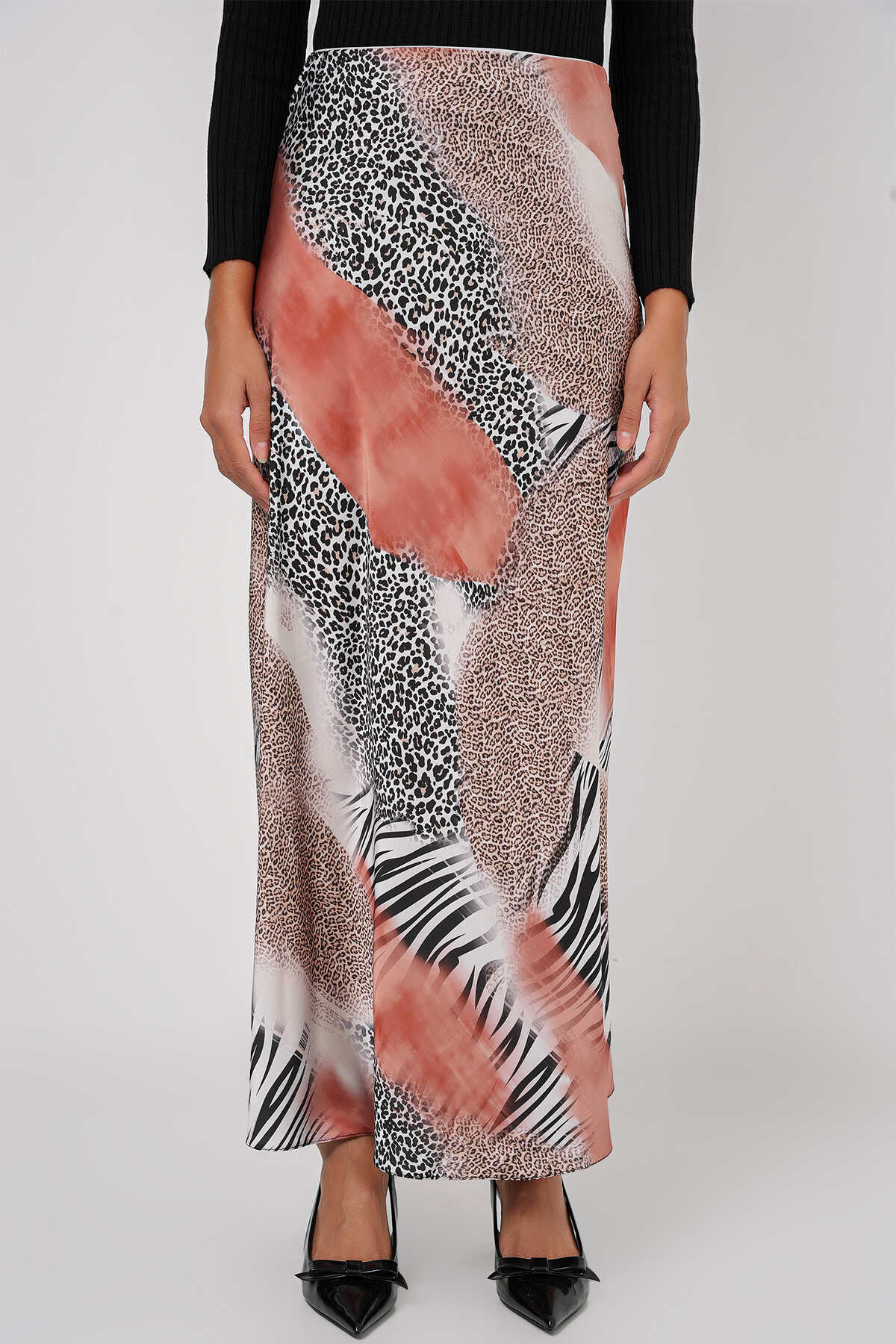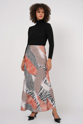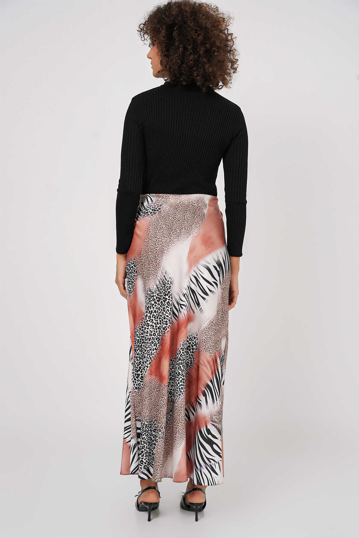 Kadın Desenli Saten Etek 15877 - Turuncu - Kombin