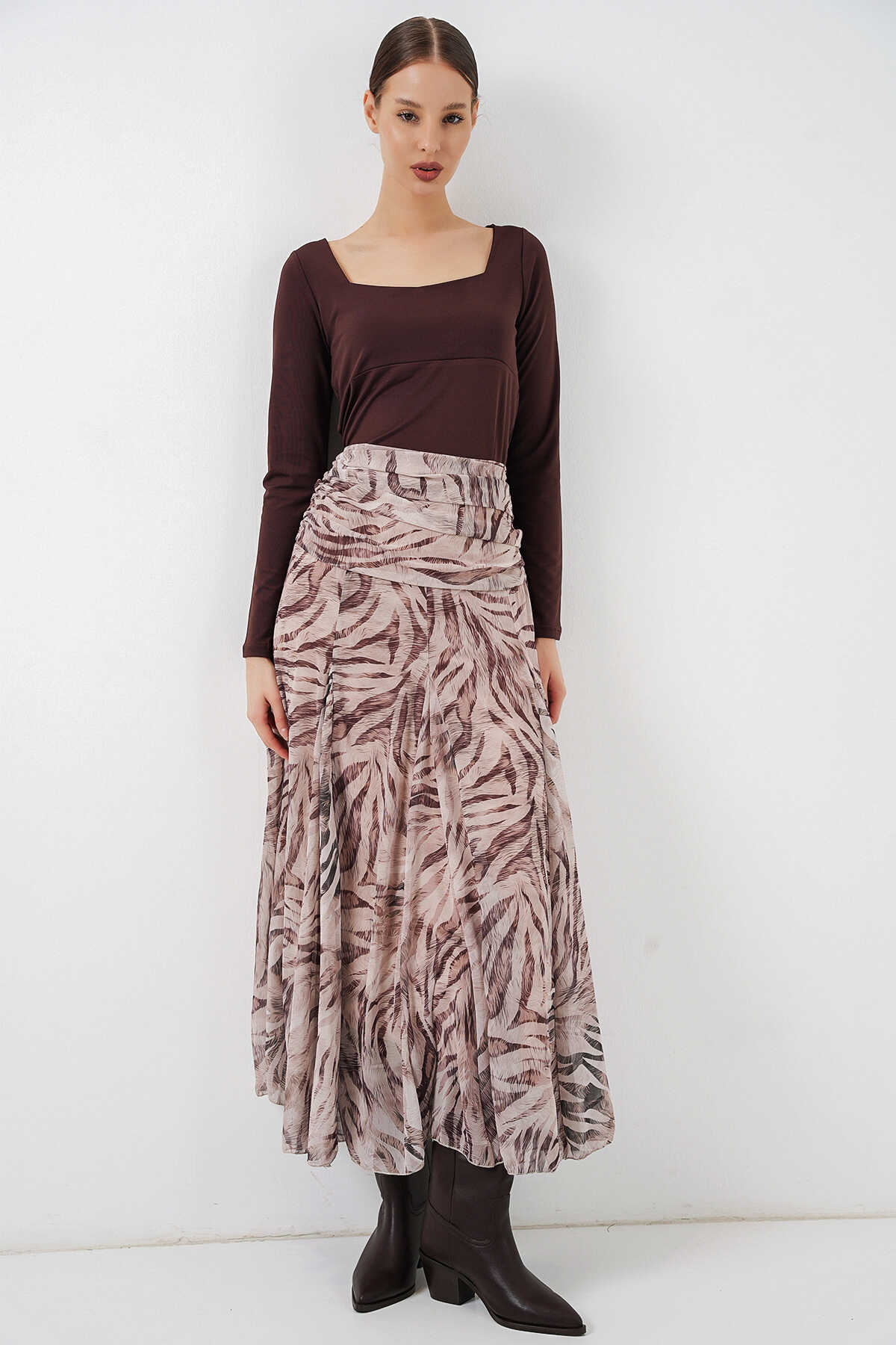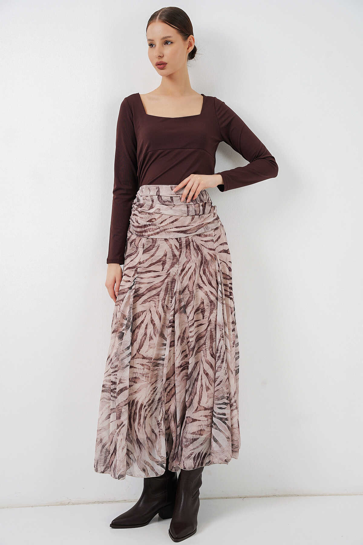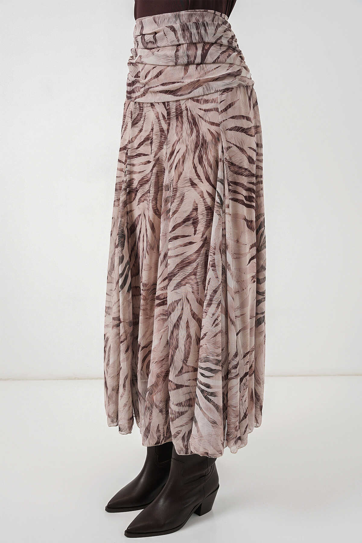 Kadın Desenli Şifon Etek 8057 - Ekru - Kombin