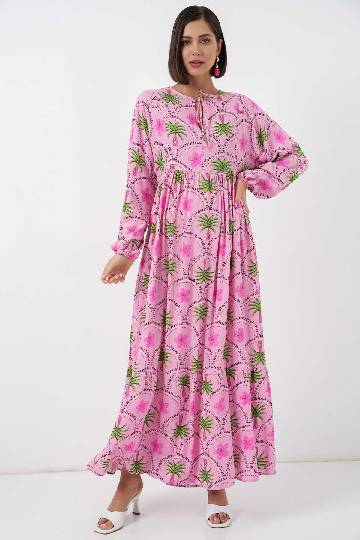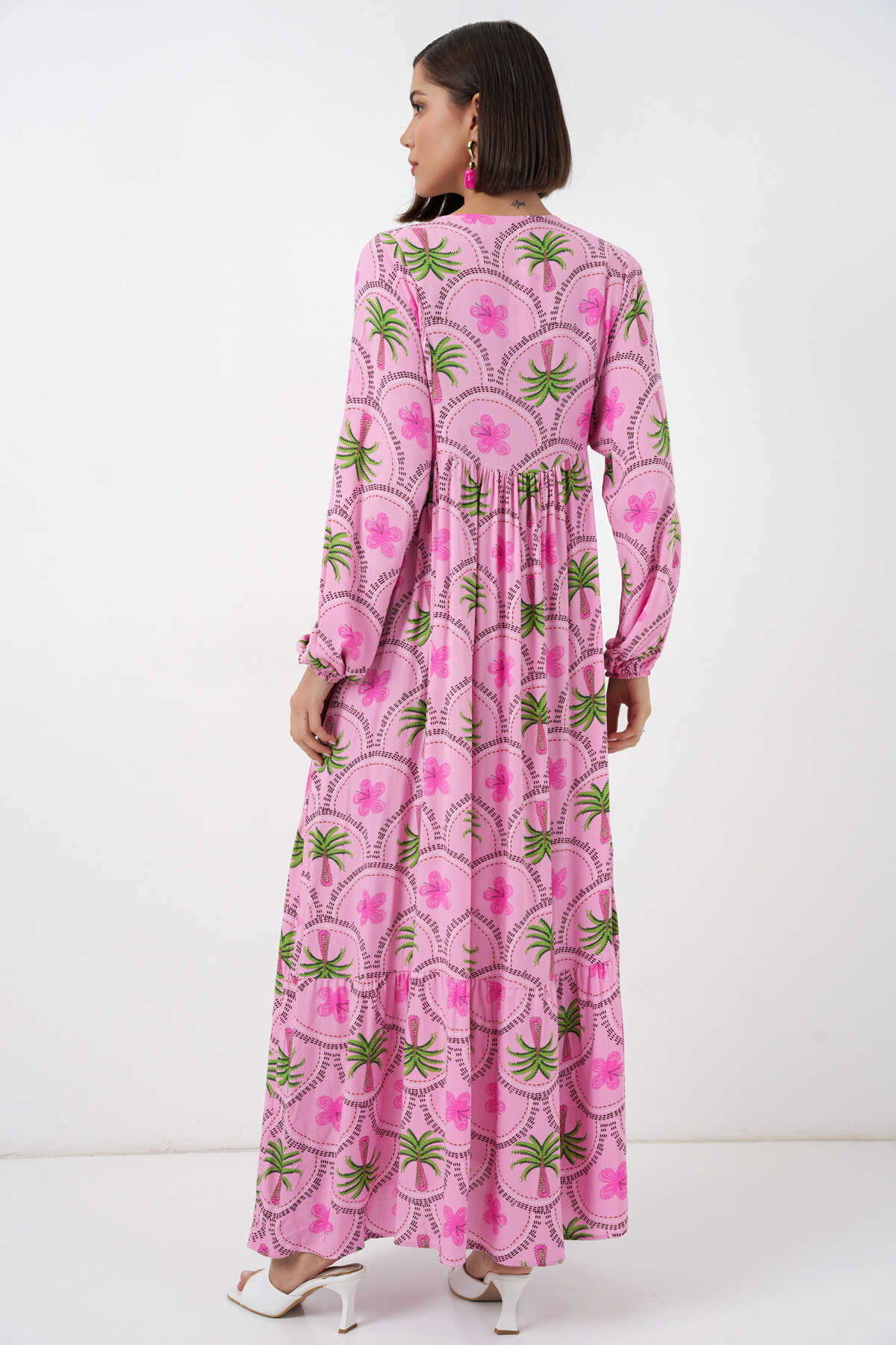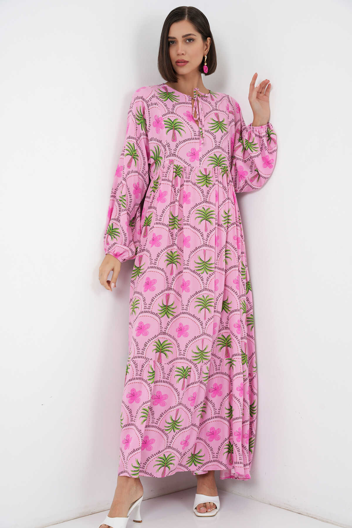 Kadın Desenli Tesettür Elbise 2594 - Pembe
