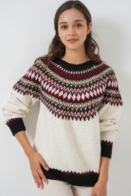 Kadın Desenli Triko Kazak 15932 - Ekru - Kombin