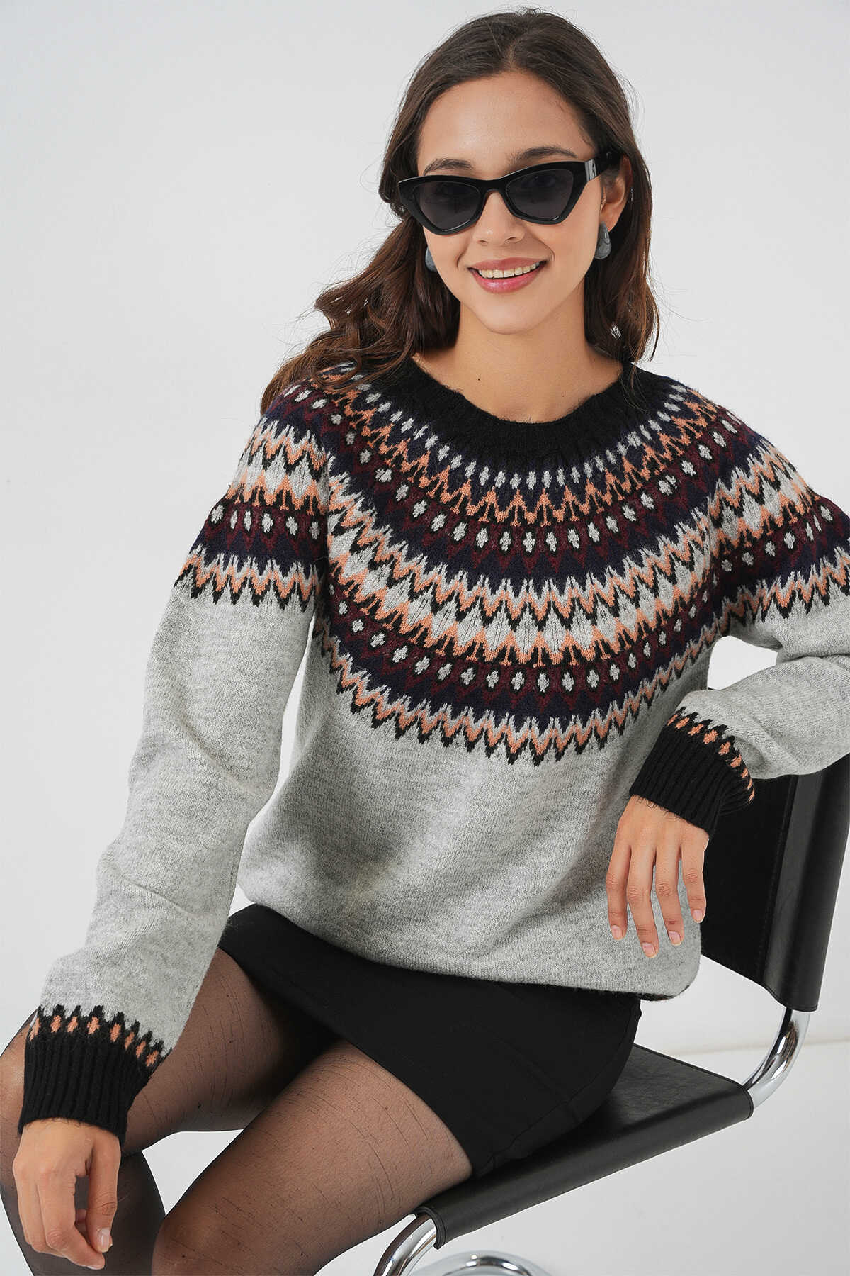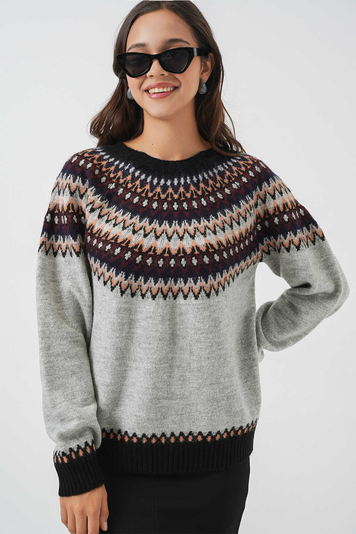 Kadın Desenli Triko Kazak 15932 - Gri - Kombin
