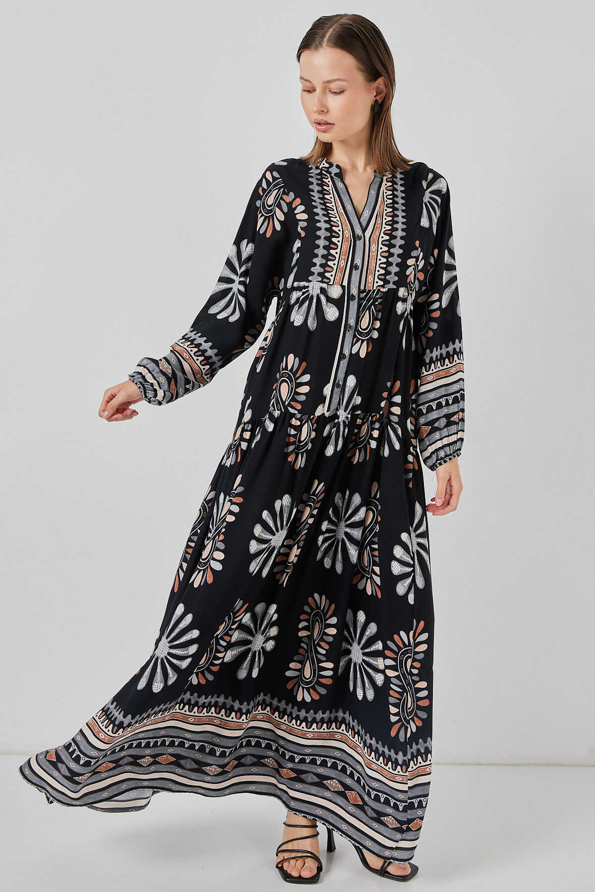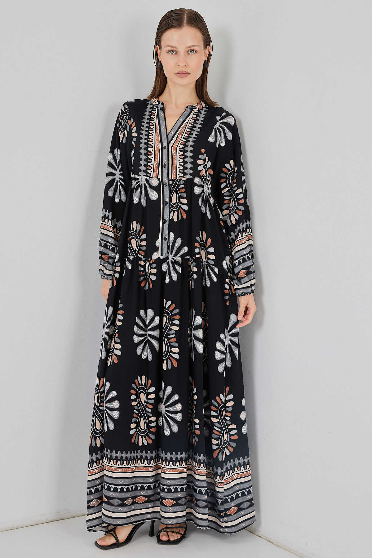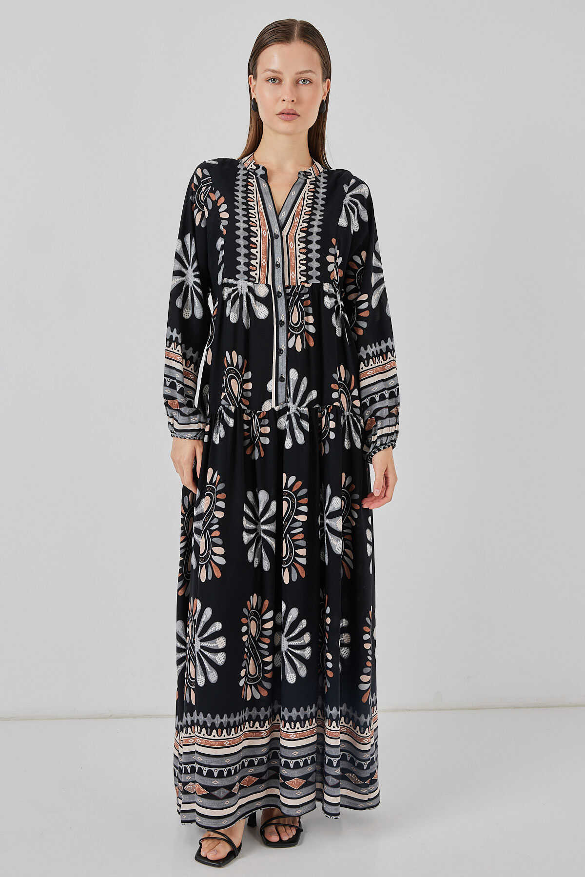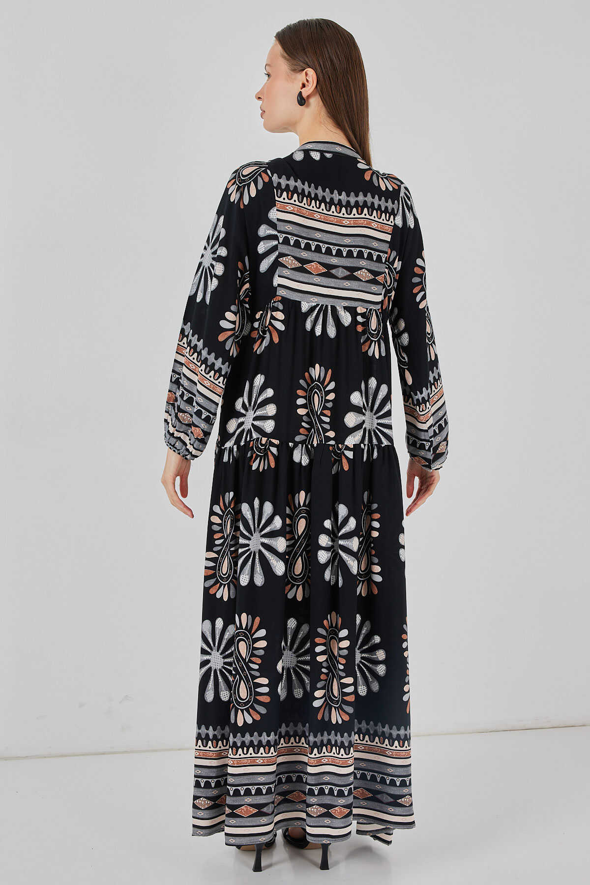 Kadın Desenli Uzun Tesettür Elbise 2585 - A.Siyah - Kombin
