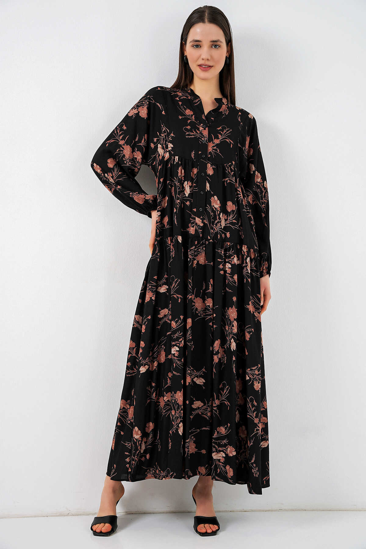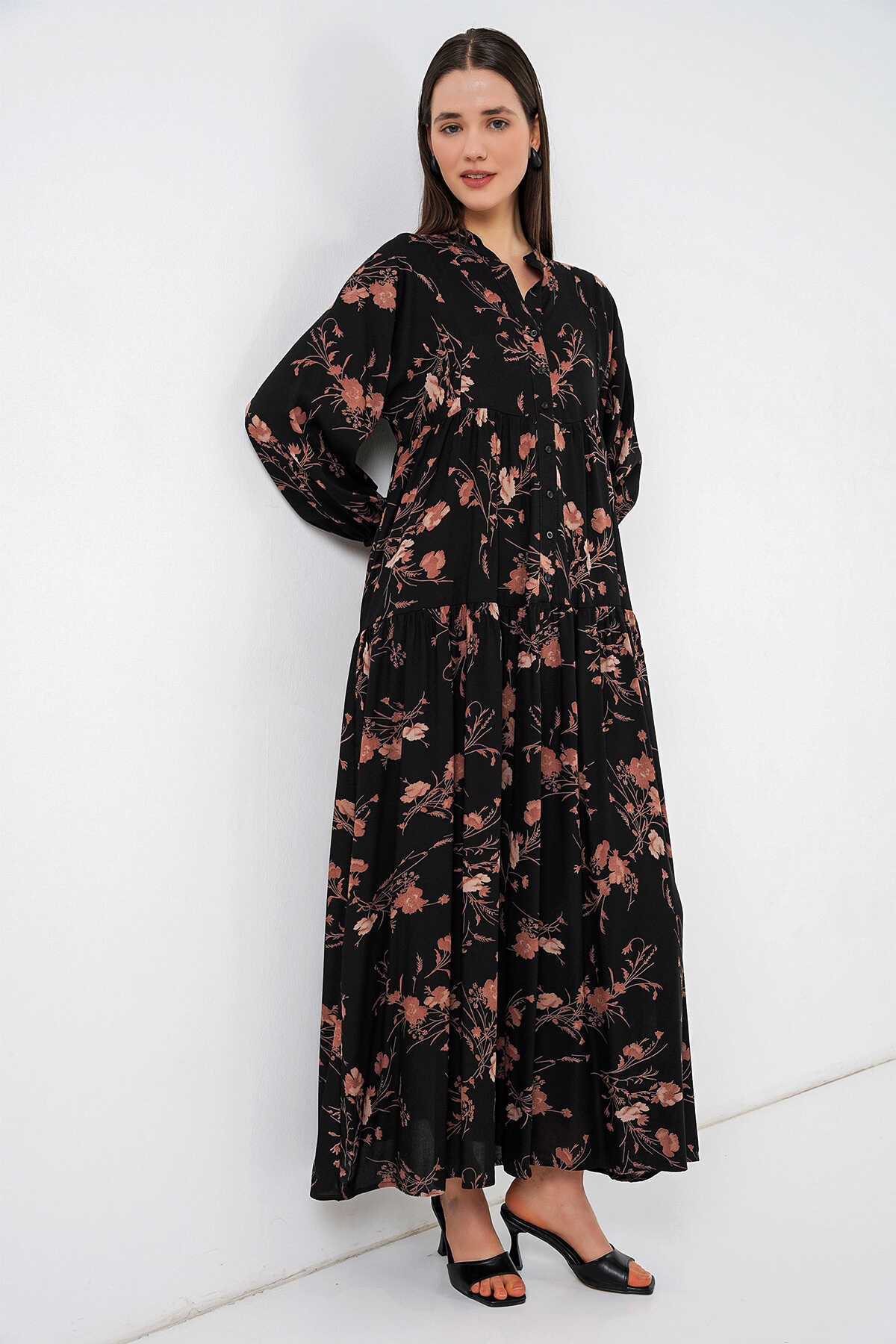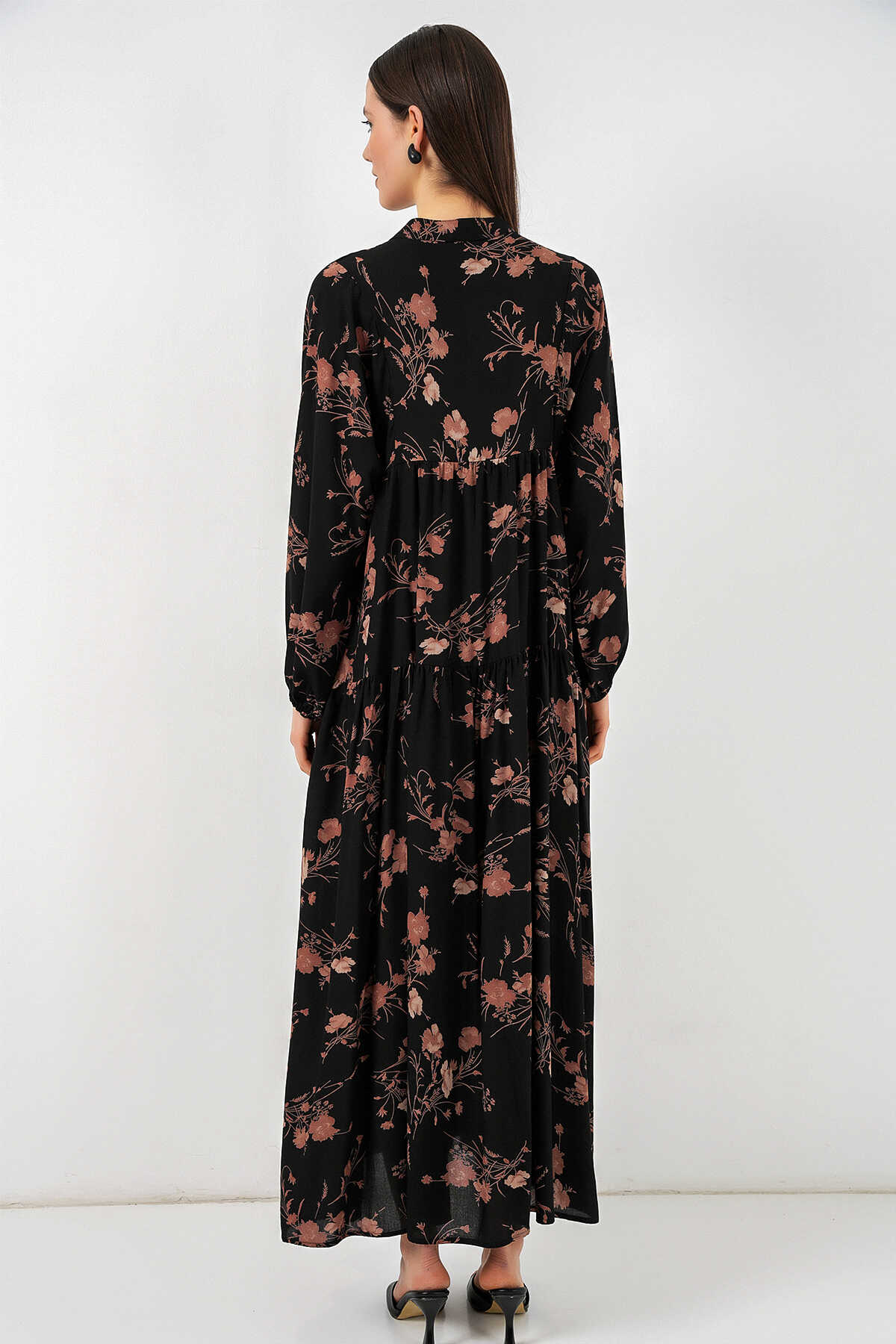 Kadın Desenli Uzun Tesettür Elbise 2585 - B. Siyah - Kombin