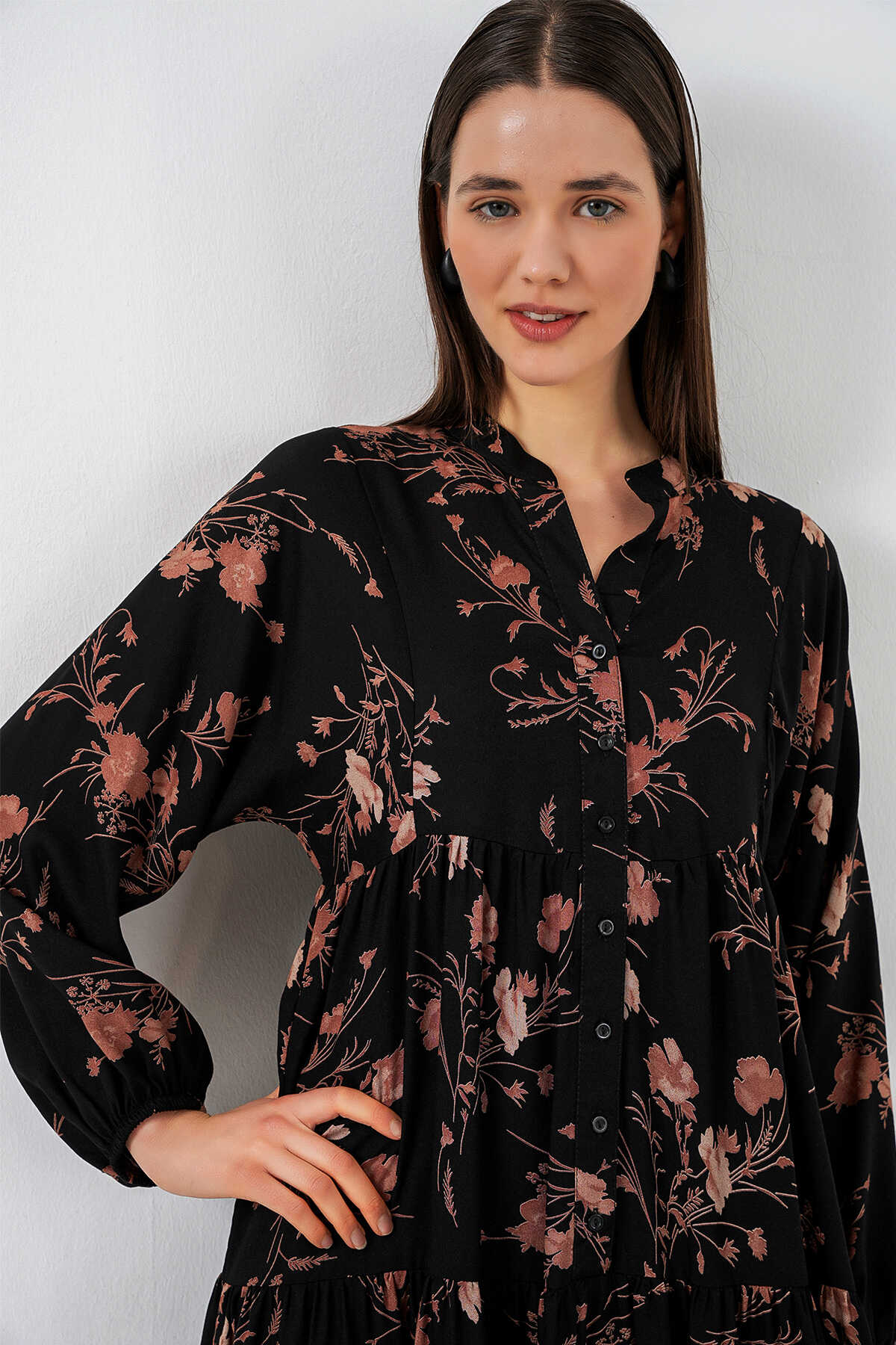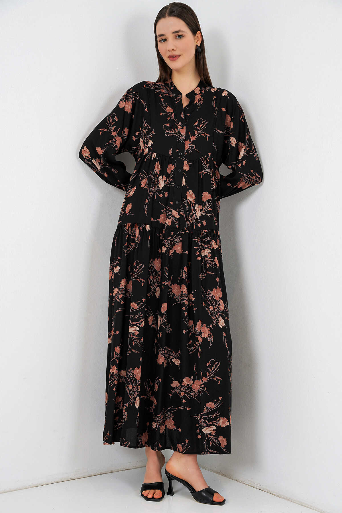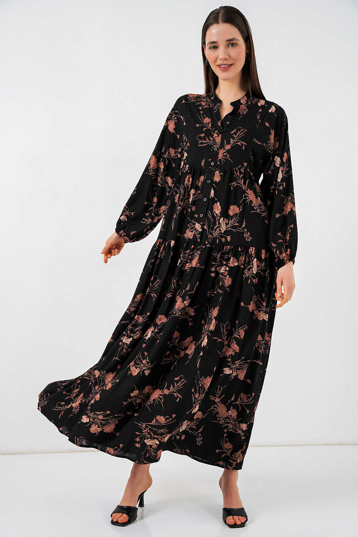 Kadın Desenli Uzun Tesettür Elbise 2585 - B. Siyah - Kombin