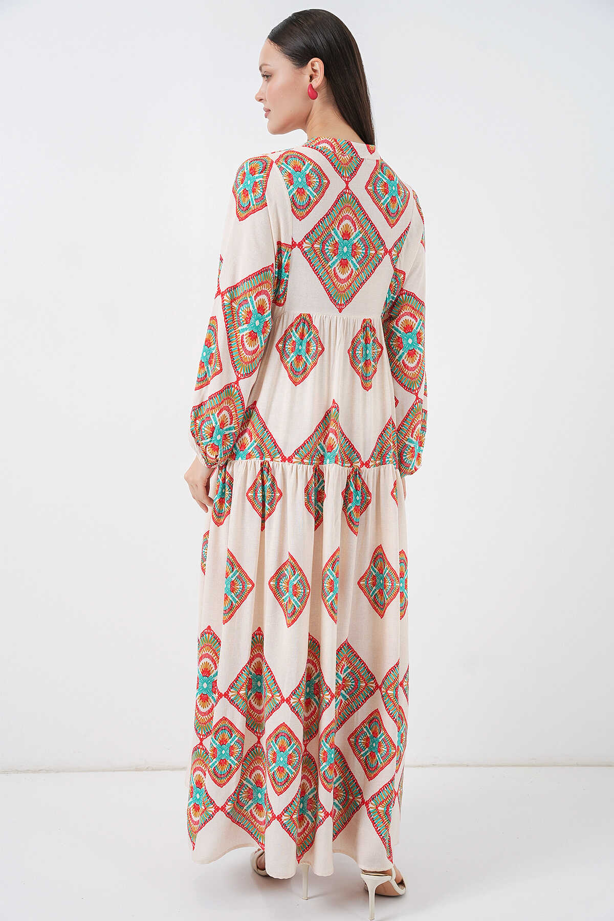 Kadın Desenli Uzun Tesettür Elbise 2585 - Bej