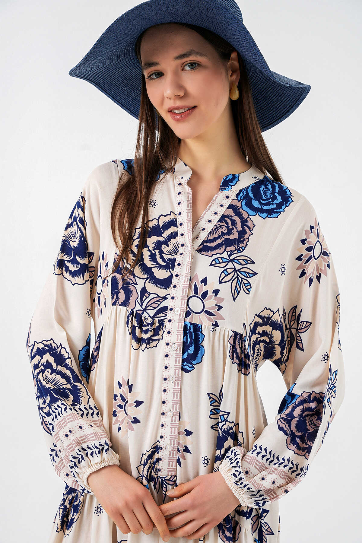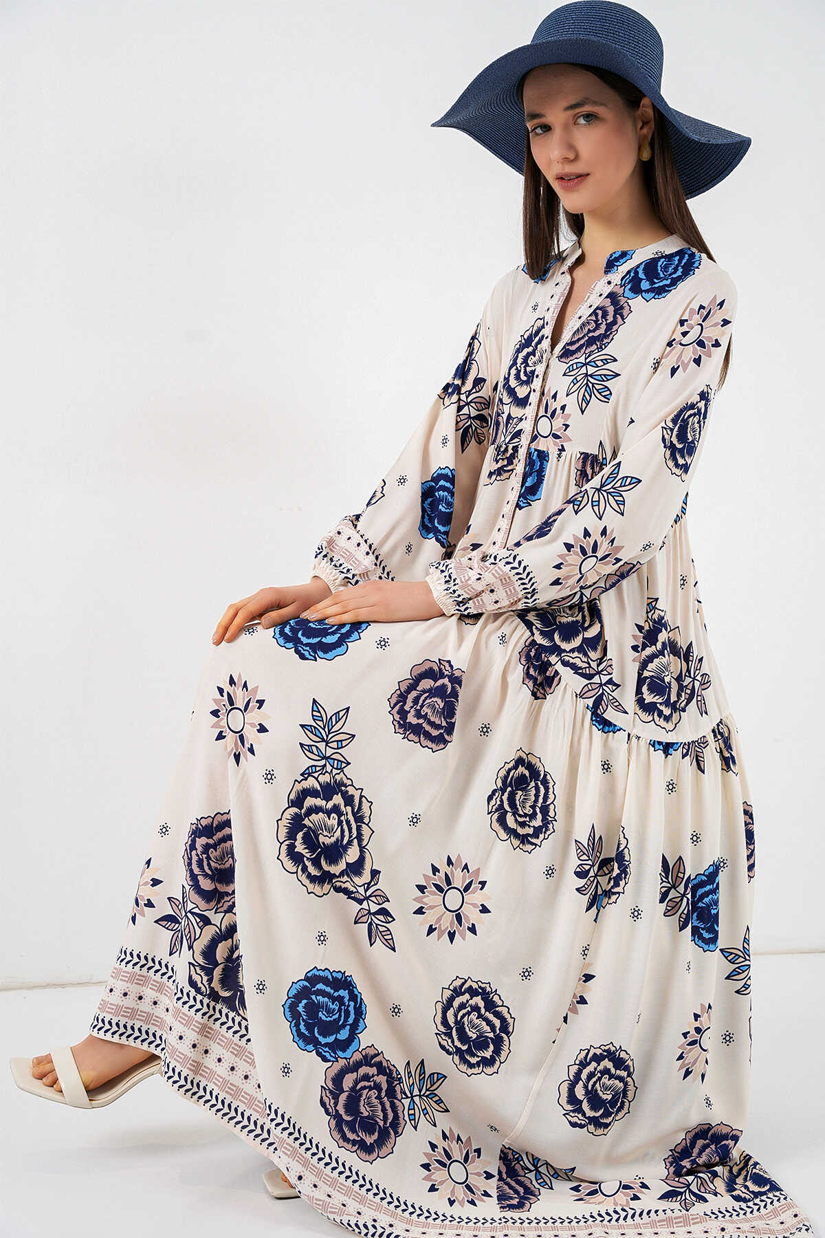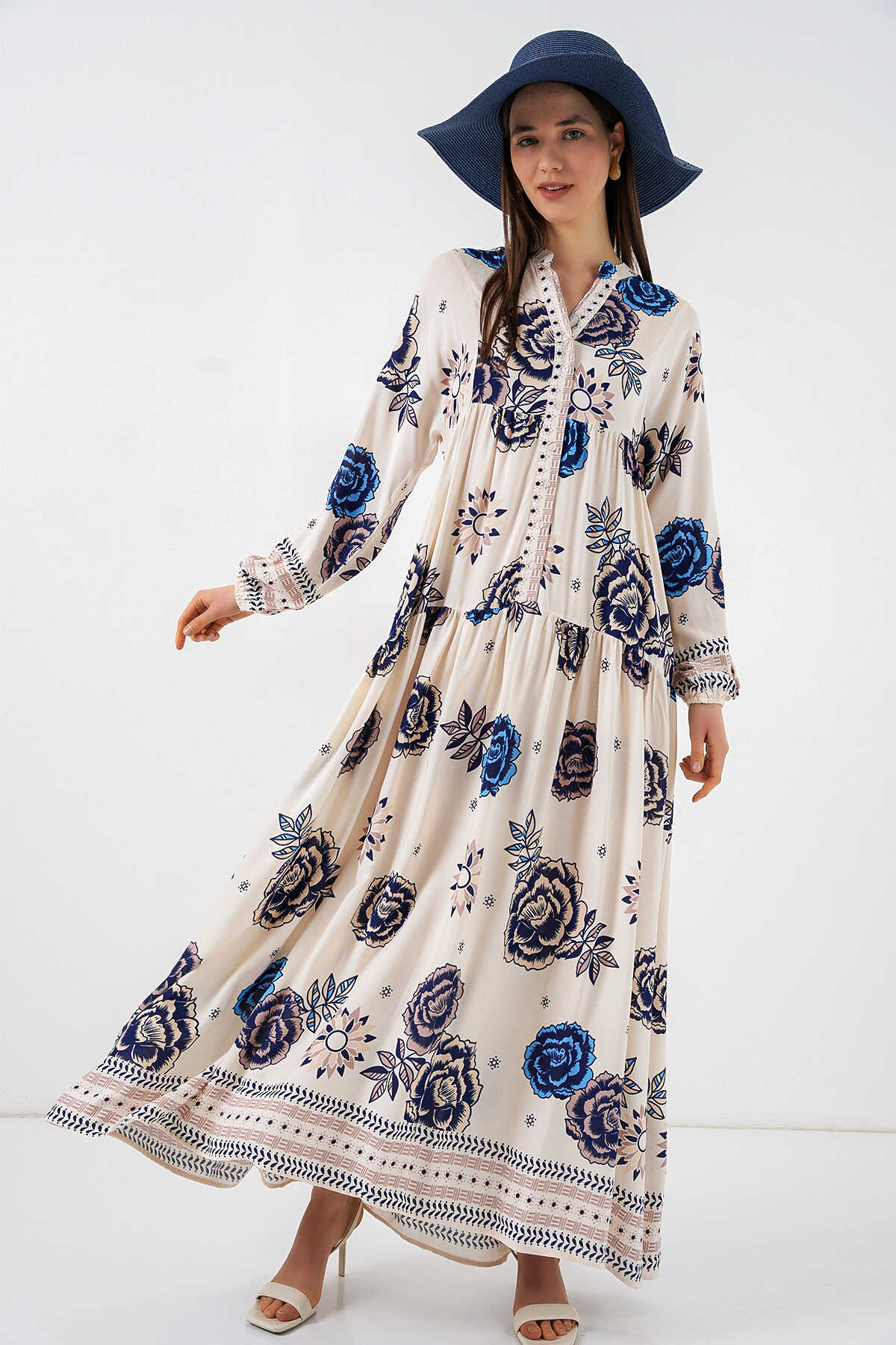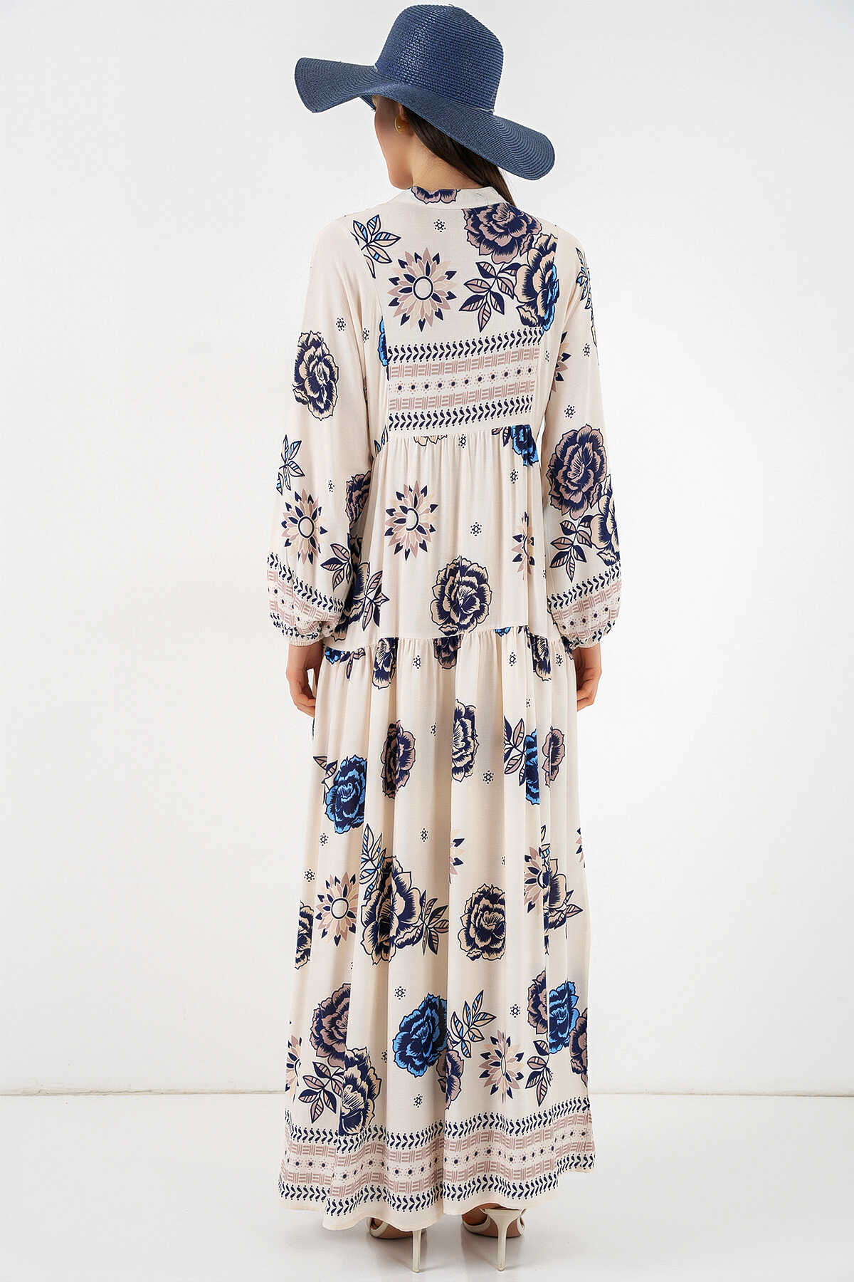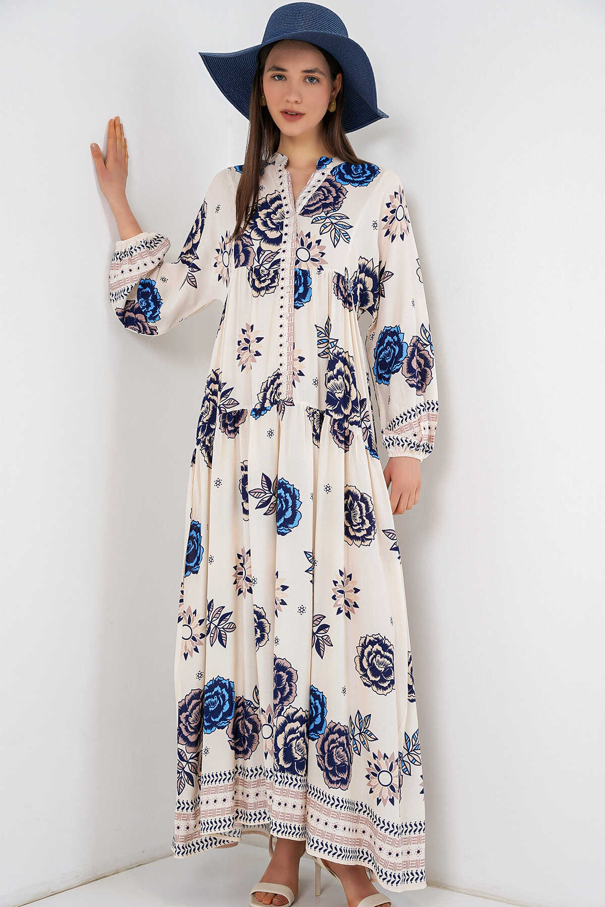 Kadın Desenli Uzun Tesettür Elbise 2585 - B.Lacivert - Kombin