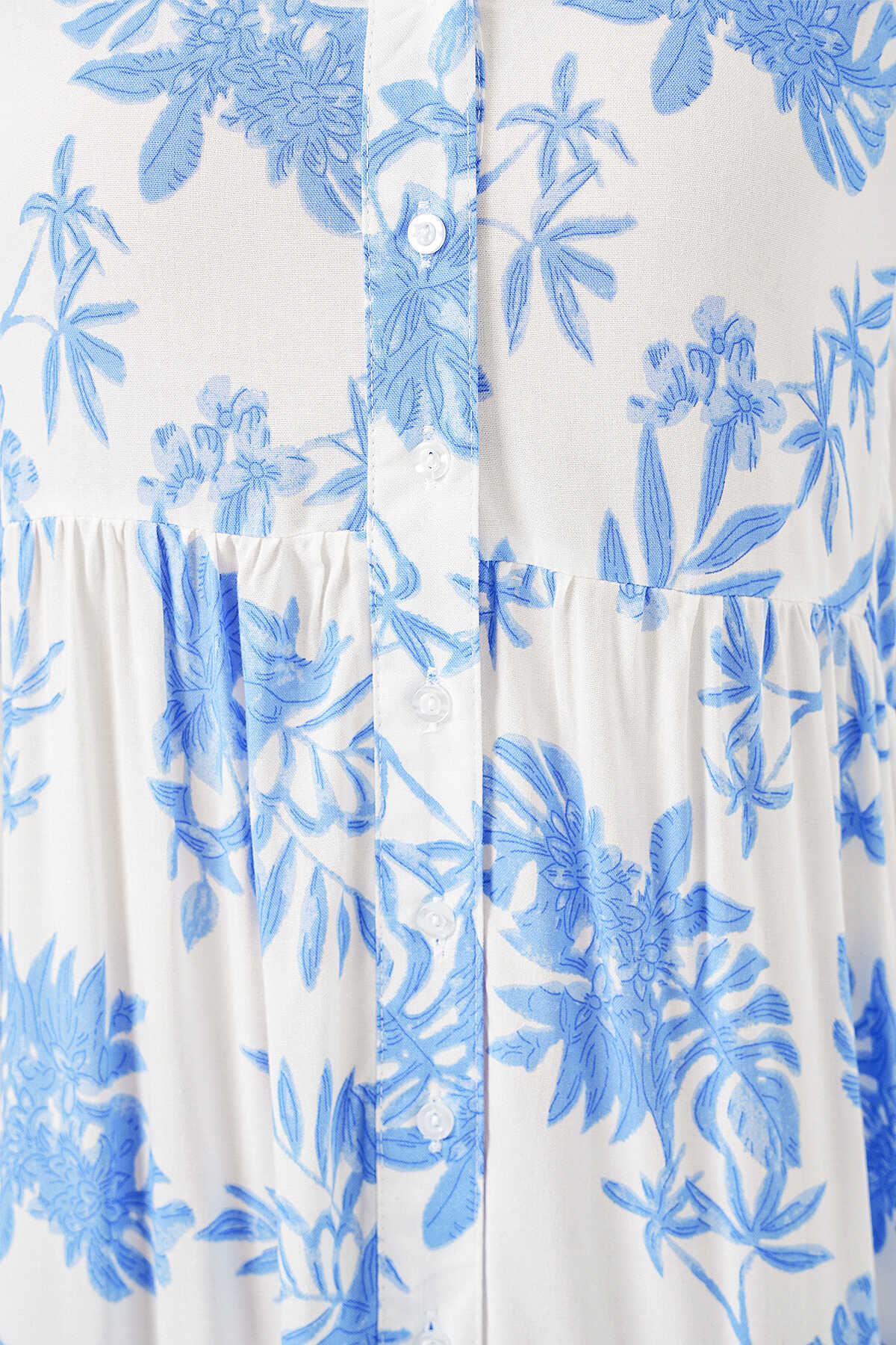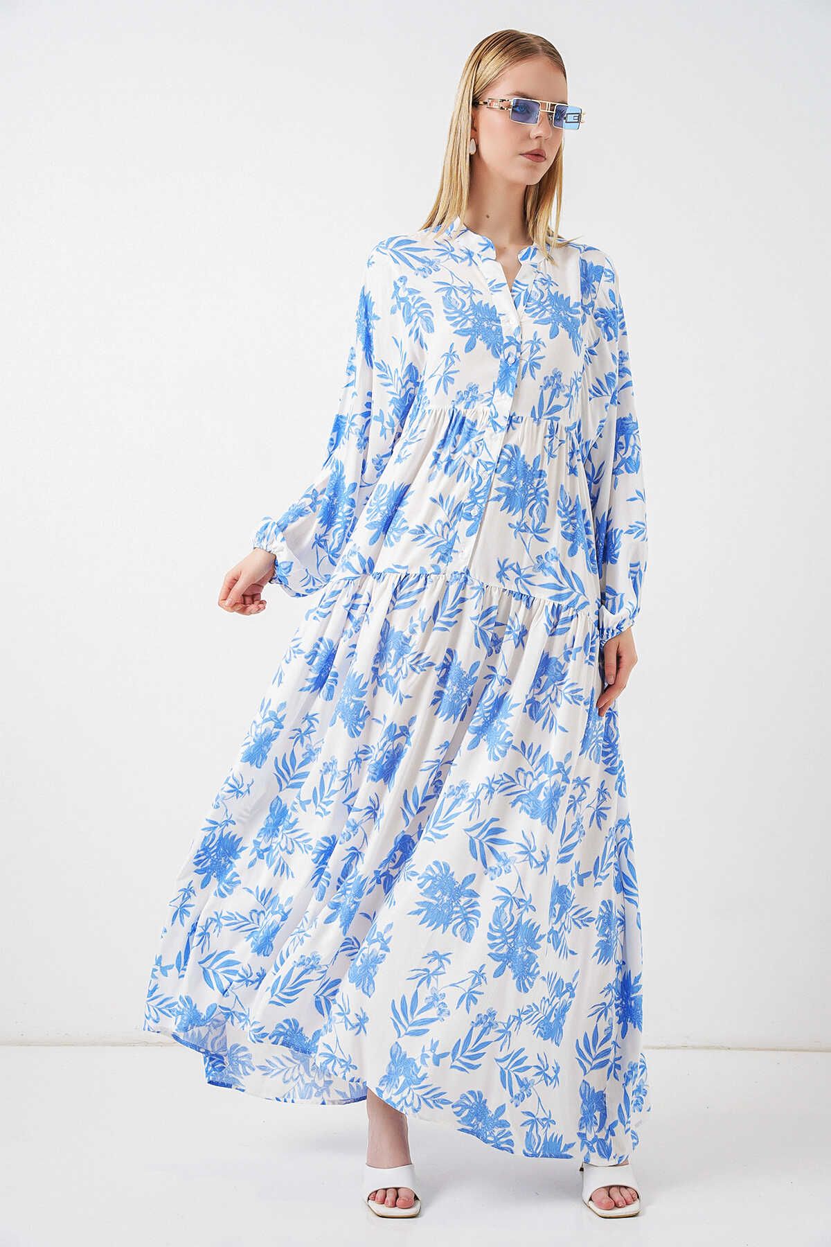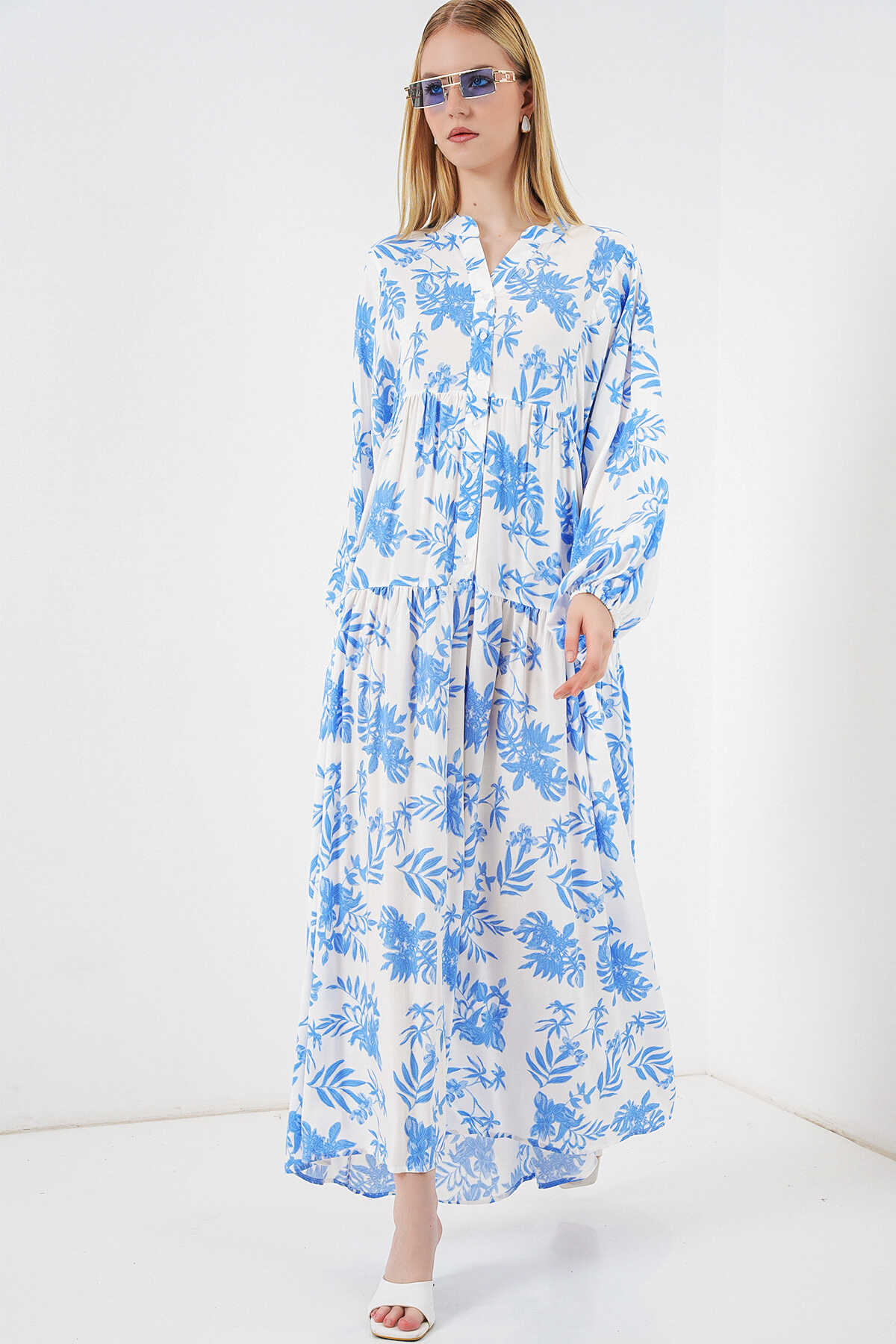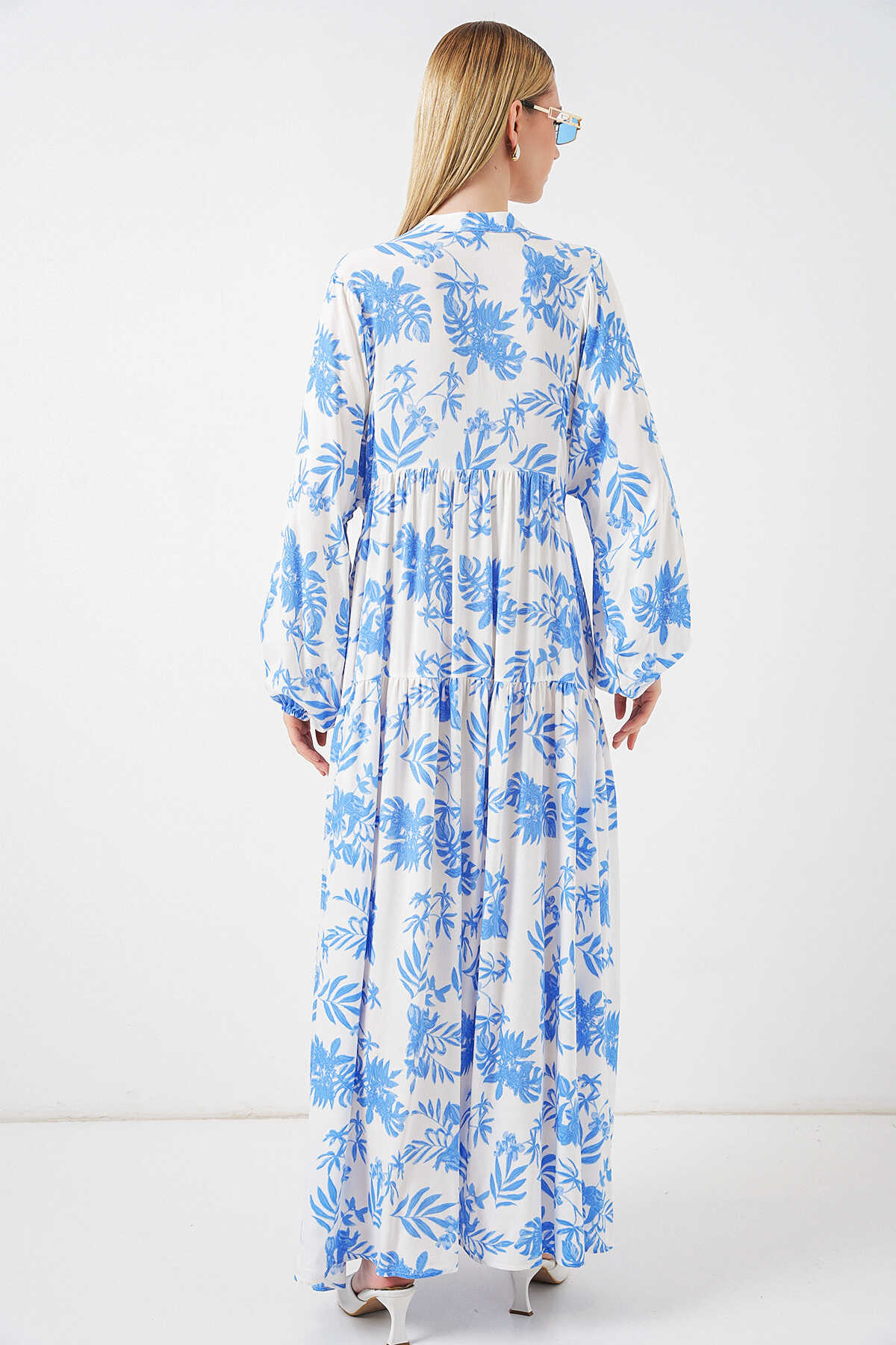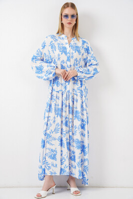 Kadın Desenli Uzun Tesettür Elbise 2585 - Buz Mavi