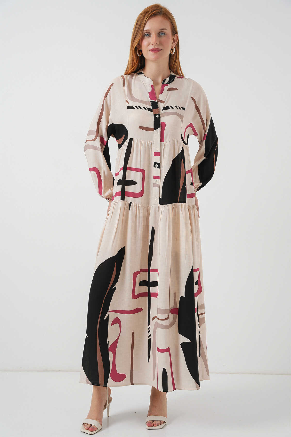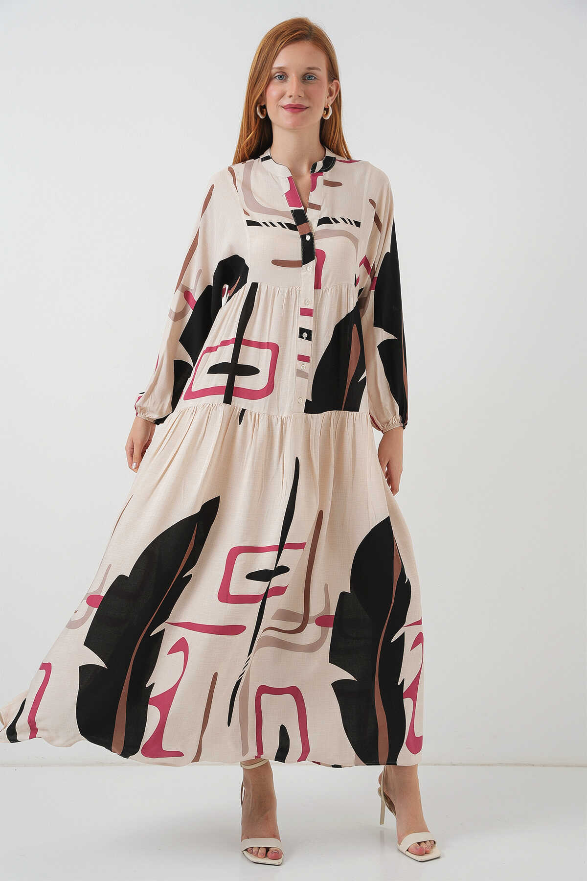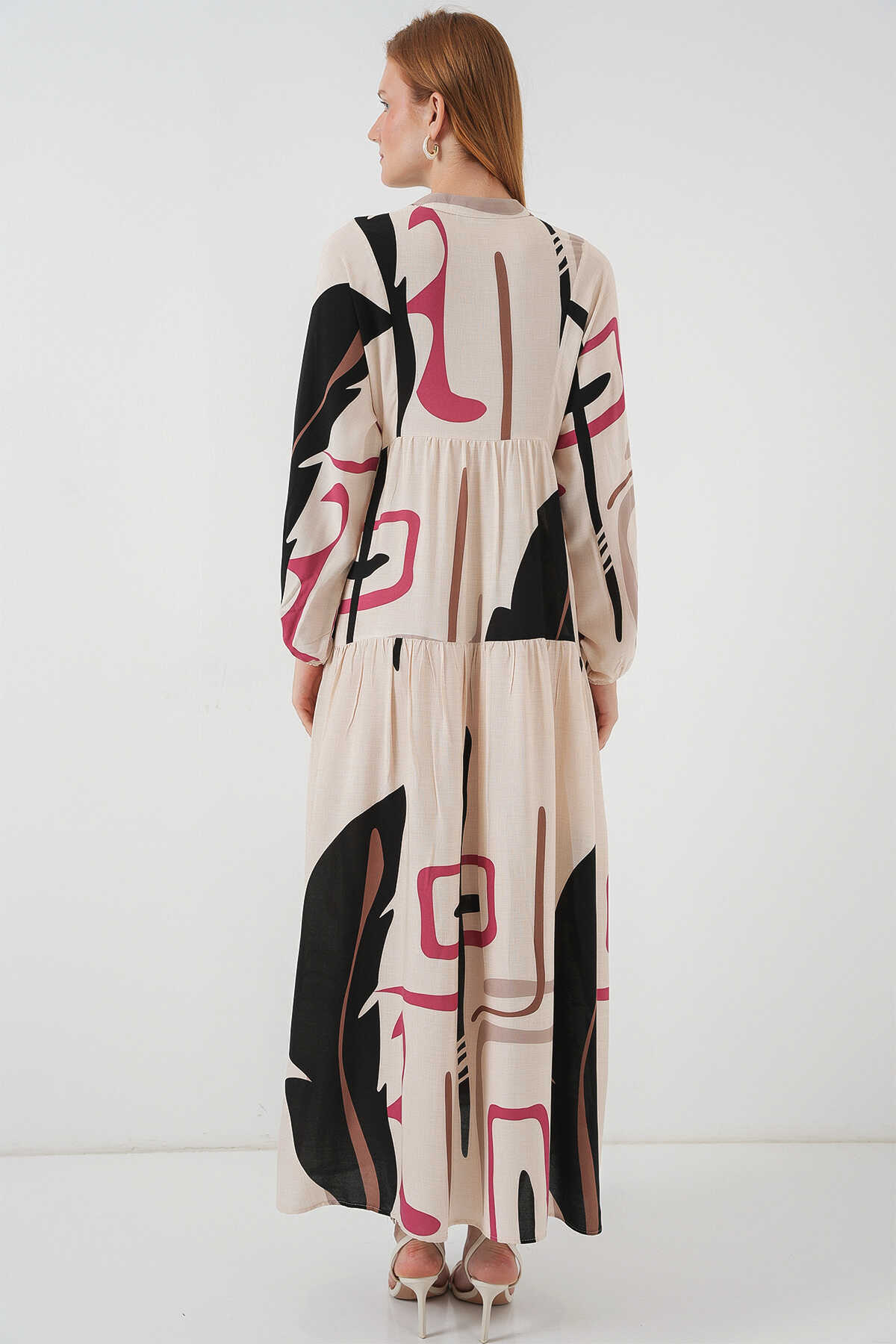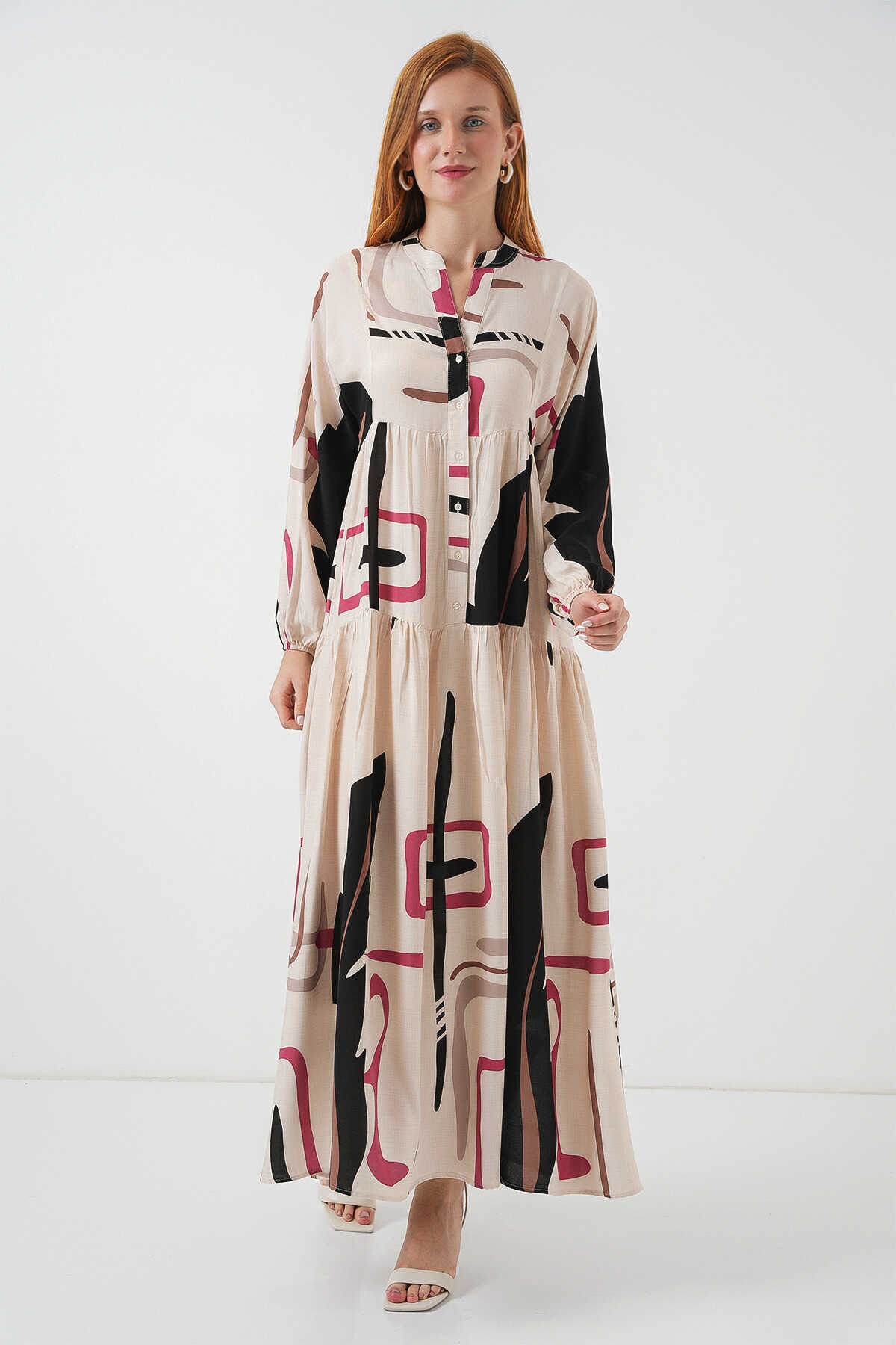 Kadın Desenli Uzun Tesettür Elbise 2585 - C.Krem - Kombin