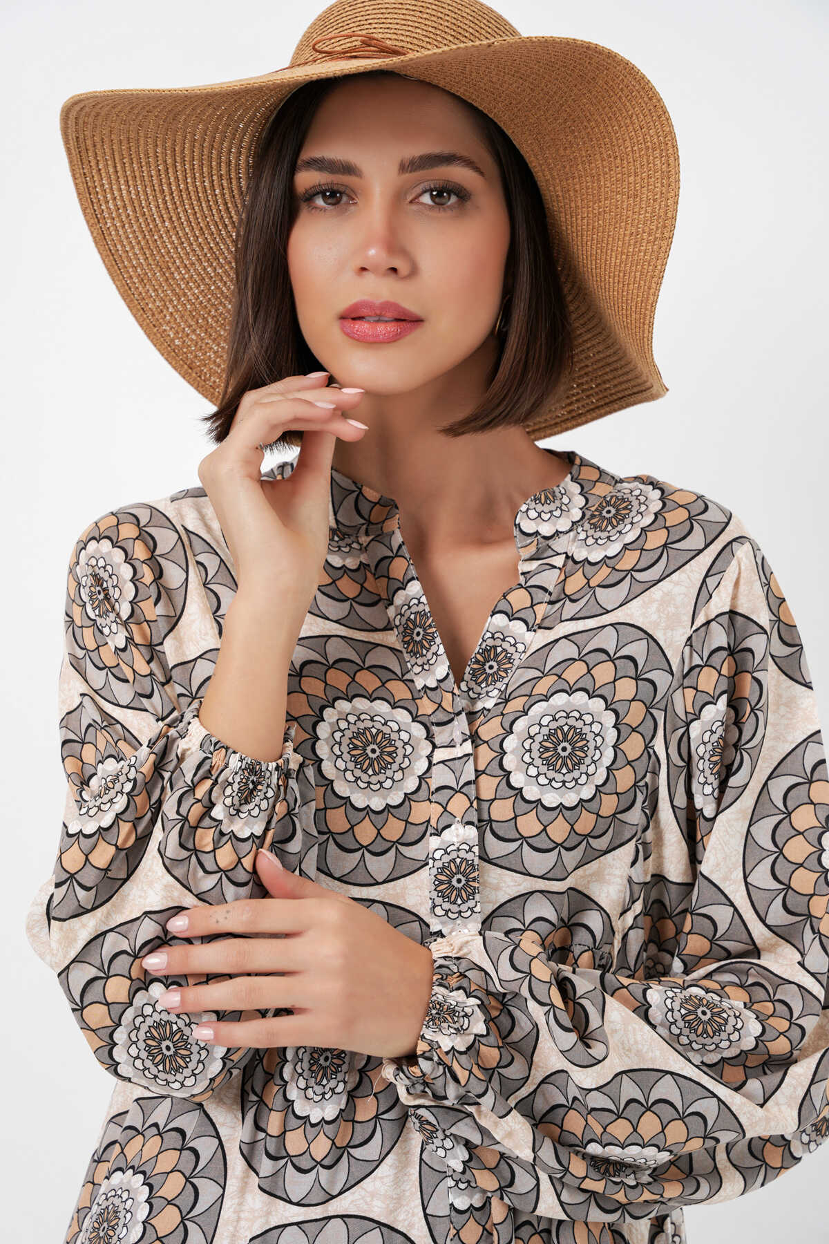 Kadın Desenli Uzun Tesettür Elbise 2585 - C. Bej