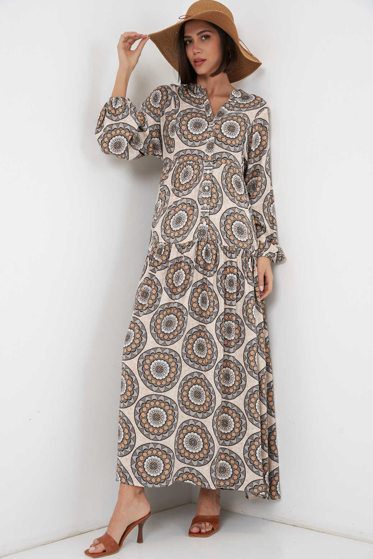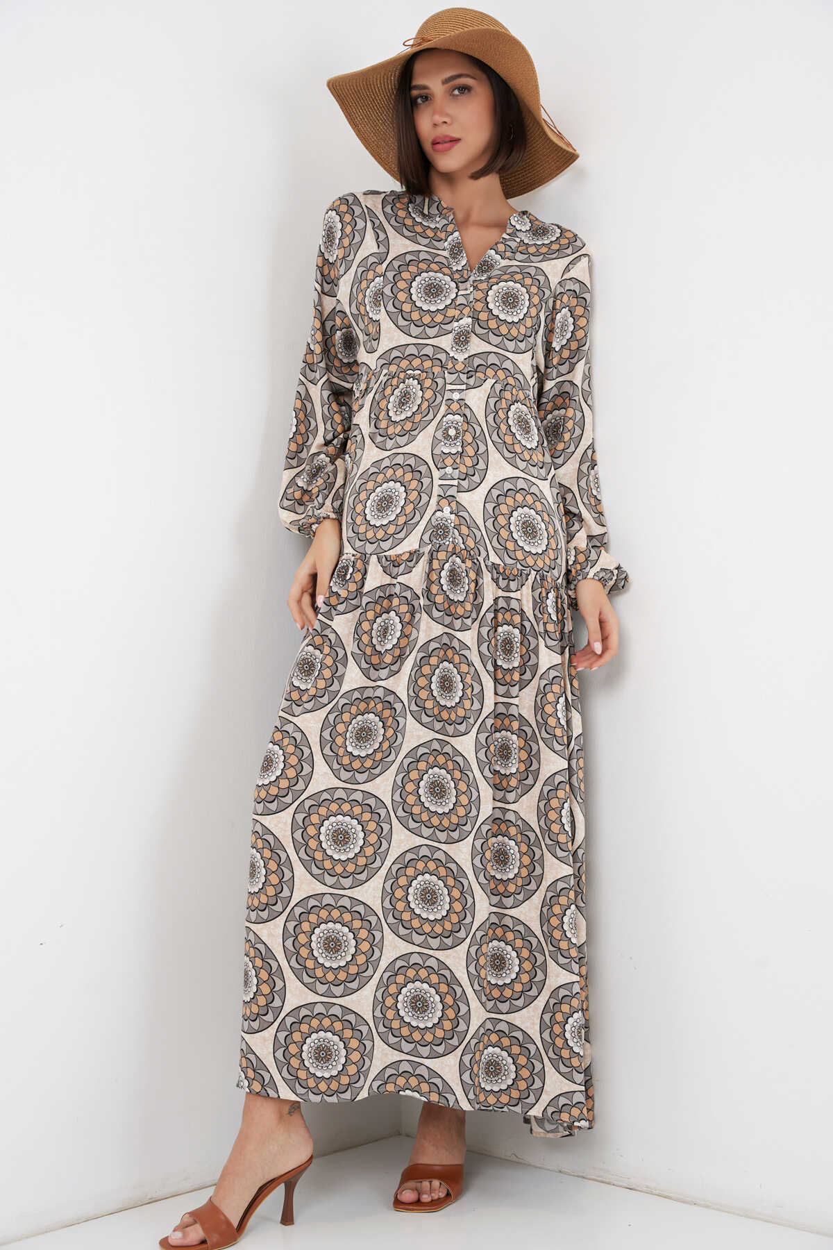 Kadın Desenli Uzun Tesettür Elbise 2585 - C. Bej - Kombin