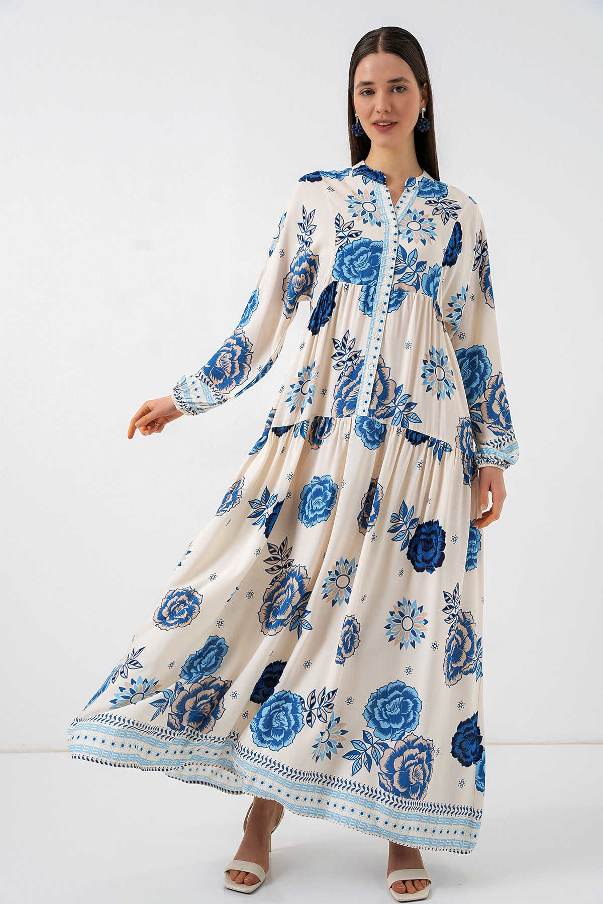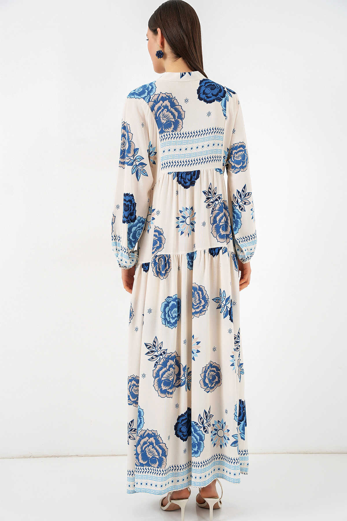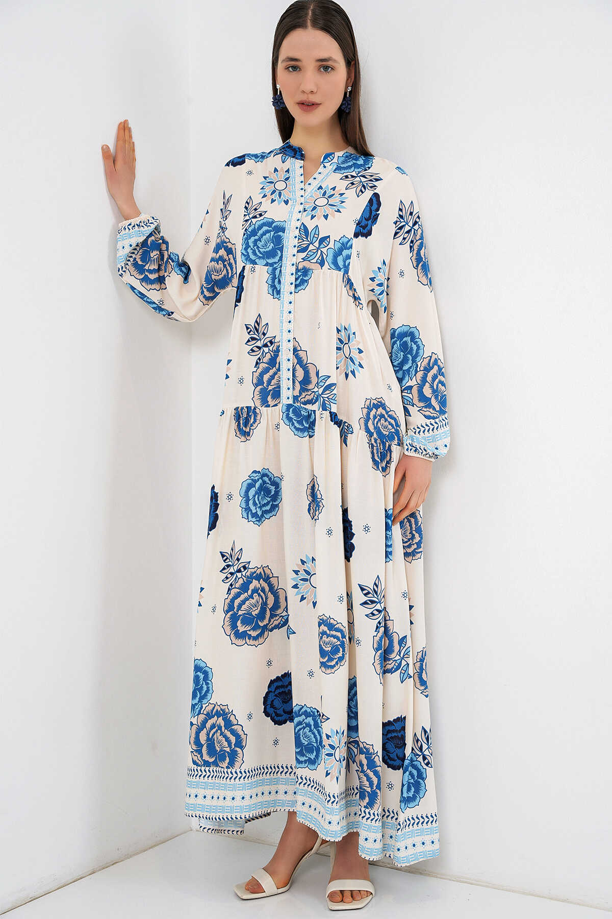 Kadın Desenli Uzun Tesettür Elbise 2585 - C.Saks - Kombin