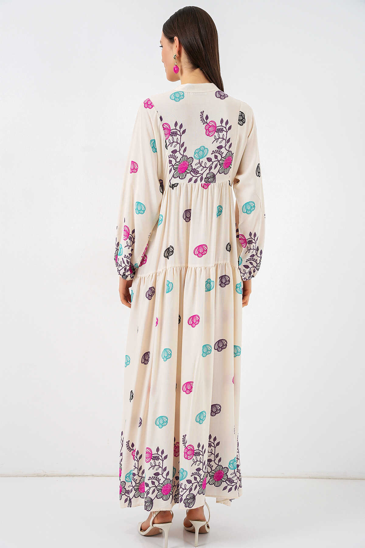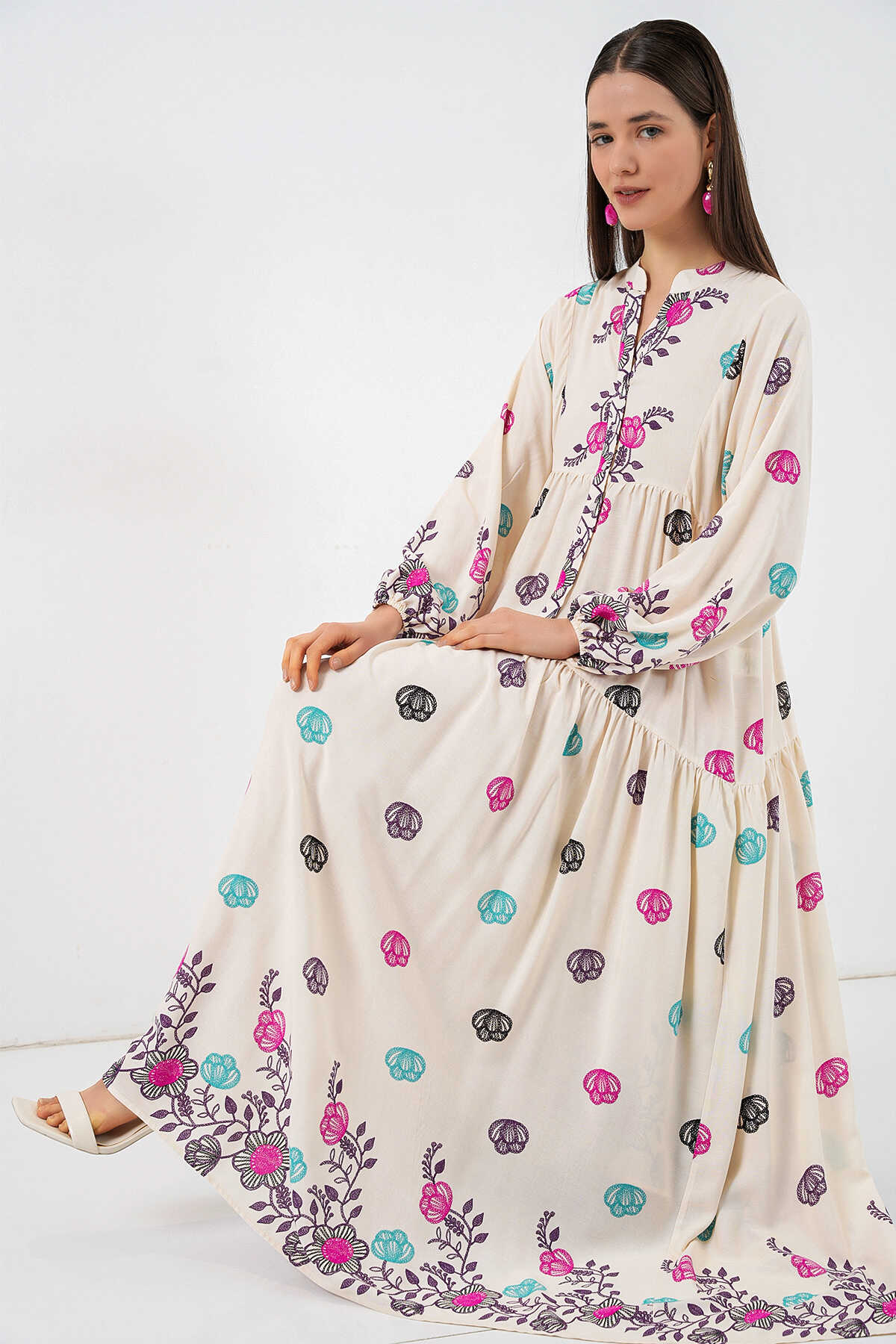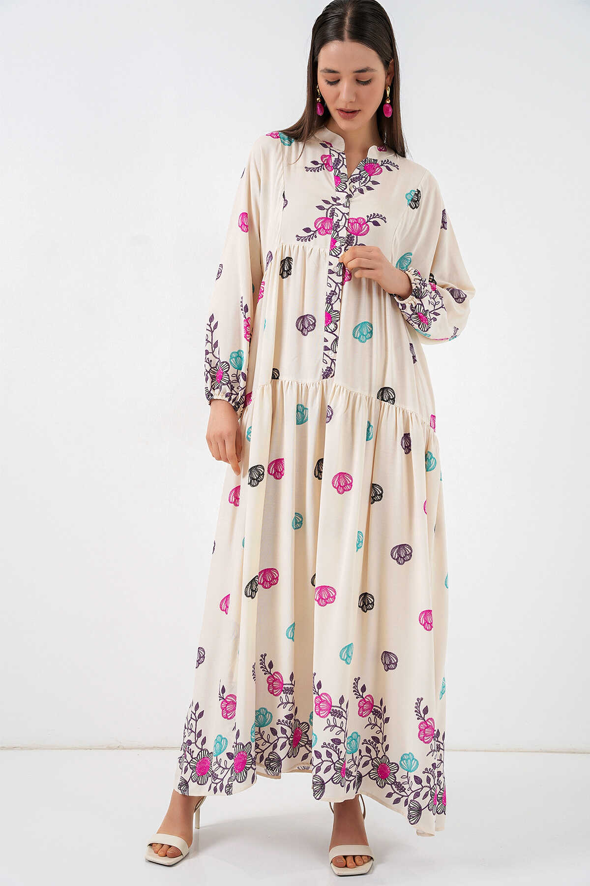 Kadın Desenli Uzun Tesettür Elbise 2585 - C. Fuşya