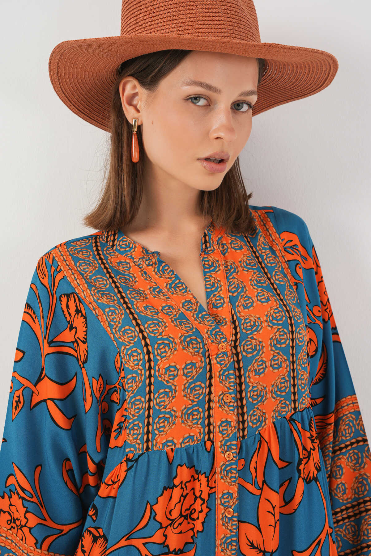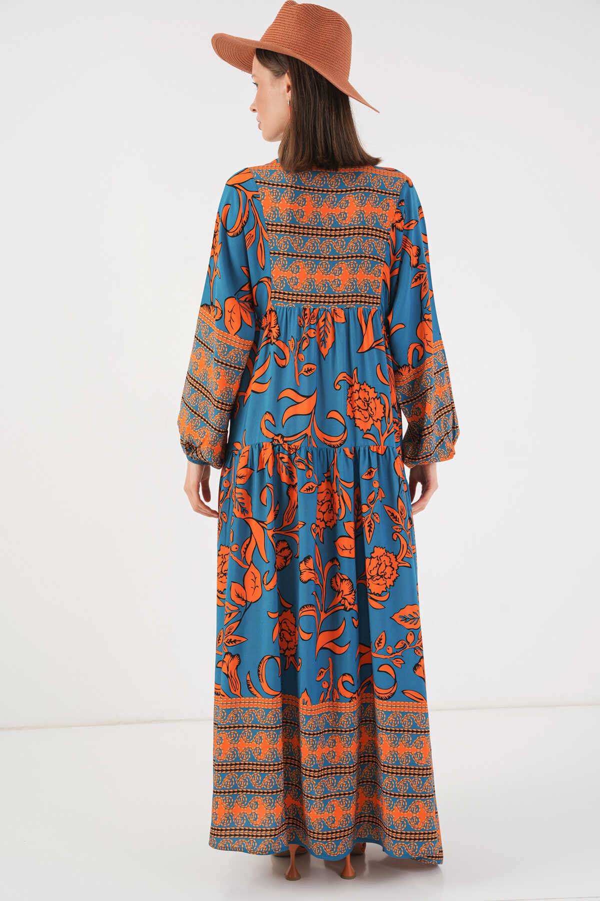 Kadın Desenli Uzun Tesettür Elbise 2585 - C. Turuncu - Kombin