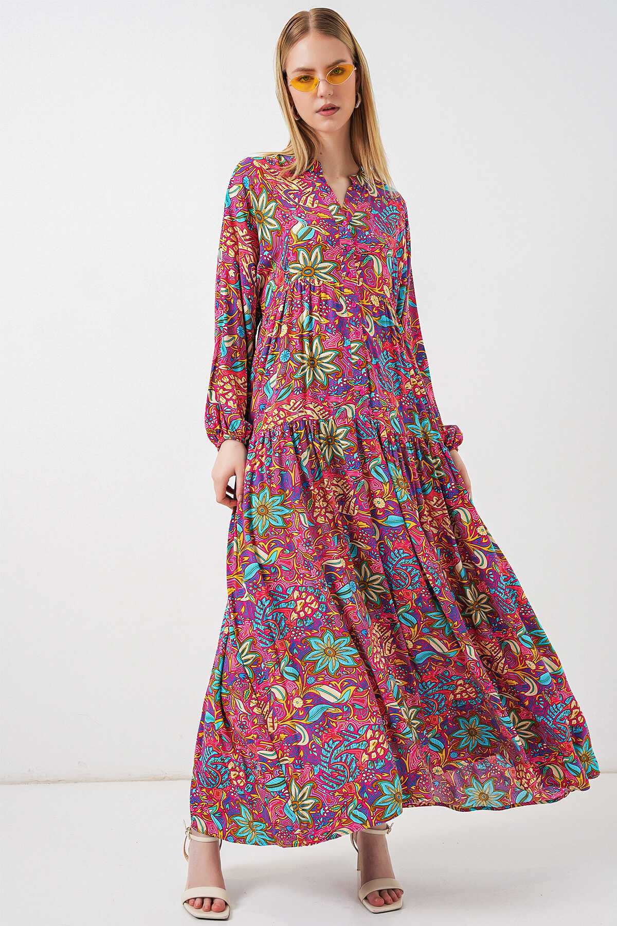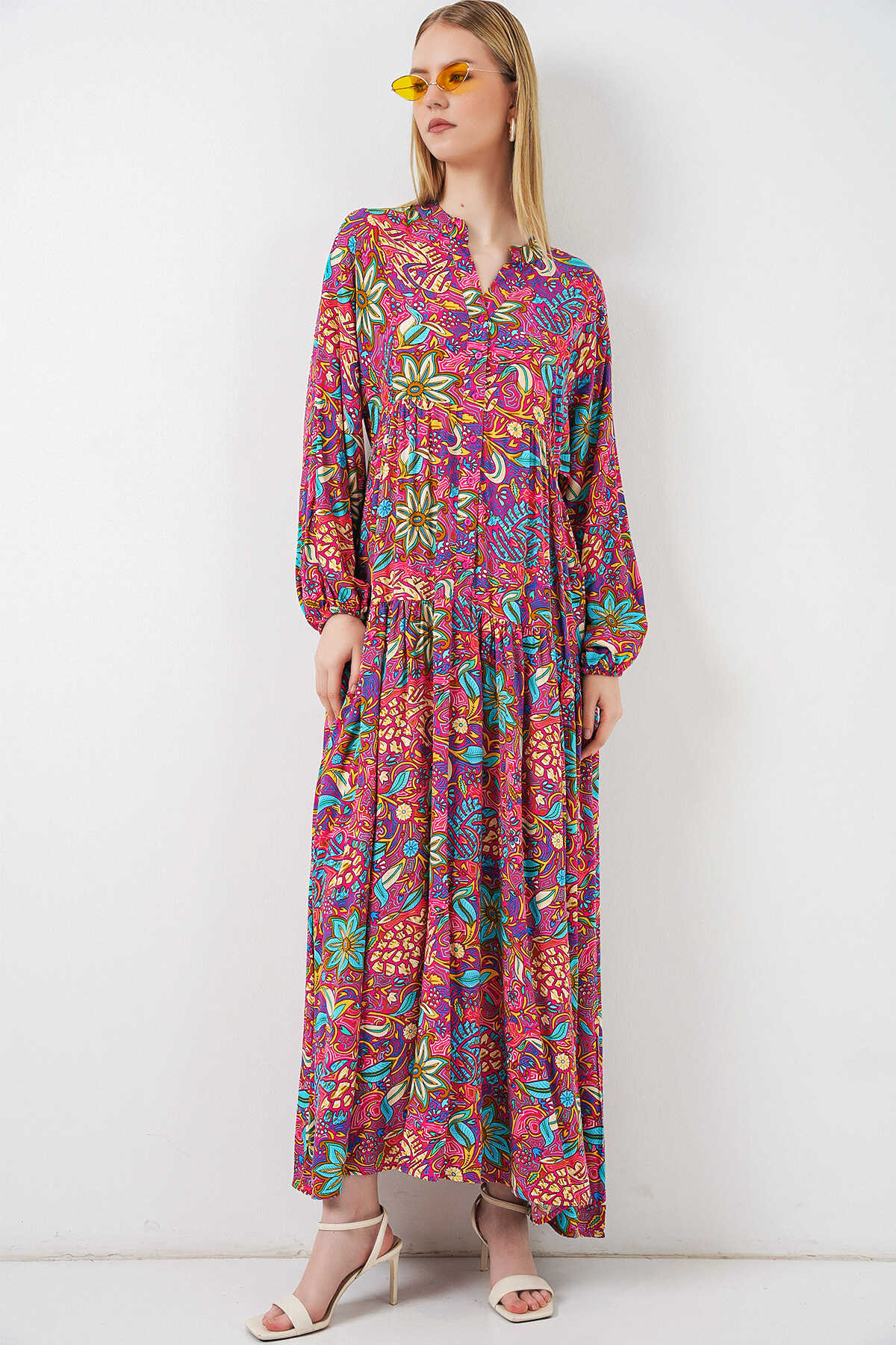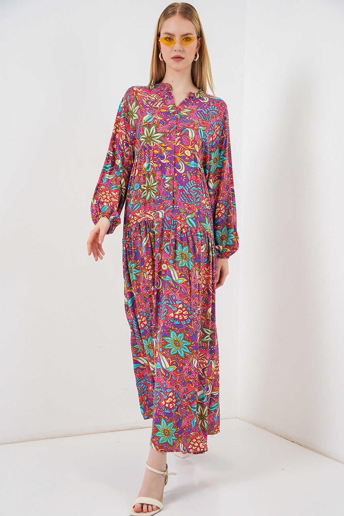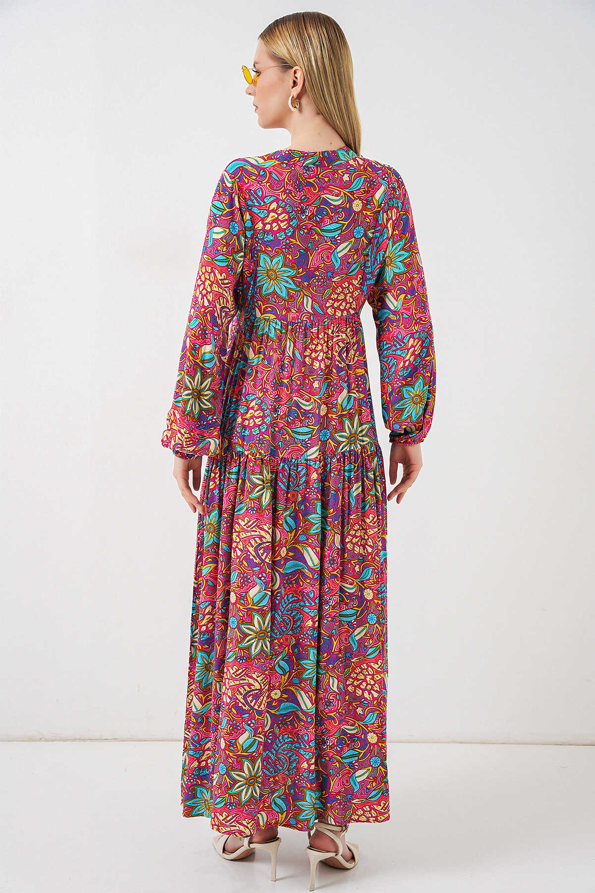 Kadın Desenli Uzun Tesettür Elbise 2585 - Çok Renkli - Kombin