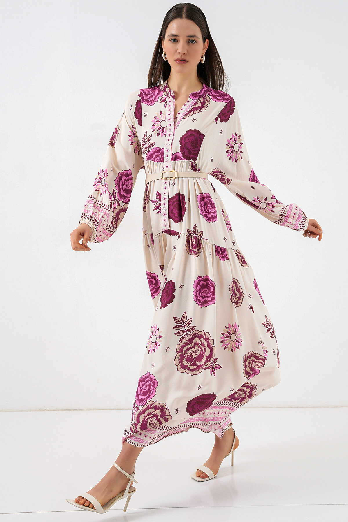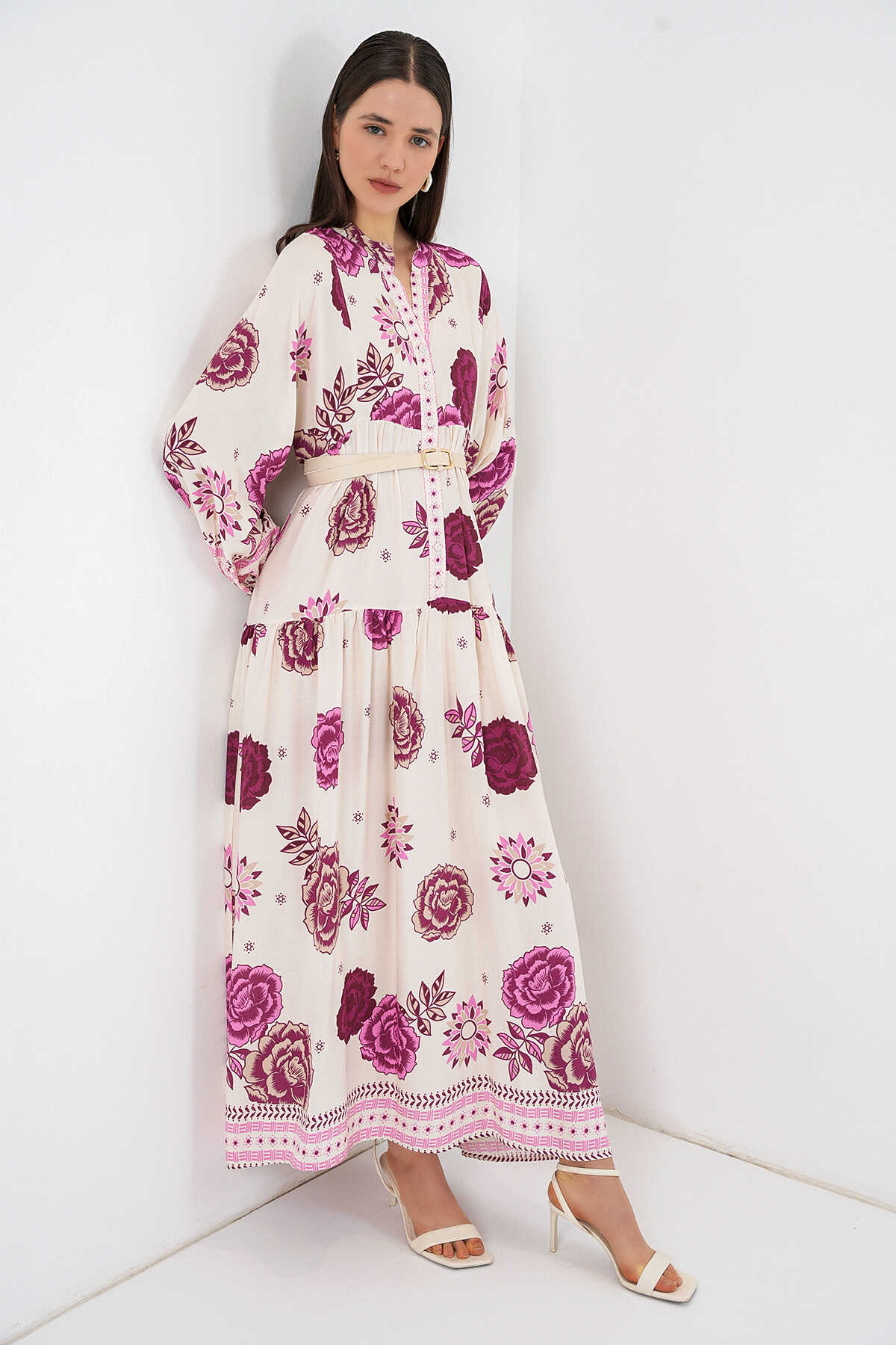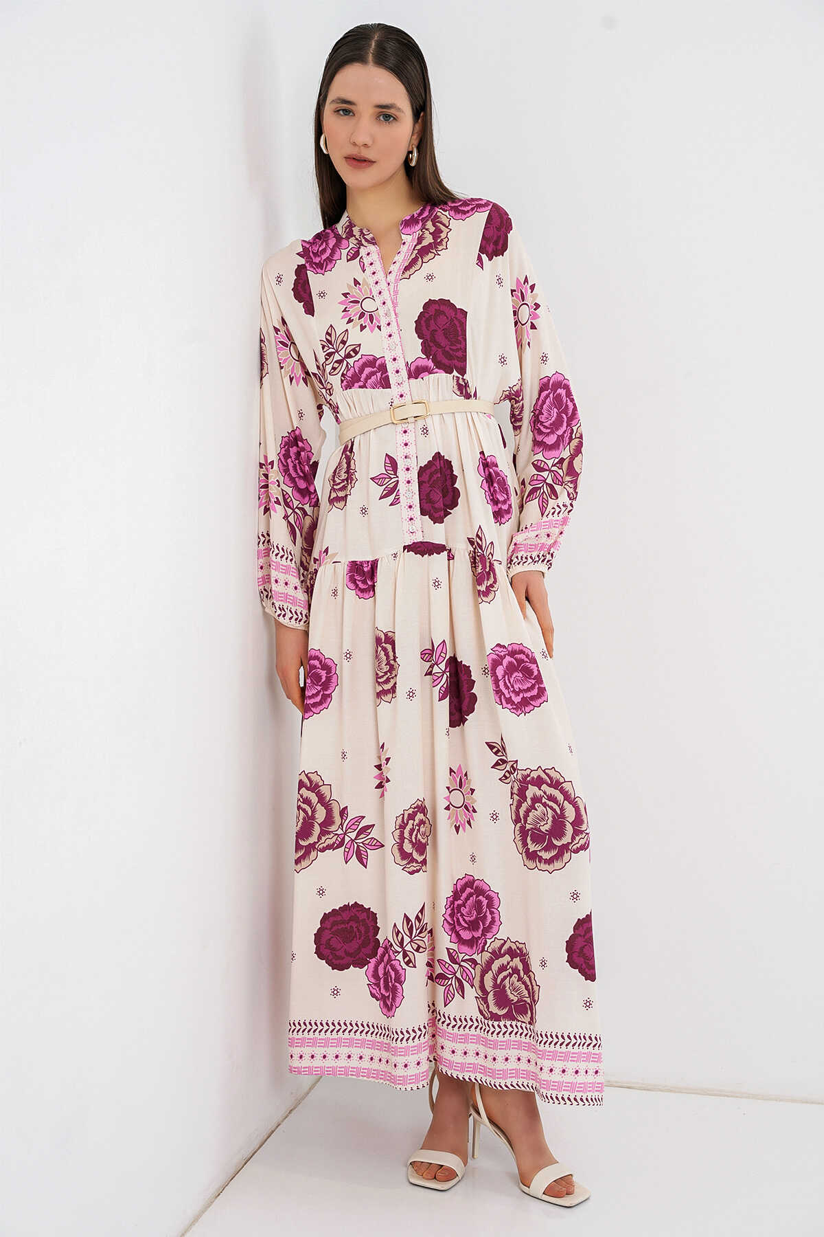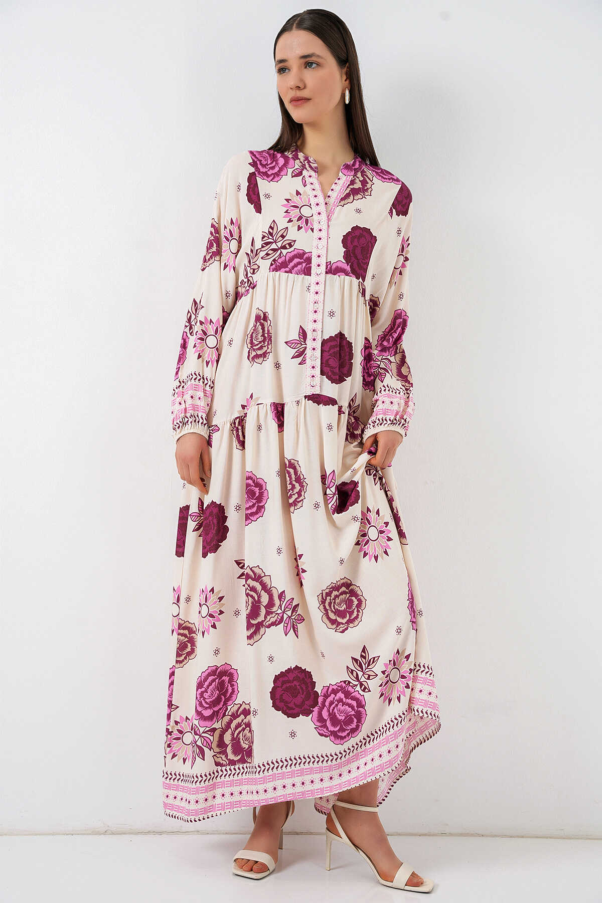 Kadın Desenli Uzun Tesettür Elbise 2585 - D. Fuşya - Kombin