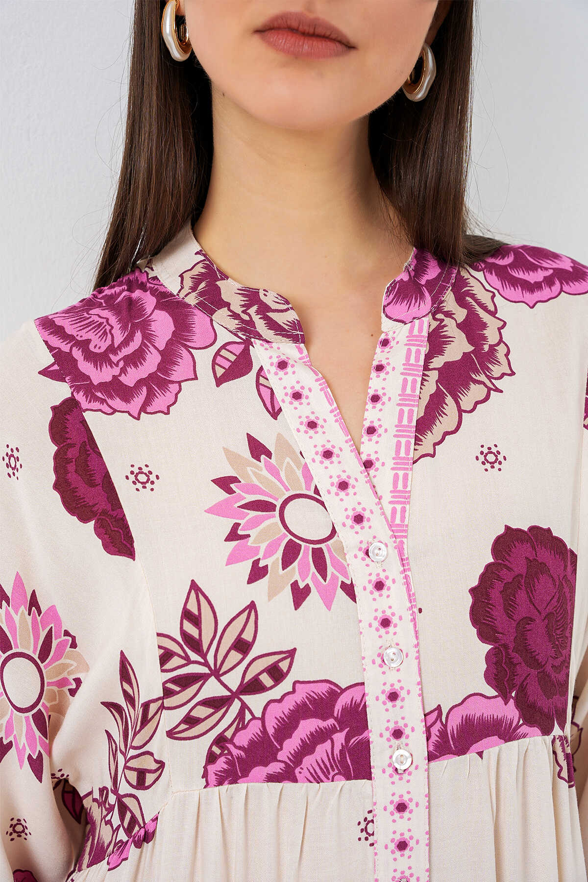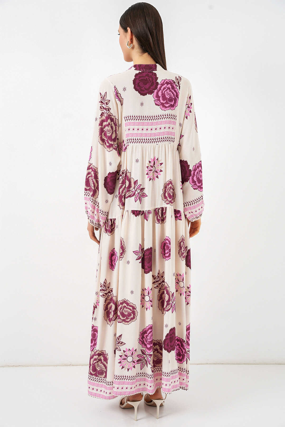 Kadın Desenli Uzun Tesettür Elbise 2585 - D. Fuşya