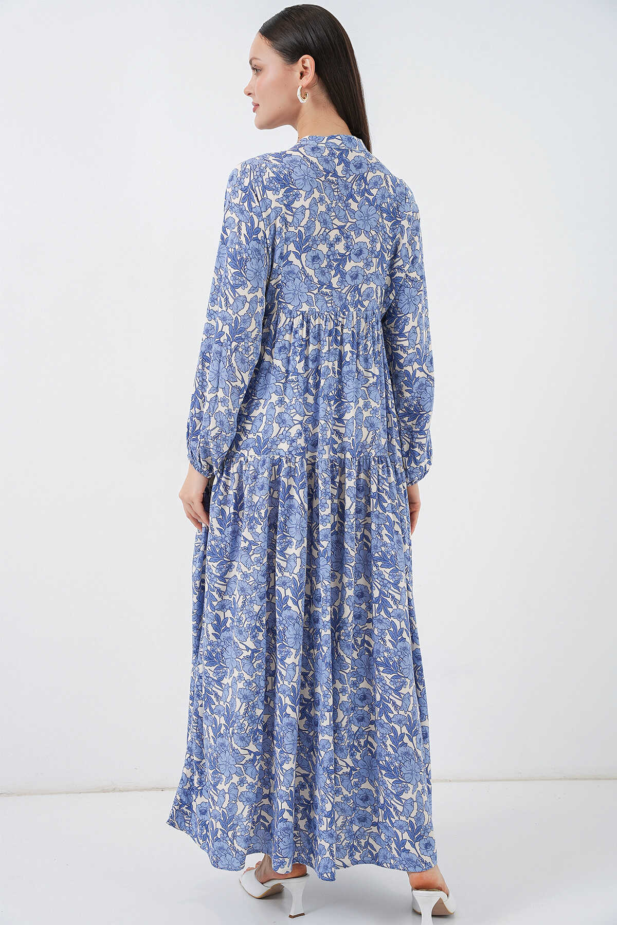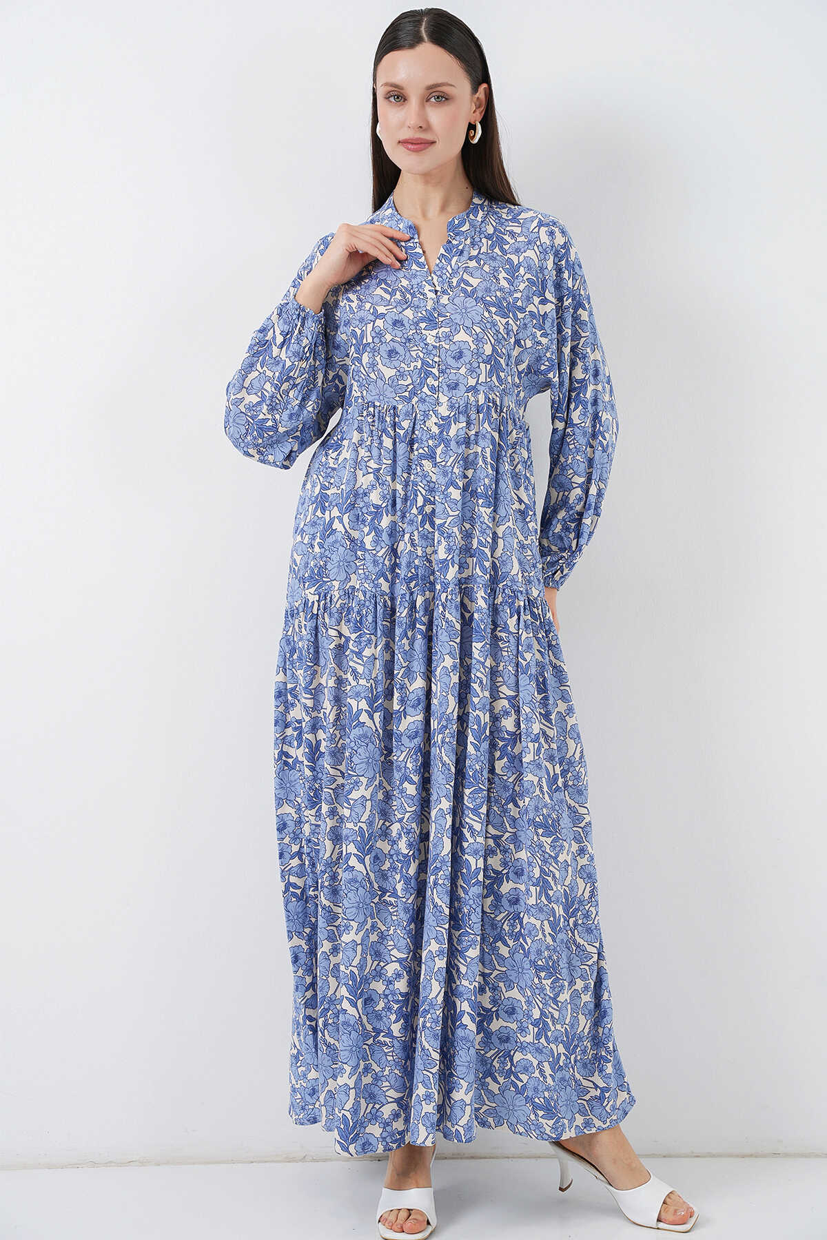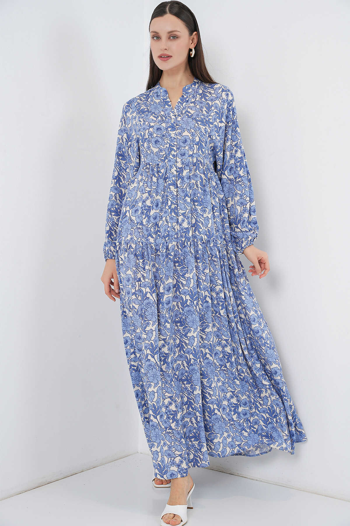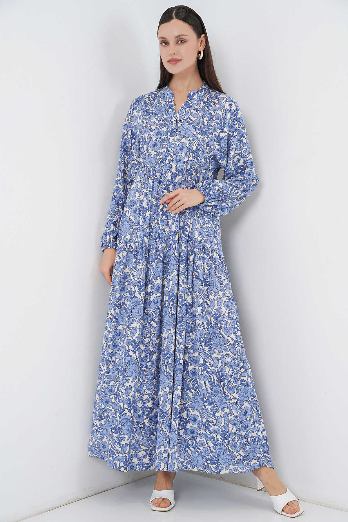 Kadın Desenli Uzun Tesettür Elbise 2585 - D. İndigo