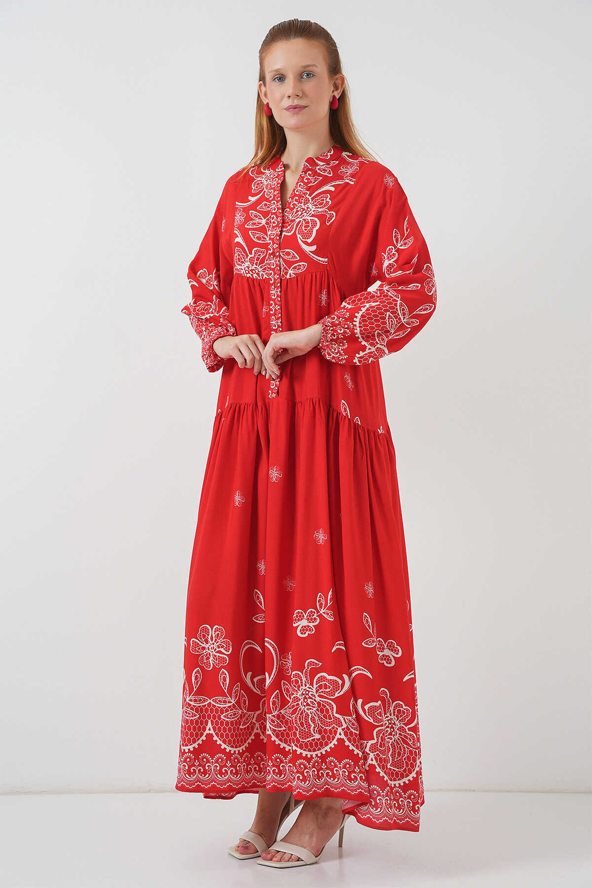 Kadın Desenli Uzun Tesettür Elbise 2585 - D.Kırmızı - Kombin