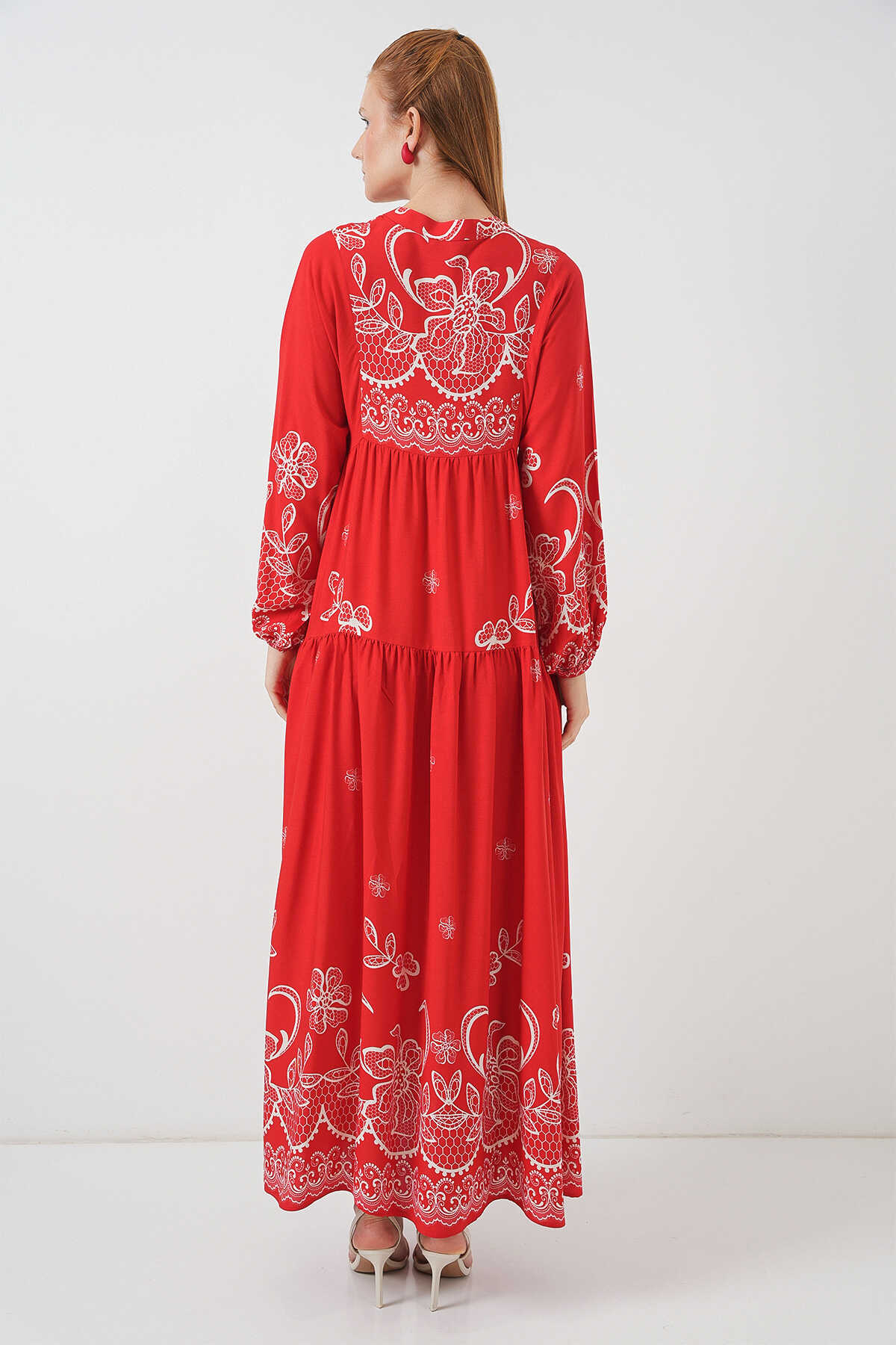 Kadın Desenli Uzun Tesettür Elbise 2585 - D.Kırmızı