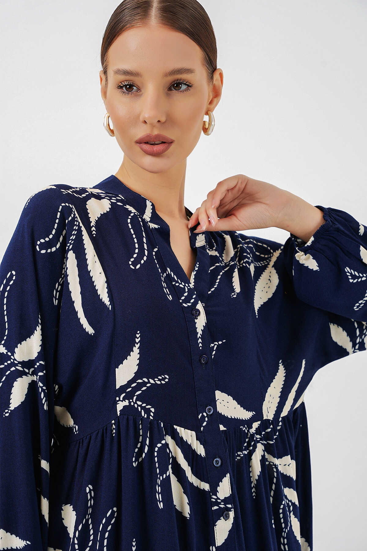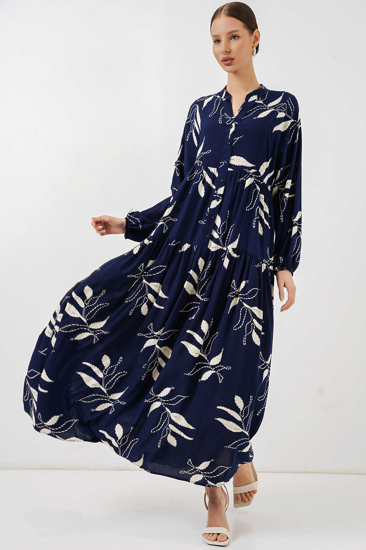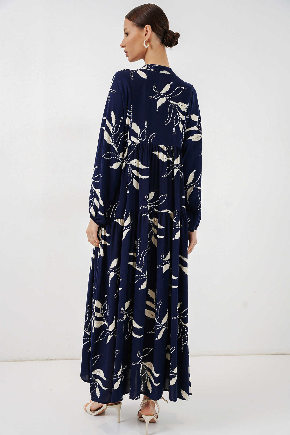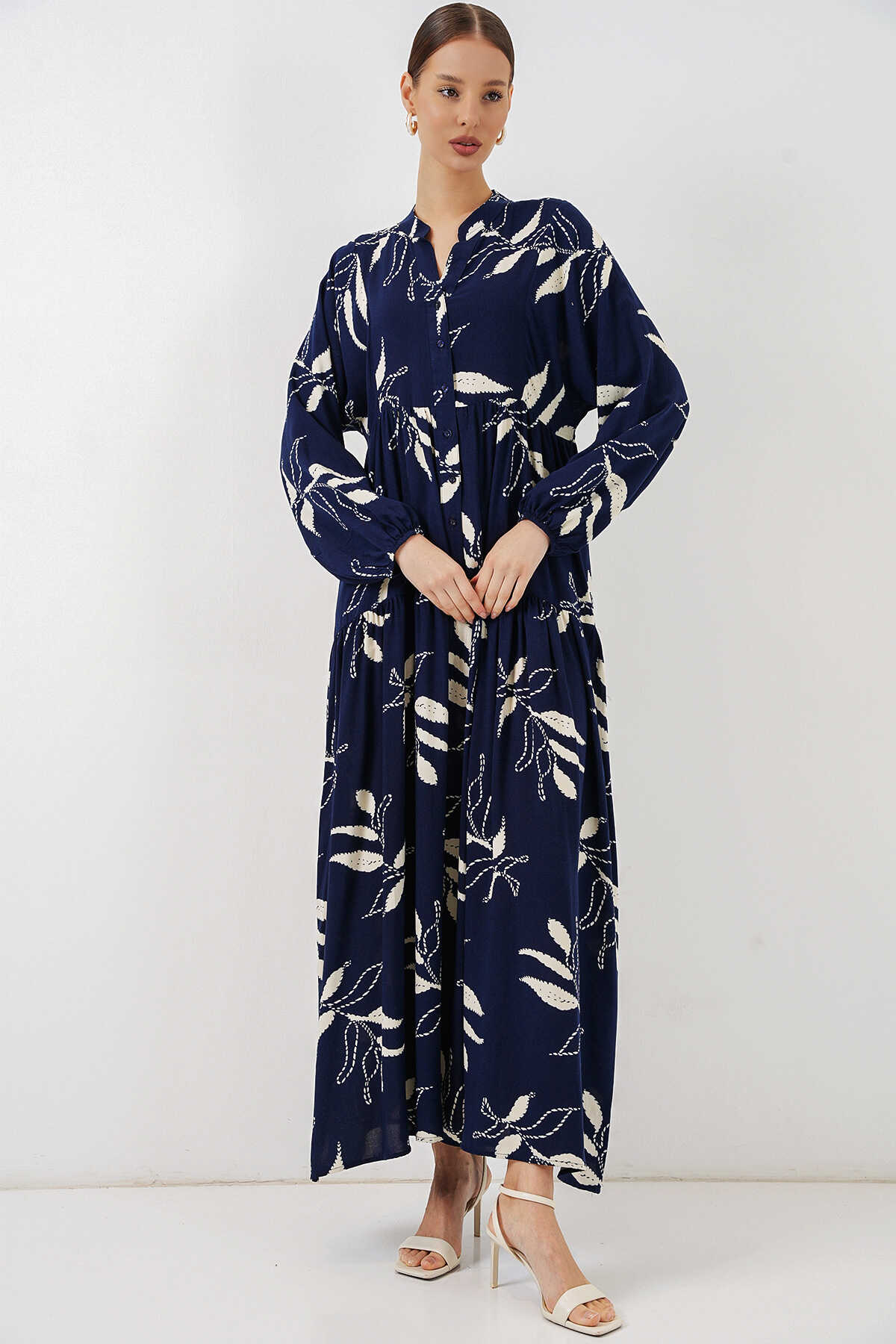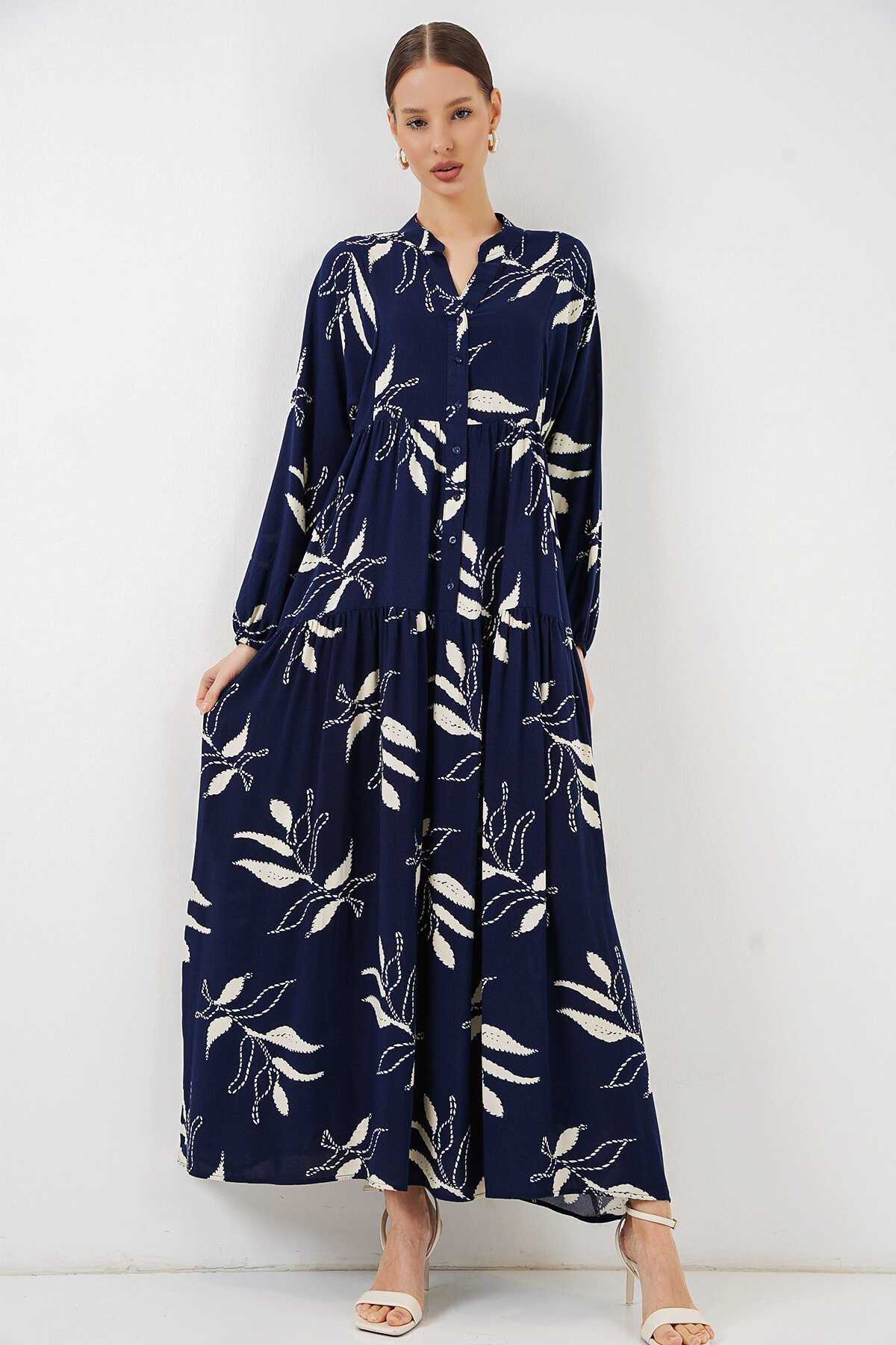 Kadın Desenli Uzun Tesettür Elbise 2585 - D.Lacivert - Kombin