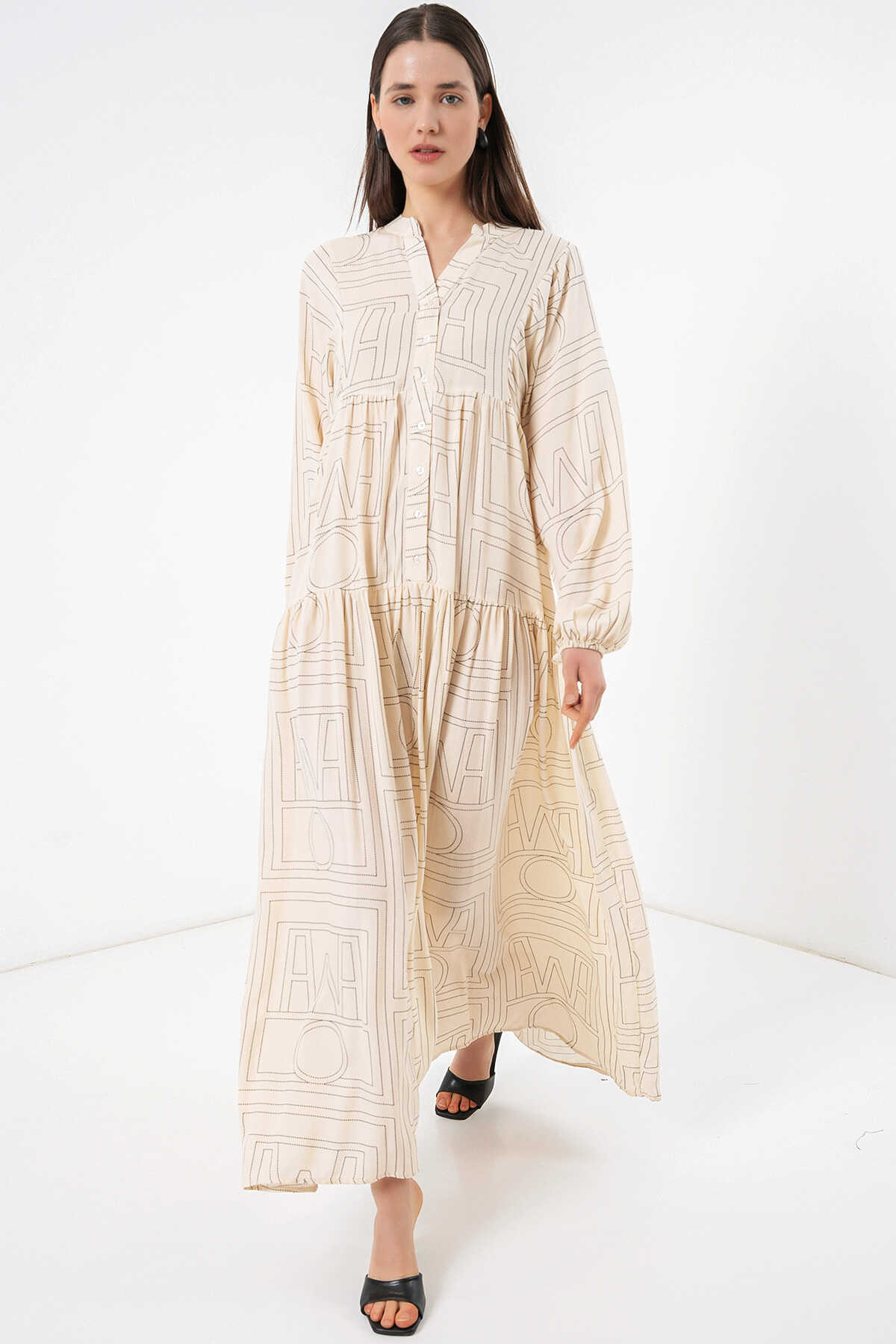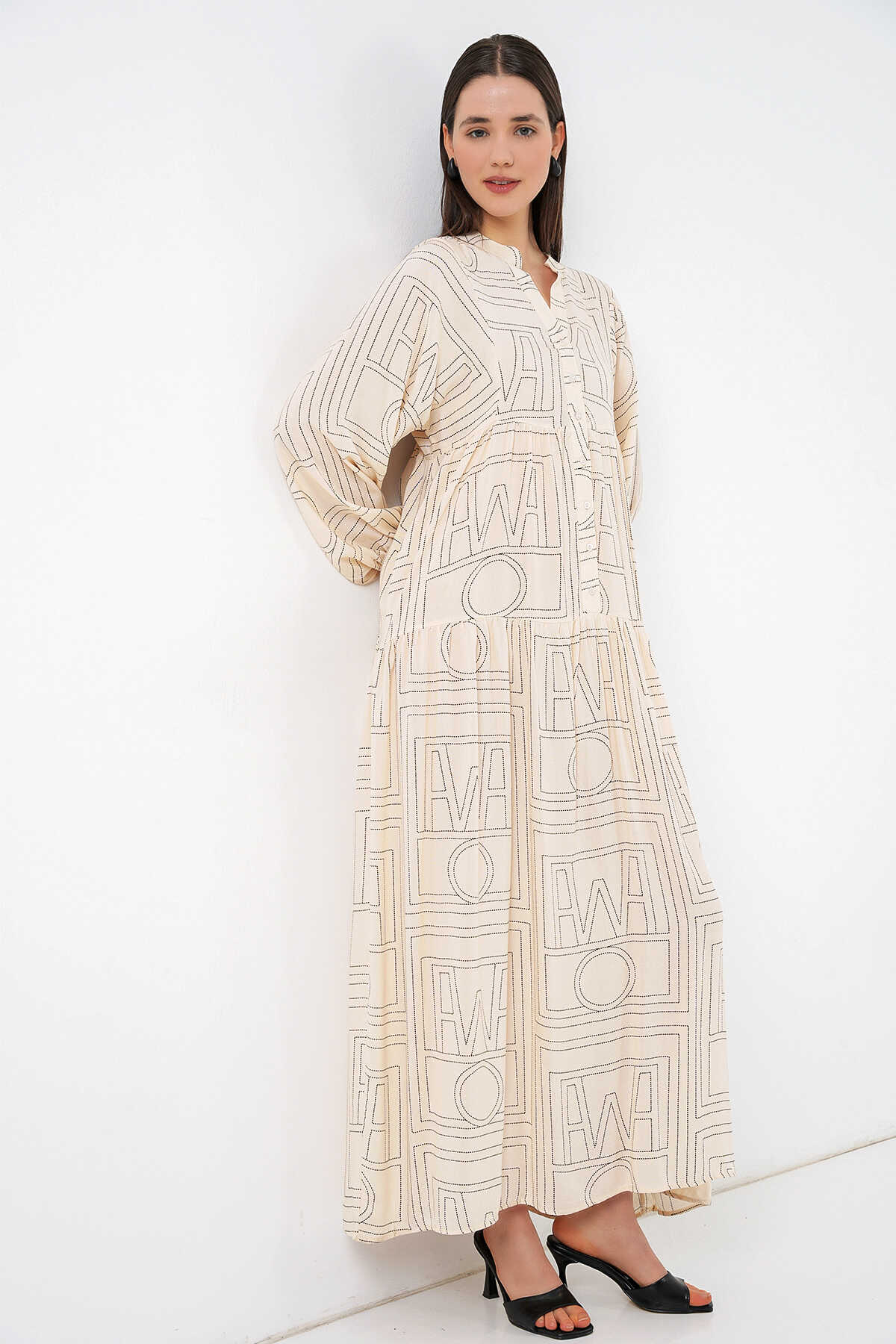 Kadın Desenli Uzun Tesettür Elbise 2585 - Düz Krem - Kombin