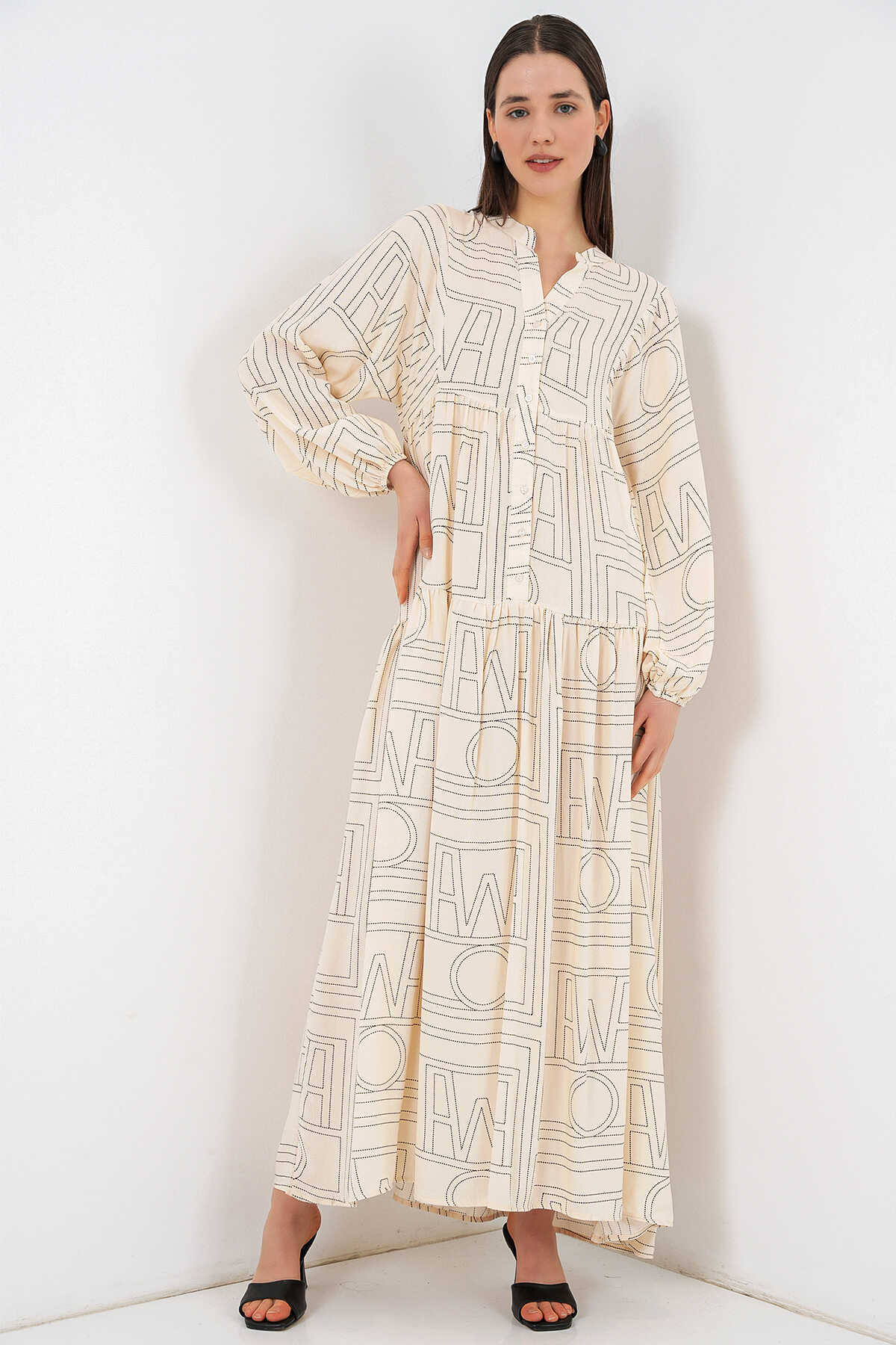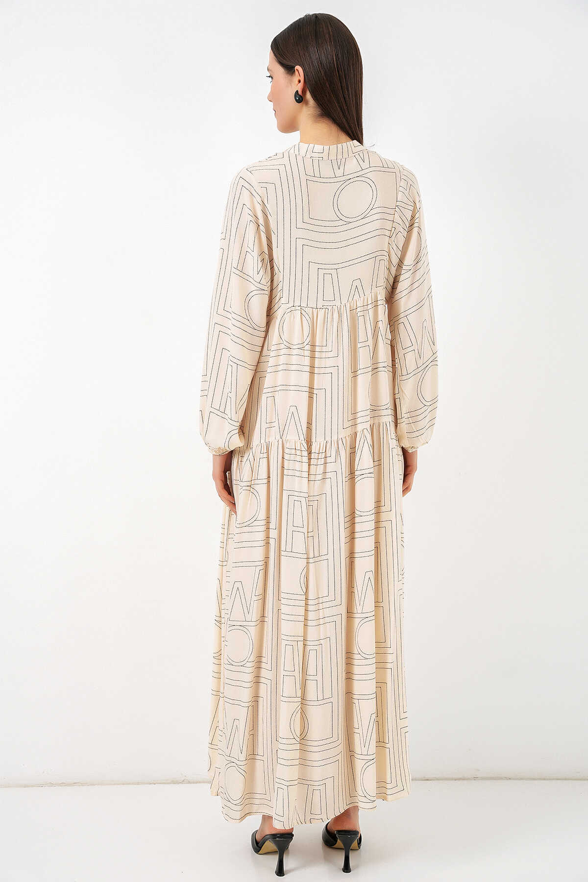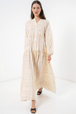 Kadın Desenli Uzun Tesettür Elbise 2585 - Düz Krem