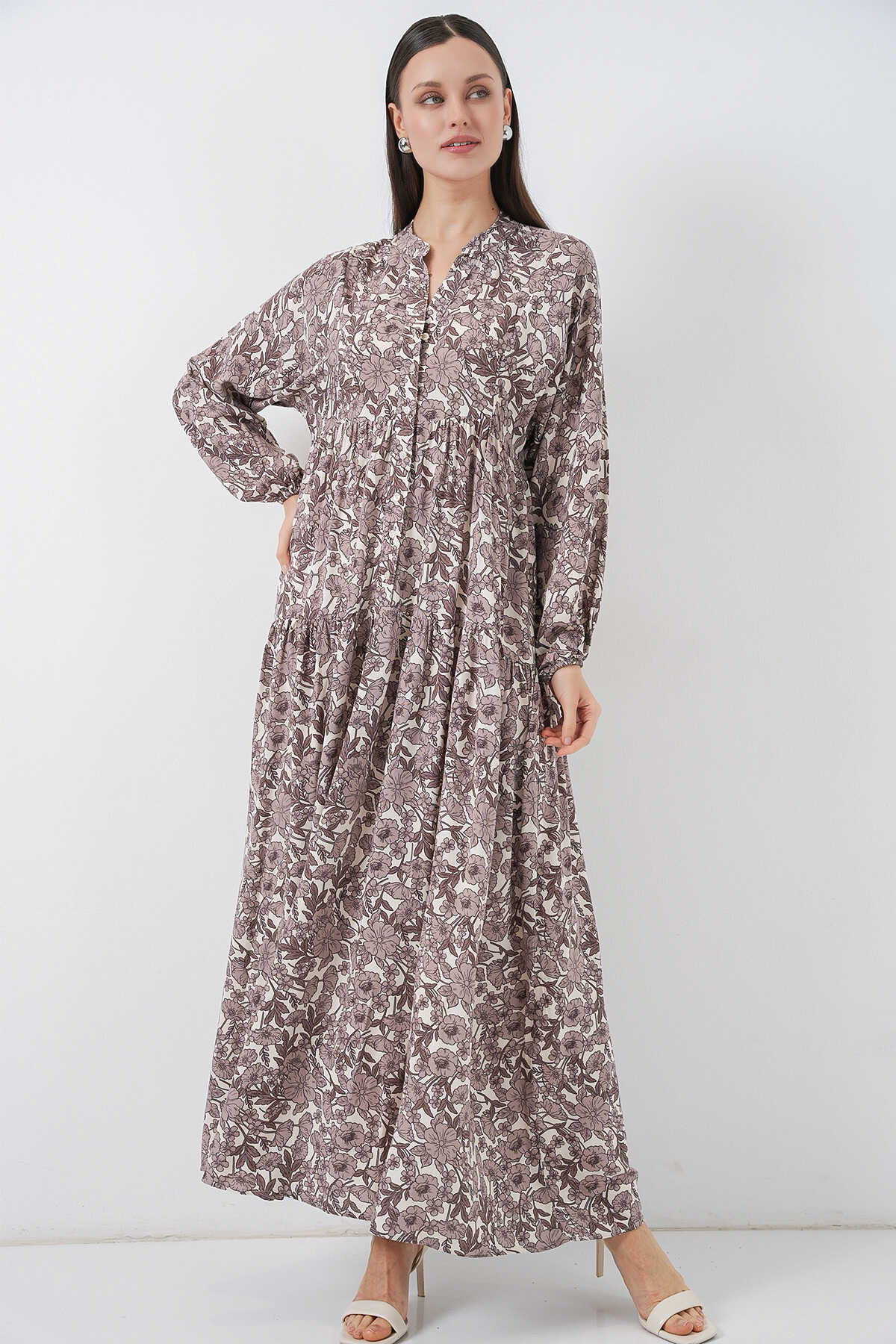 Kadın Desenli Uzun Tesettür Elbise 2585 - E. Kahve - Kombin