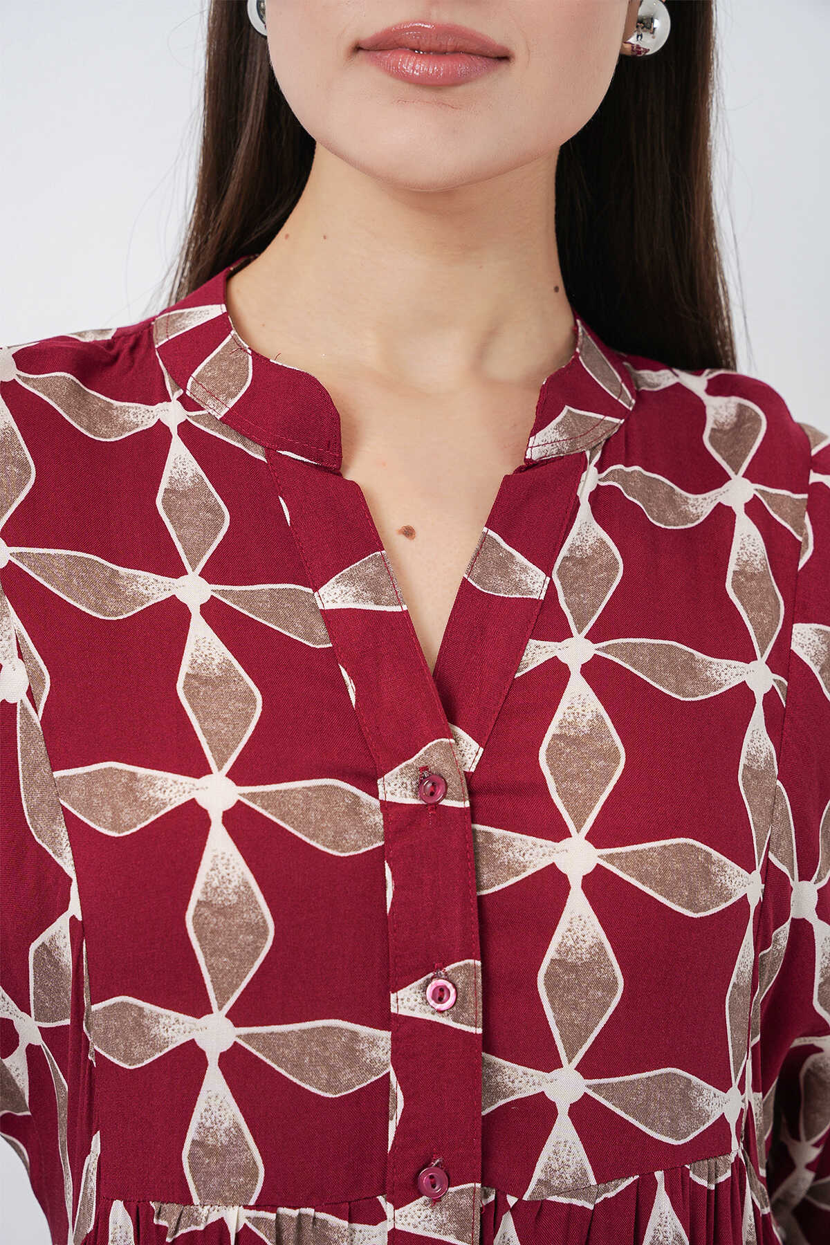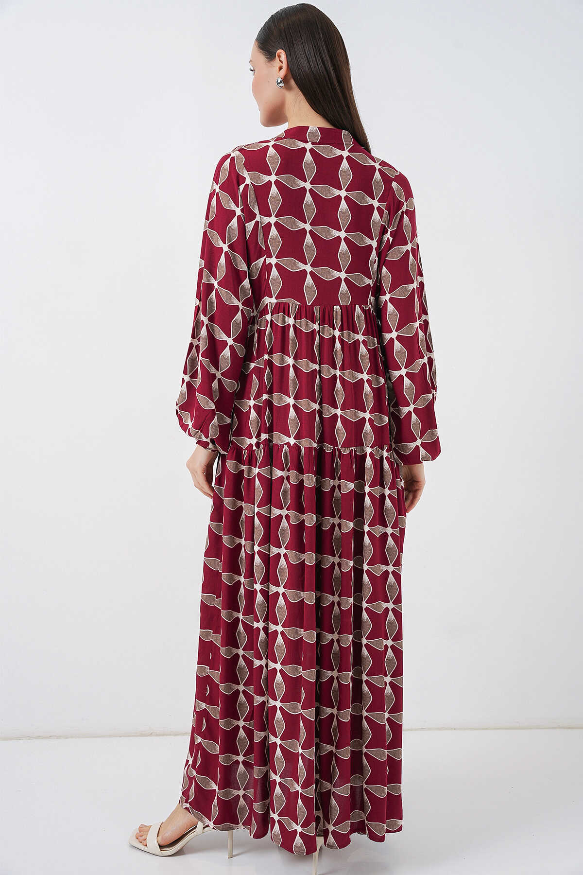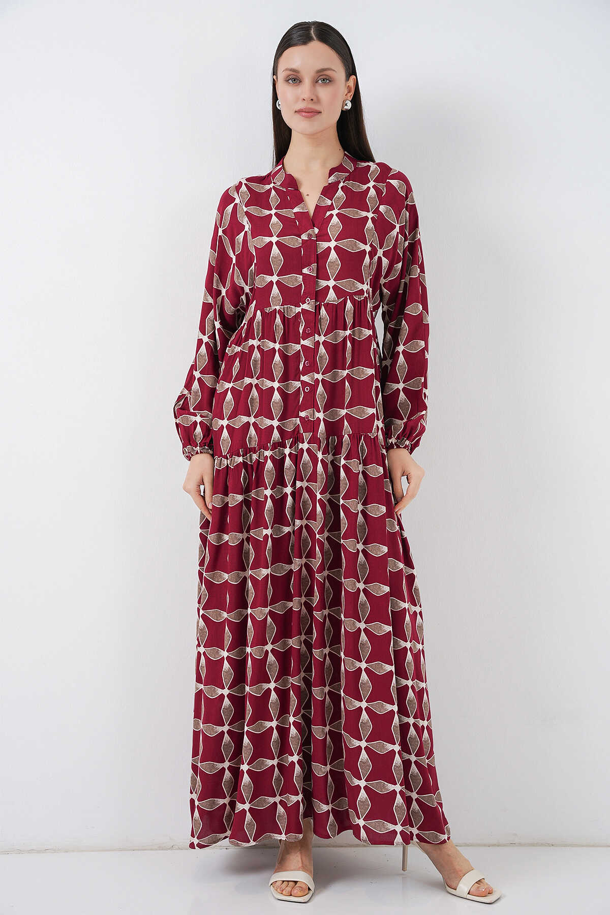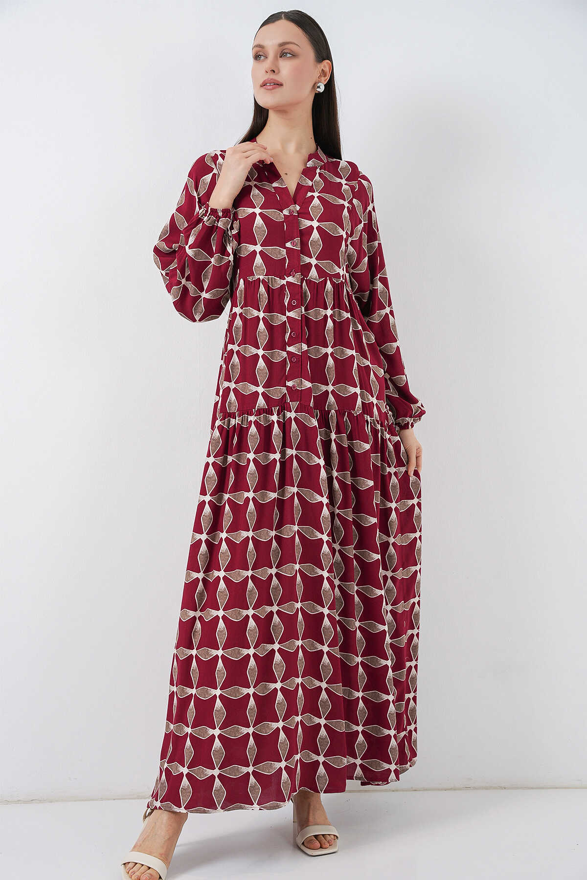 Kadın Desenli Uzun Tesettür Elbise 2585 - F.Bordo - Kombin