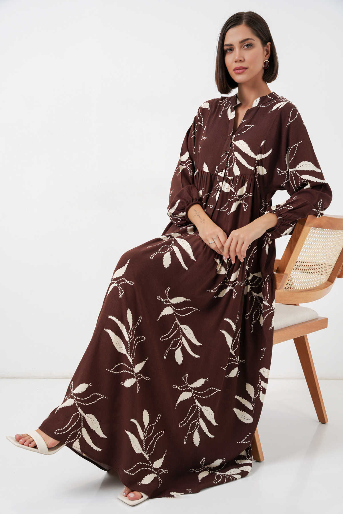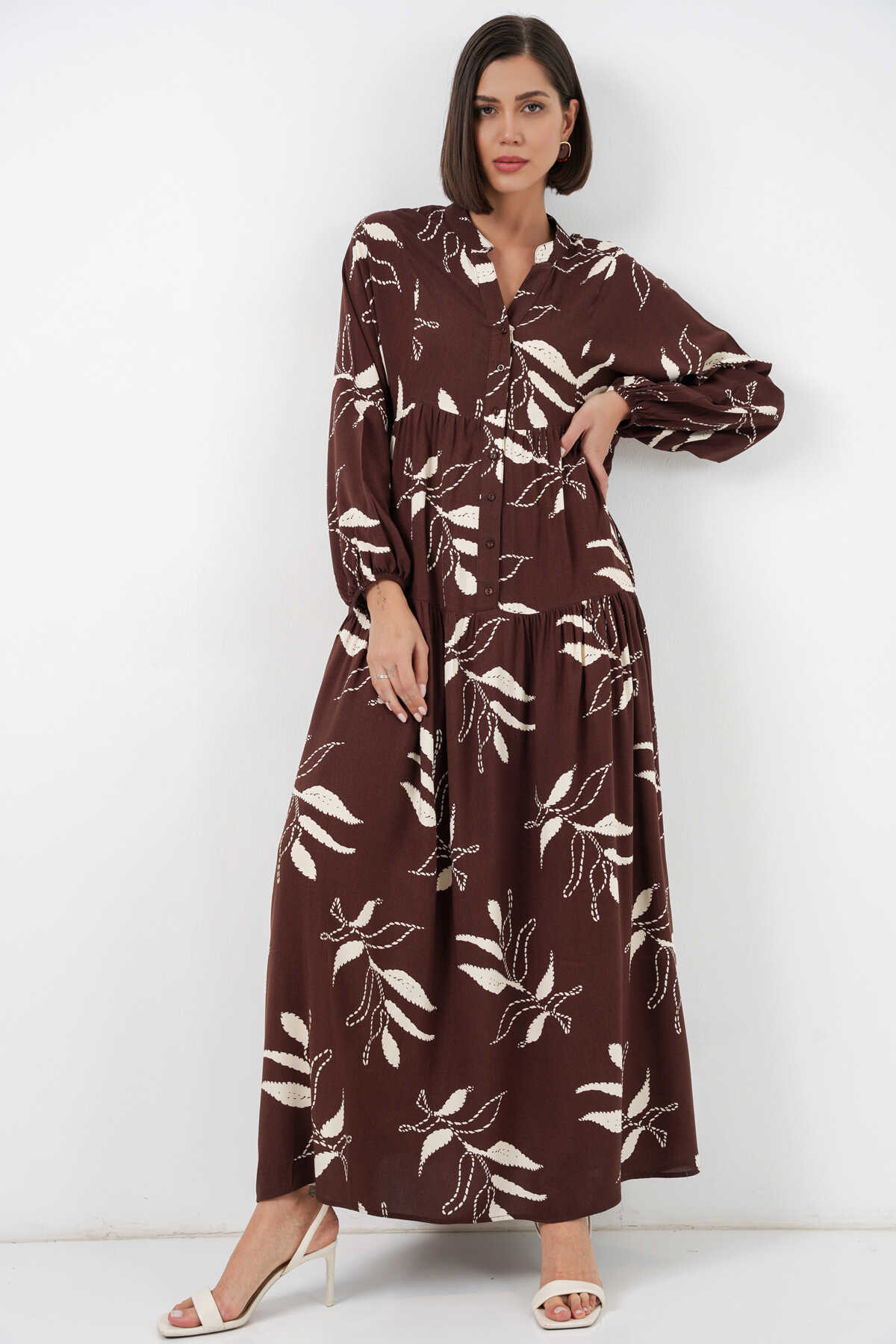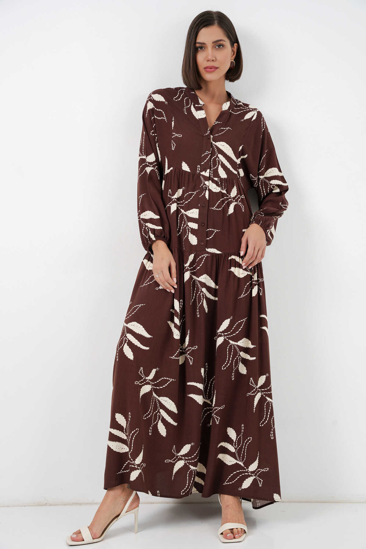 Kadın Desenli Uzun Tesettür Elbise 2585 - F.KAHVE - Kombin