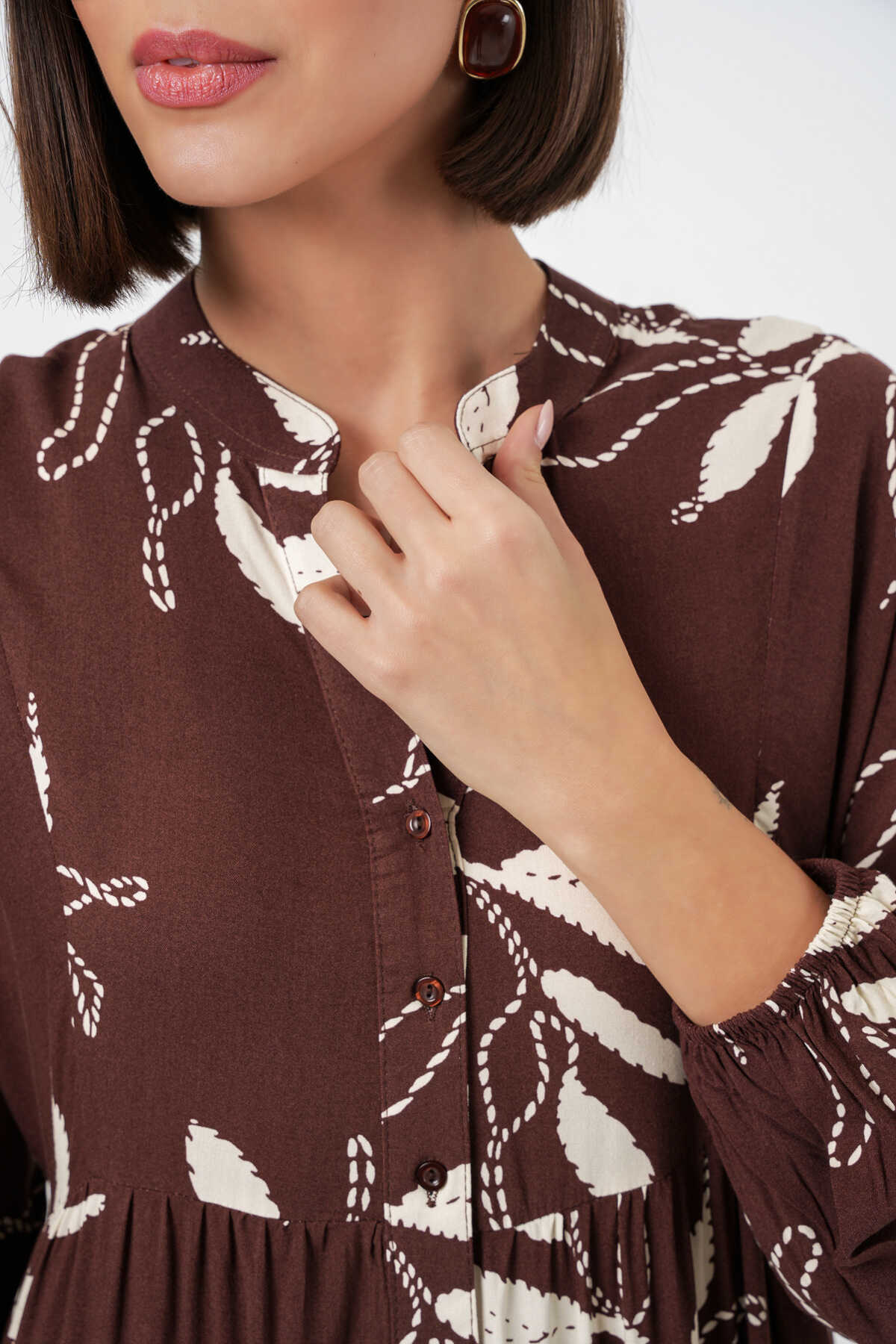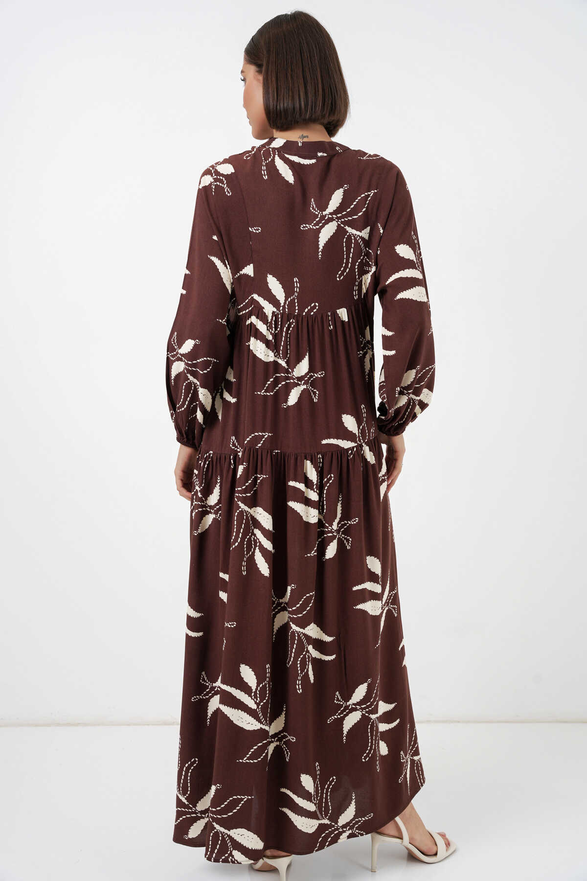 Kadın Desenli Uzun Tesettür Elbise 2585 - F.KAHVE