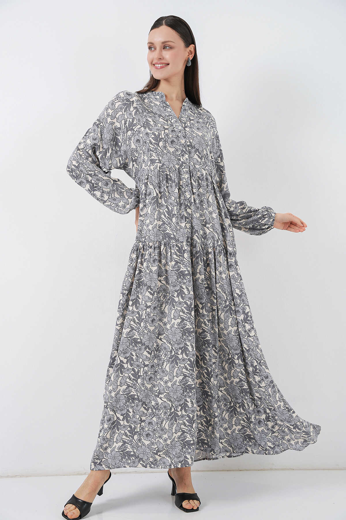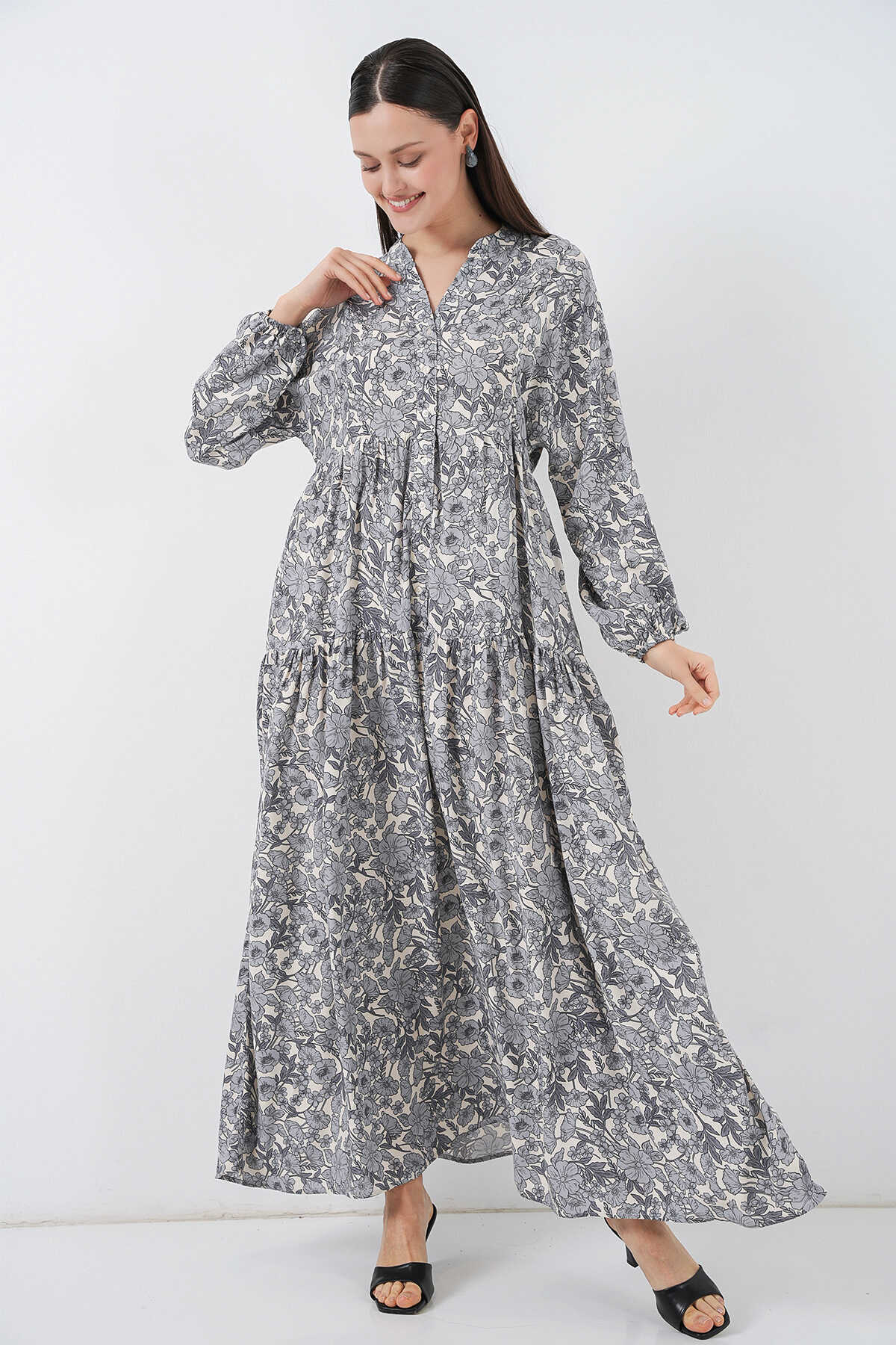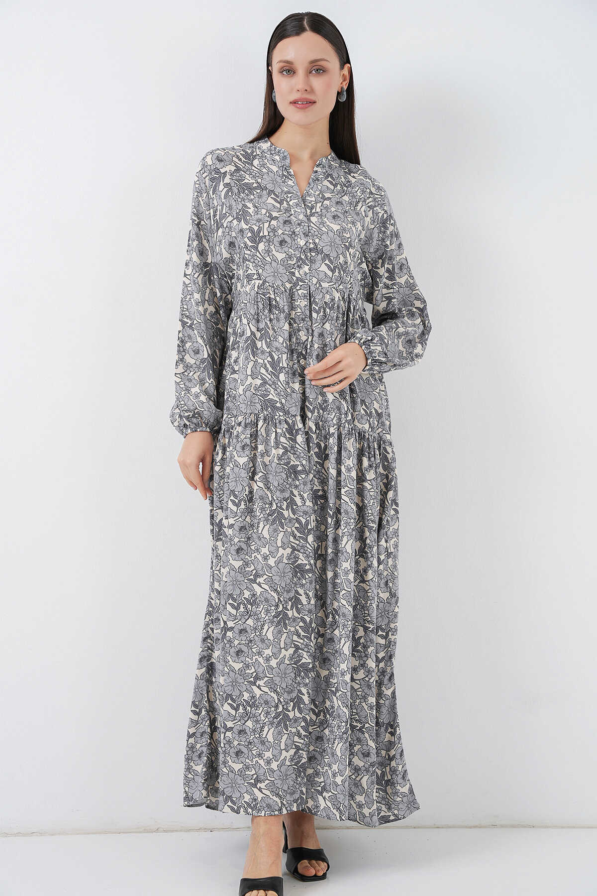 Kadın Desenli Uzun Tesettür Elbise 2585 - Gri - Kombin
