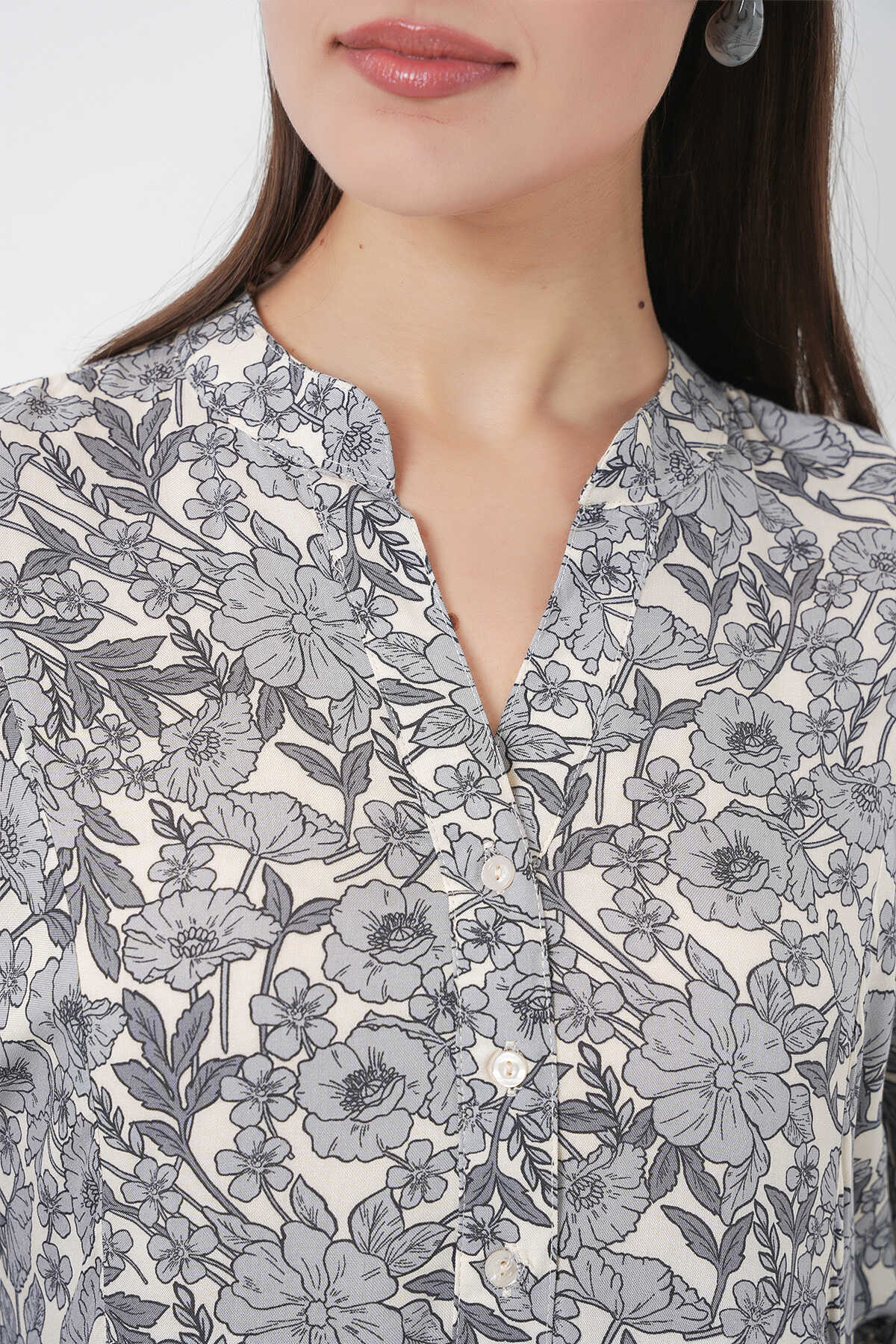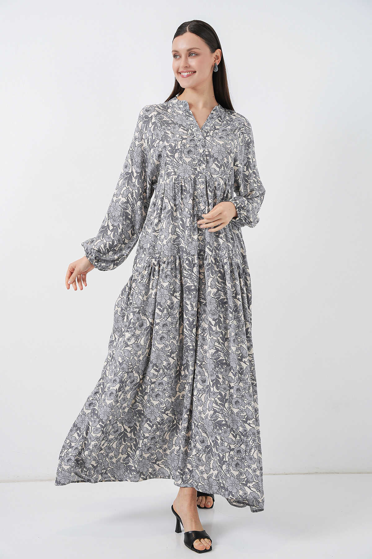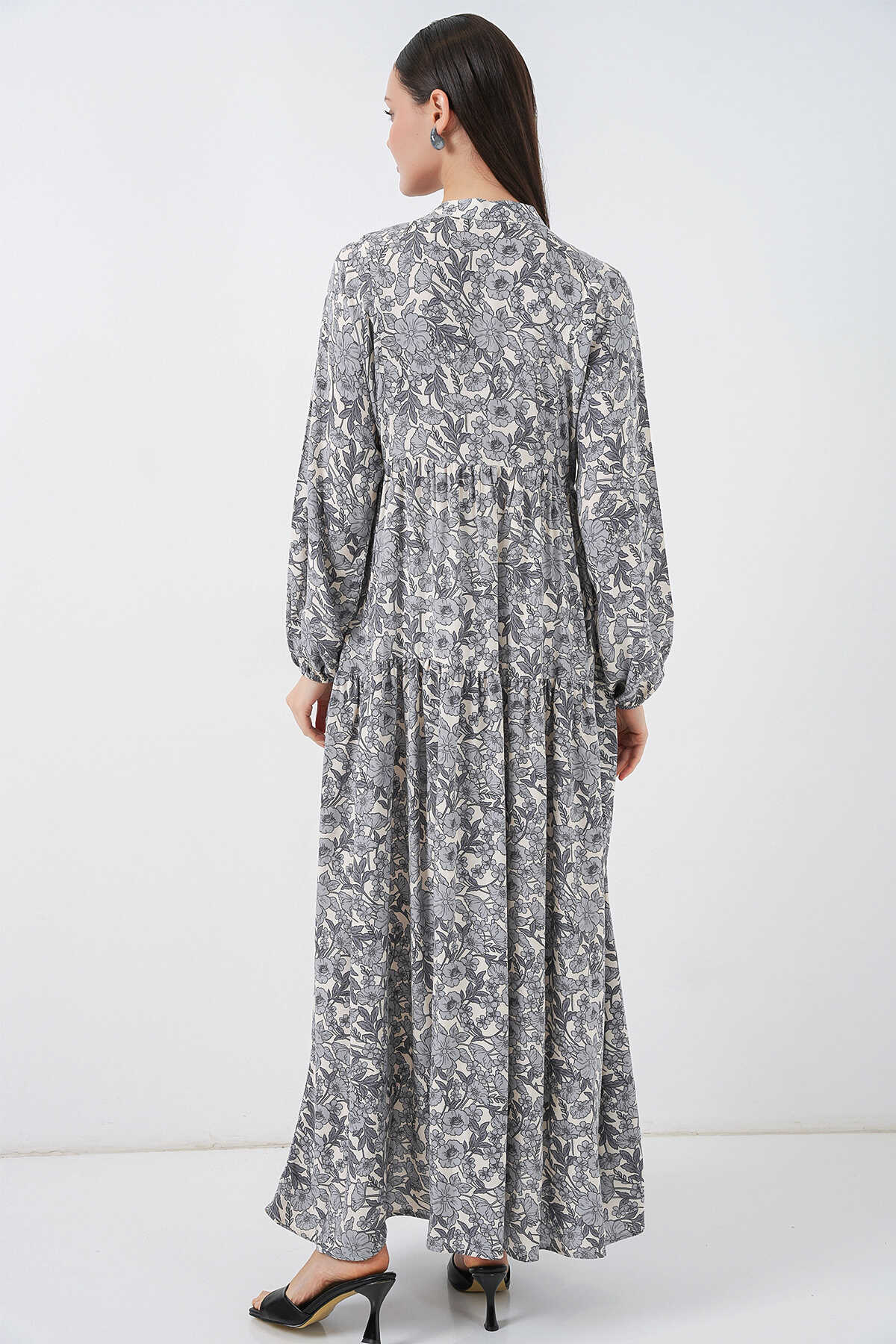 Kadın Desenli Uzun Tesettür Elbise 2585 - Gri - Kombin