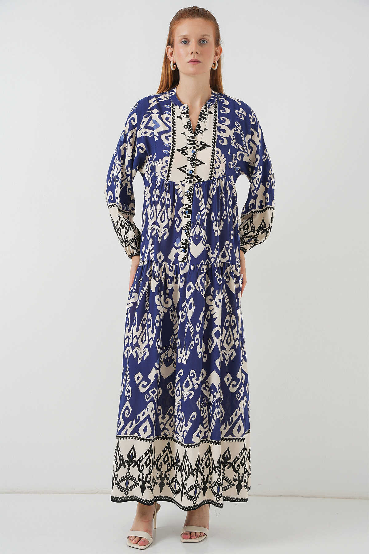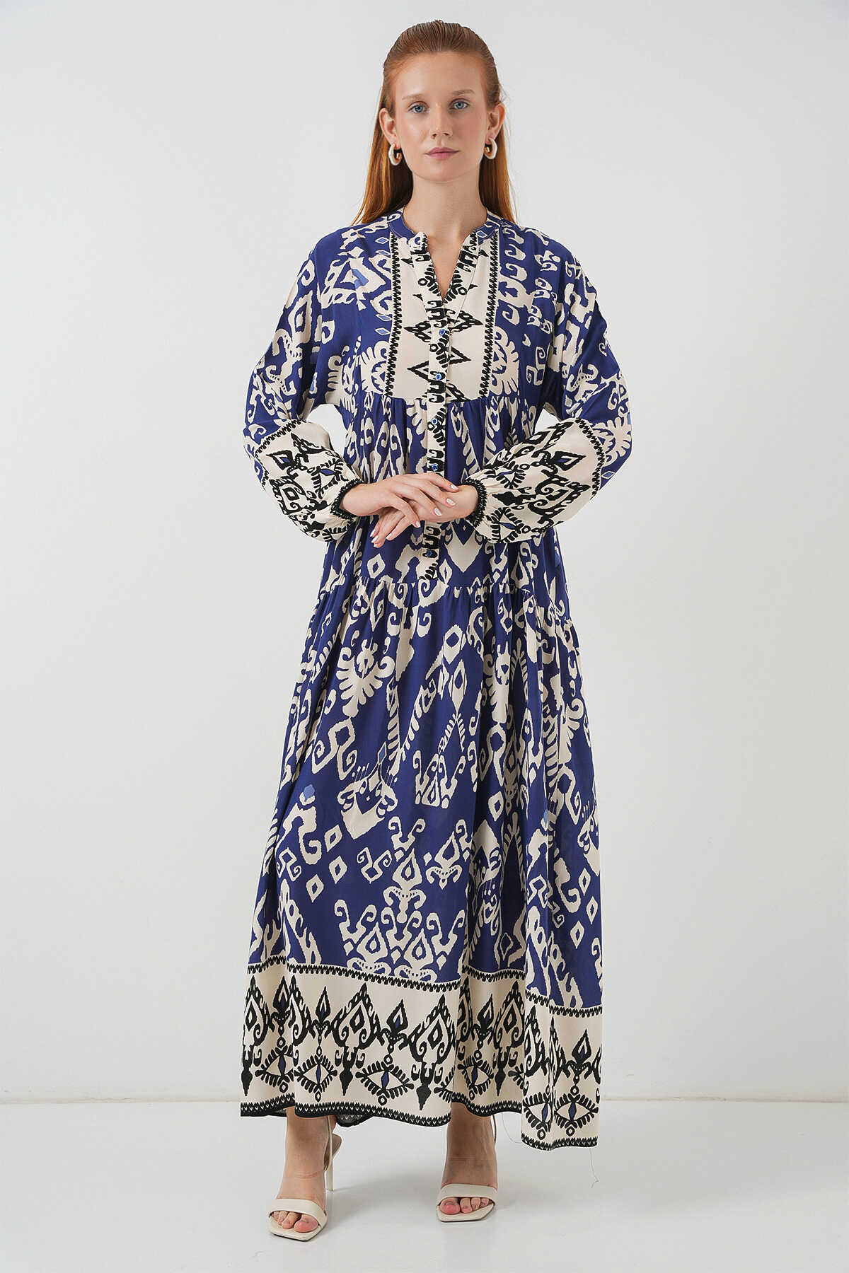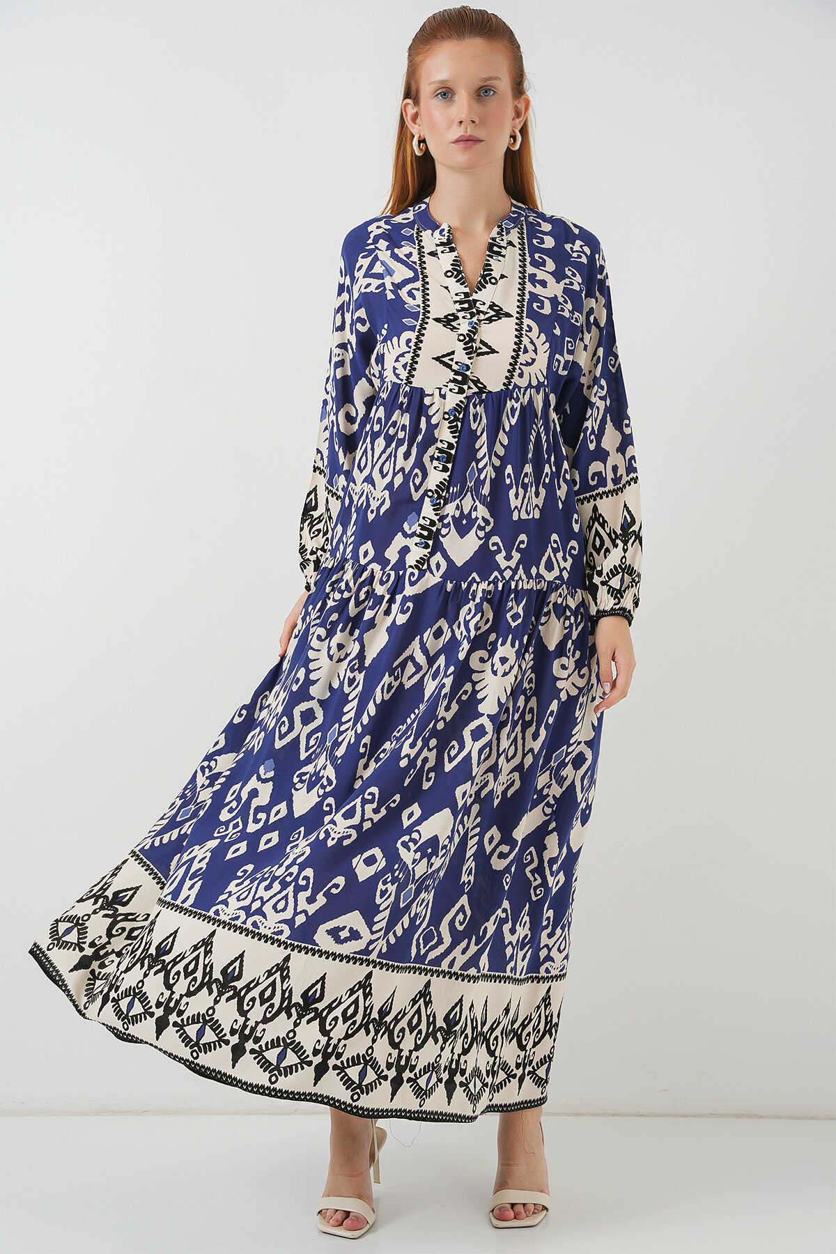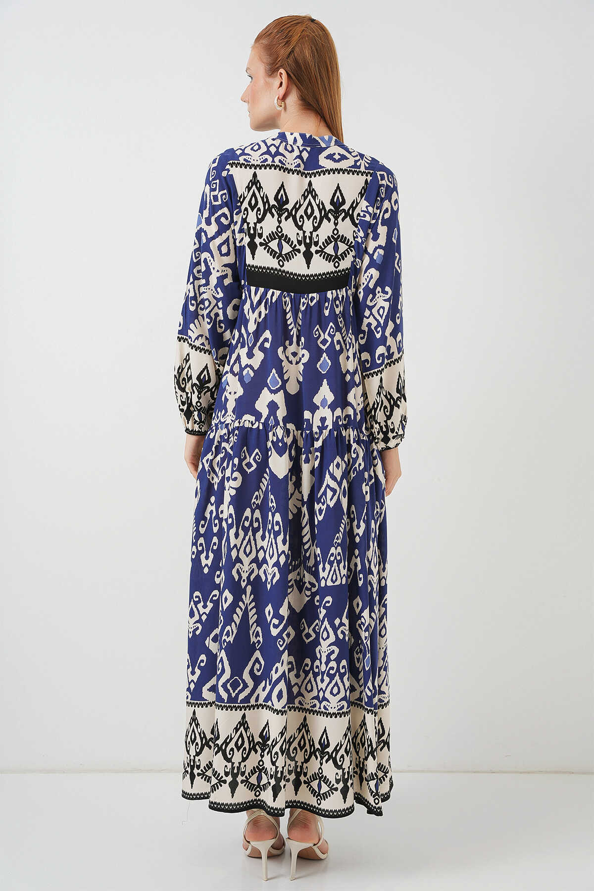 Kadın Desenli Uzun Tesettür Elbise 2585 - İndigo - Kombin